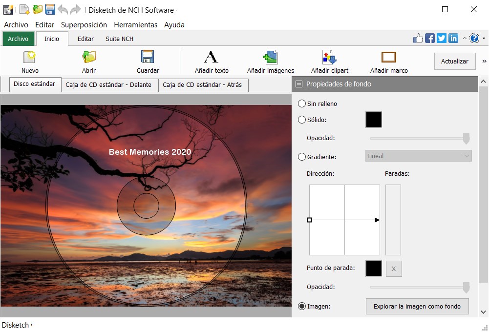 Cree etiquetas de discos CD, DVD o Blu-RayImporte sus propias fotos para crear fondos y carátulas de discos personalizadasElija entre una variedad de estilos de textoFormatee, cambie el tamaño y alinee fácilmente su textoImprima o exporte rápidamente diseños de etiquetasHaga coincidir la portada con sus discos simplemente cambiando entre vistas