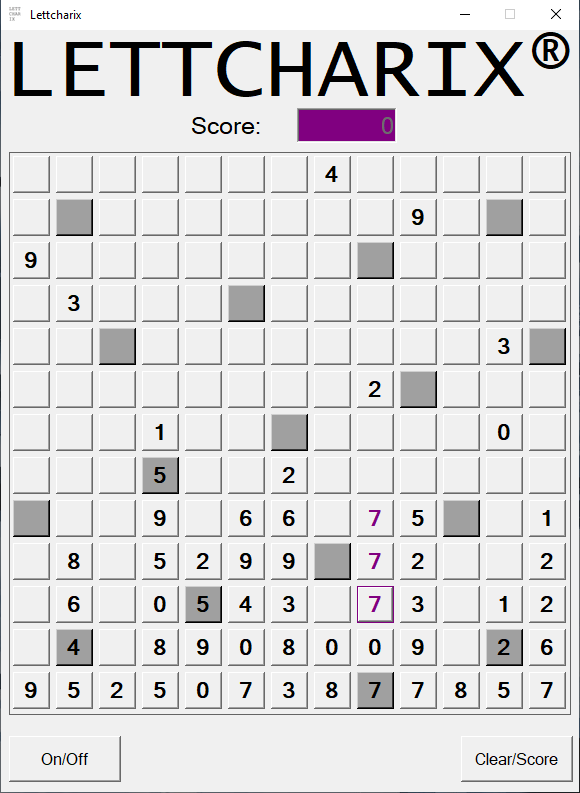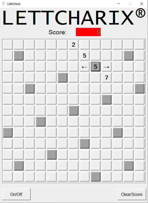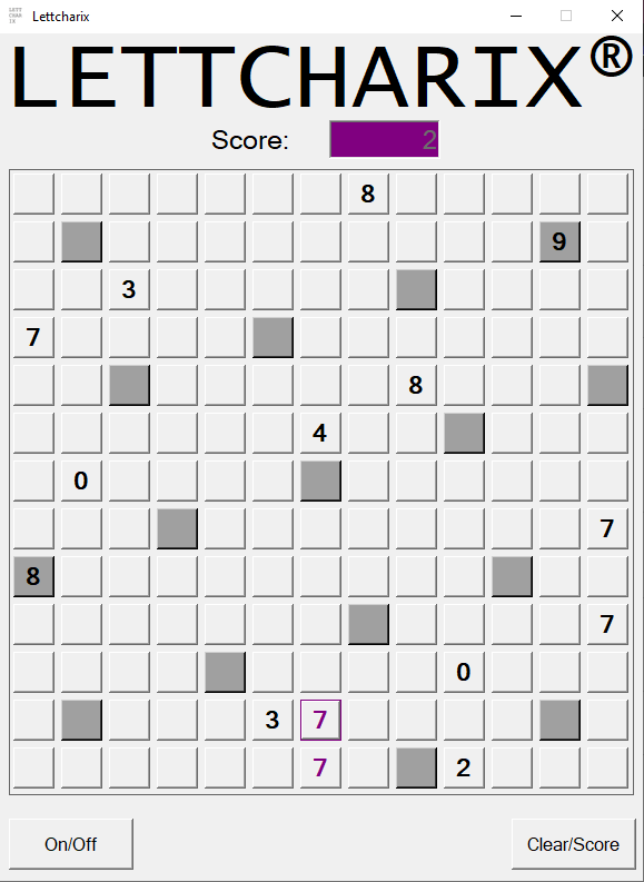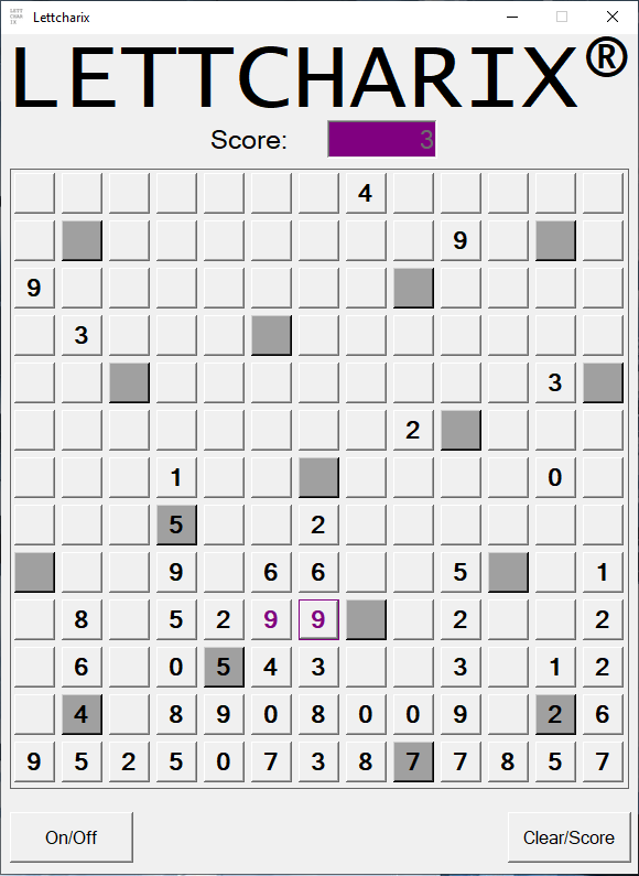 Click On/Off to start the game - Note the score indicator is indicating status green for game in progress.Click any falling number to move it sideways one tile left or right to align horizontally or vertically any matching characters towards the bottom of the screen. Click Clear/Score to pause the game and enter the scoring mode - Note the score indicator is indicating status purple for scoring mode. Select any continuous horizontal or vertical alignment of identical numbers and click Clear/Score again to clear them off the board and score points. Note the score indicator is indicating status red for game paused - Click On/Off again to unpause the game and enter back into the character move mode. Rinse and repeat !