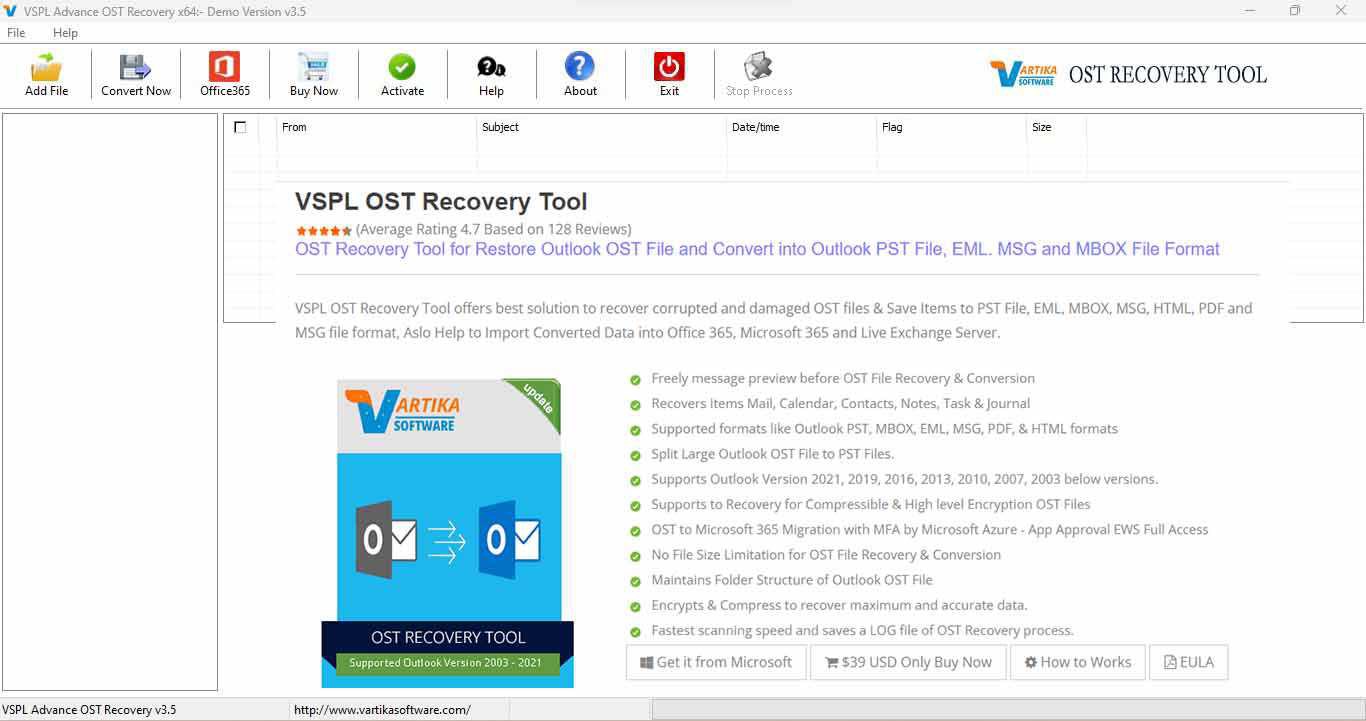 Supports Outlook Version 2021, 2019, 2016, 2013, 2010, 2007, 2003 below versions.Supports to Recovery for Compressible & High level Encryption OST FilesSupported formats like Outlook PST, MBOX, EML, MSG, PDF, & HTML formatsFreely message preview before OST File Recovery & Conversion