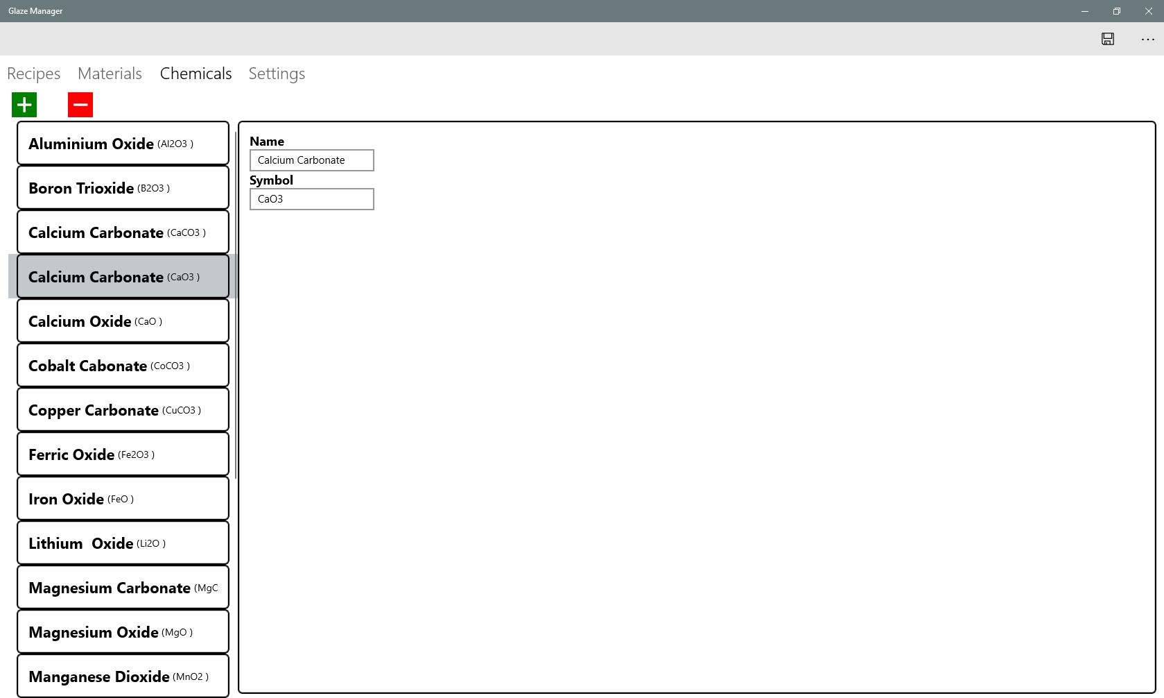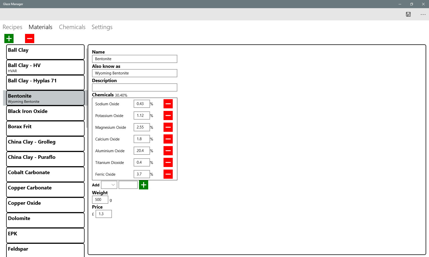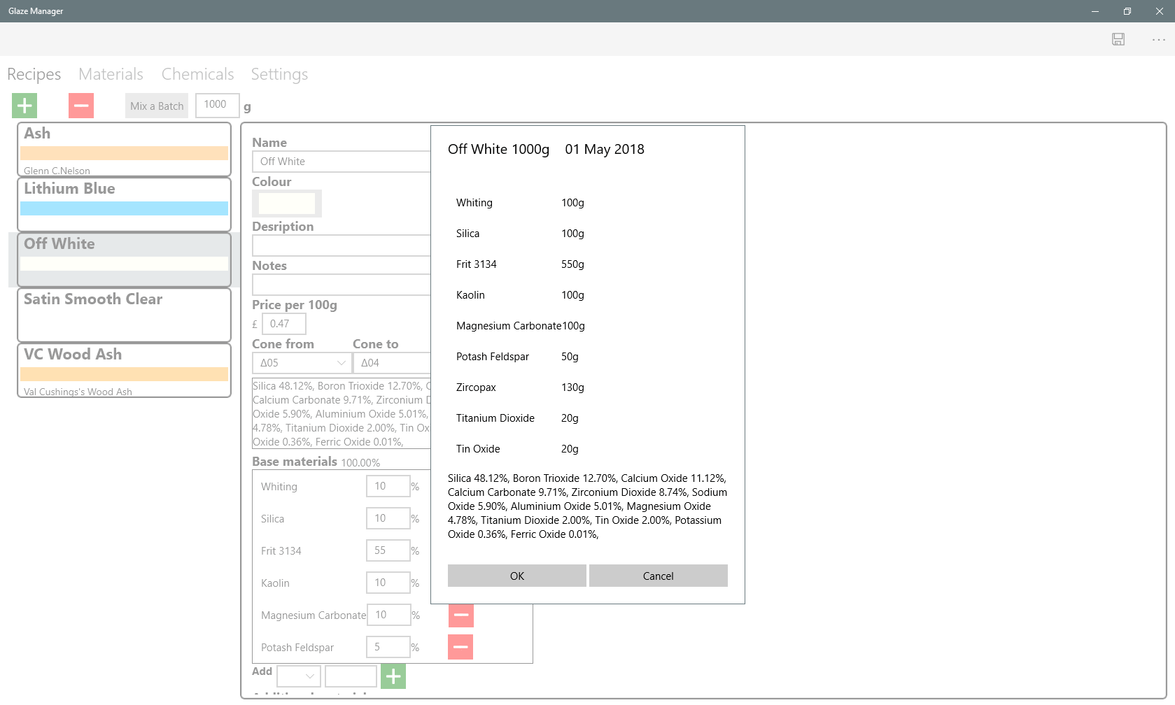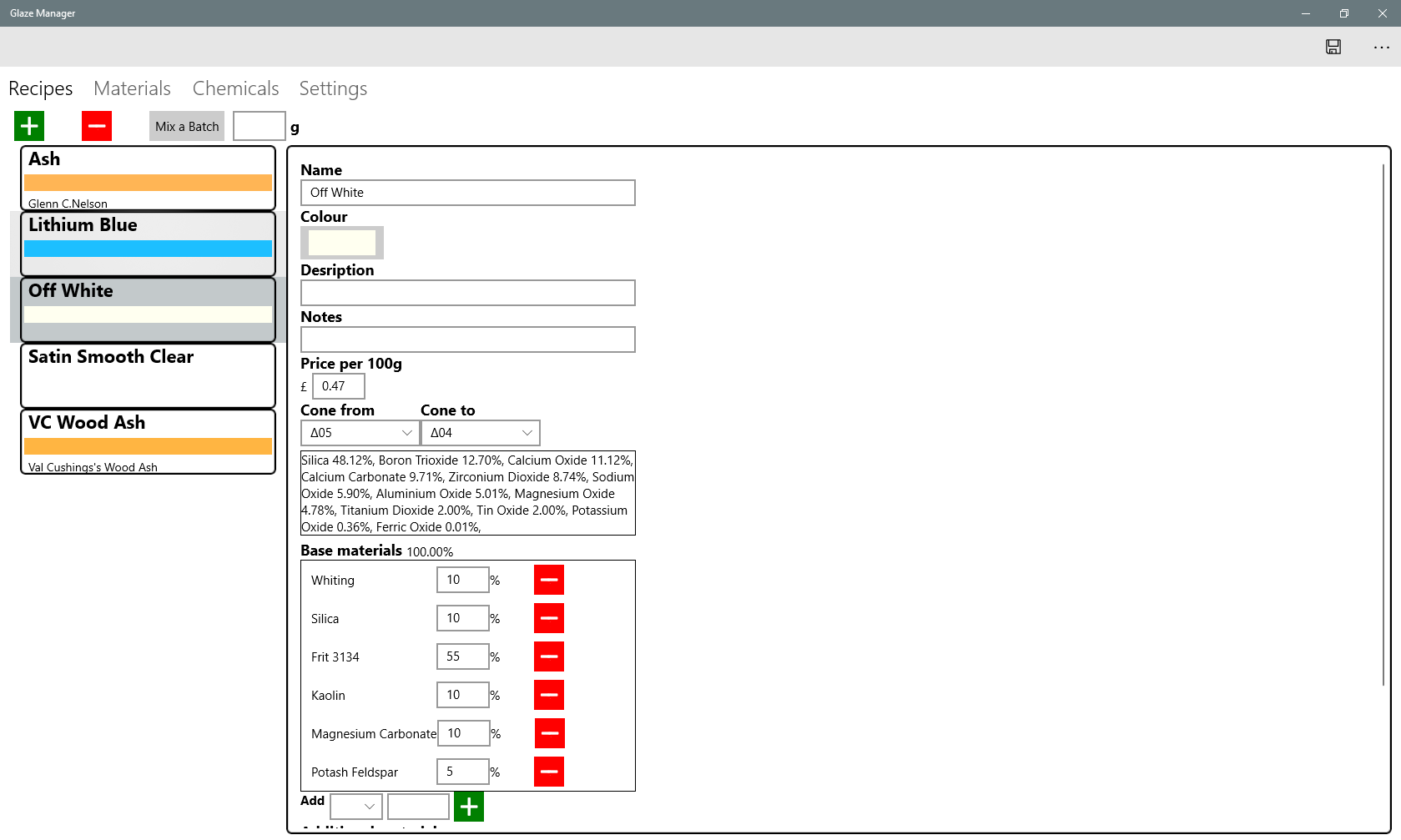 Glaze Manager allows you to create and store all your ceramic glaze recipes. Add the materials available from your local supplier. Then you can mix them into recipes from which the software will be able calculate batch quantities for any amount you want to make. If you list the material chemicals you will also be able to see the final mix of chemical compounds in your recipe.
