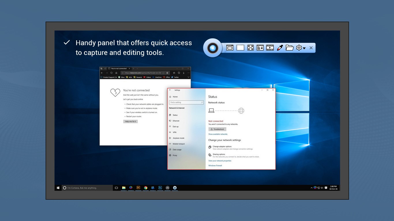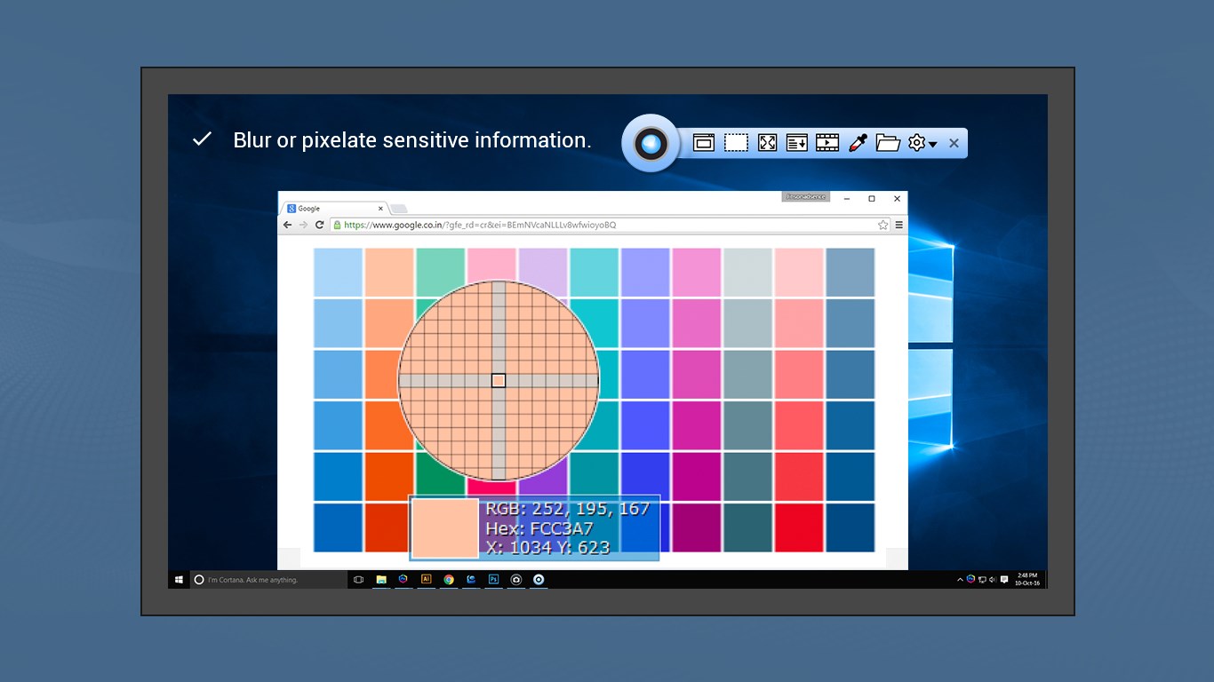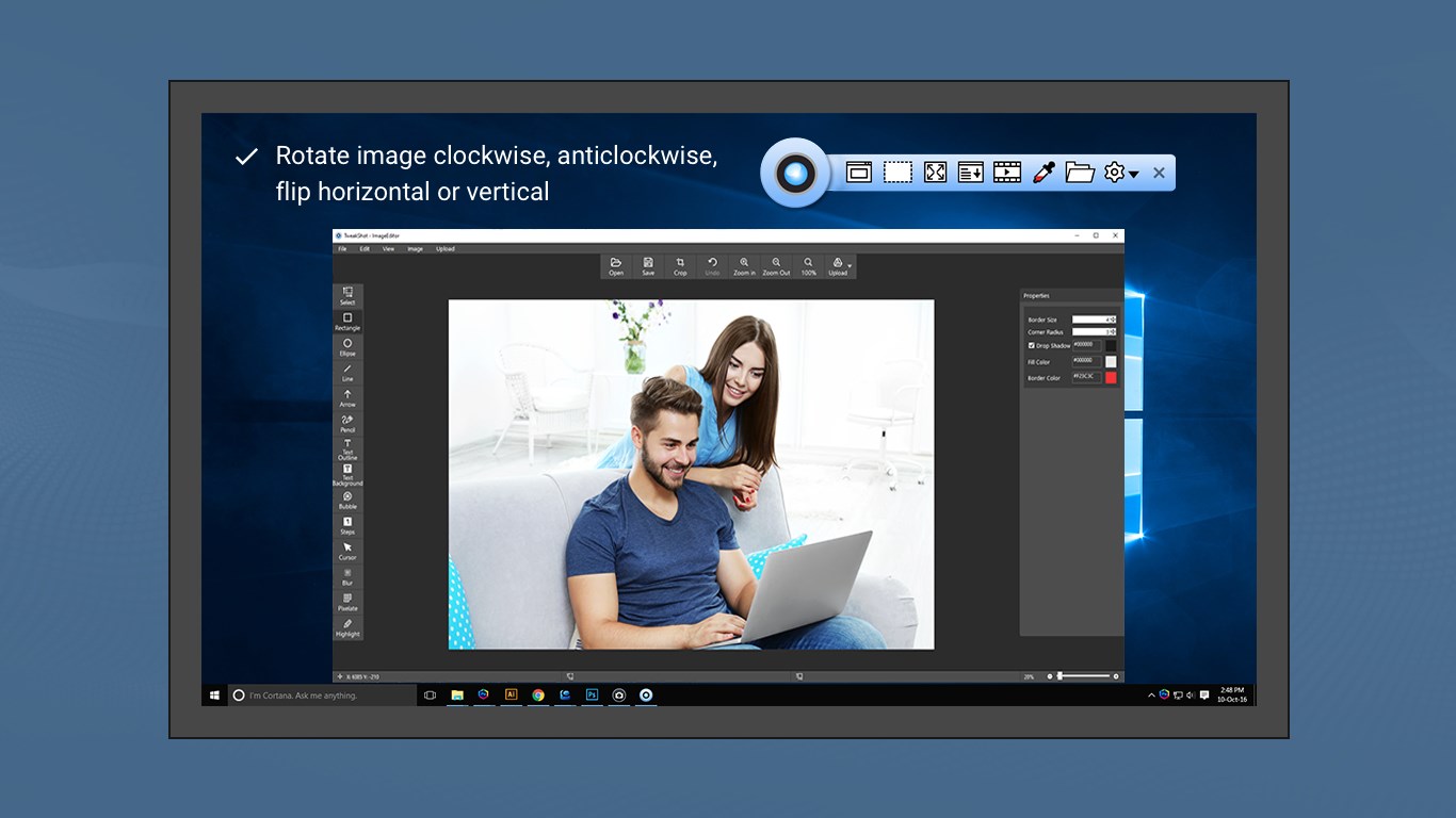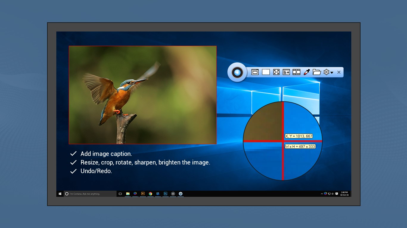 Handy panel that offers quick access to capture and editing toolsRotate image clockwise, anticlockwise, flip horizontal or verticalAnnotate with tools like arrows, text, shapes, etc.Blue or pixelate sensitive informationRecord screen activities, mouse movements using built-in video editorAdd image captionResize, crop, rotate, sharpen, brighten...Undo/Redo