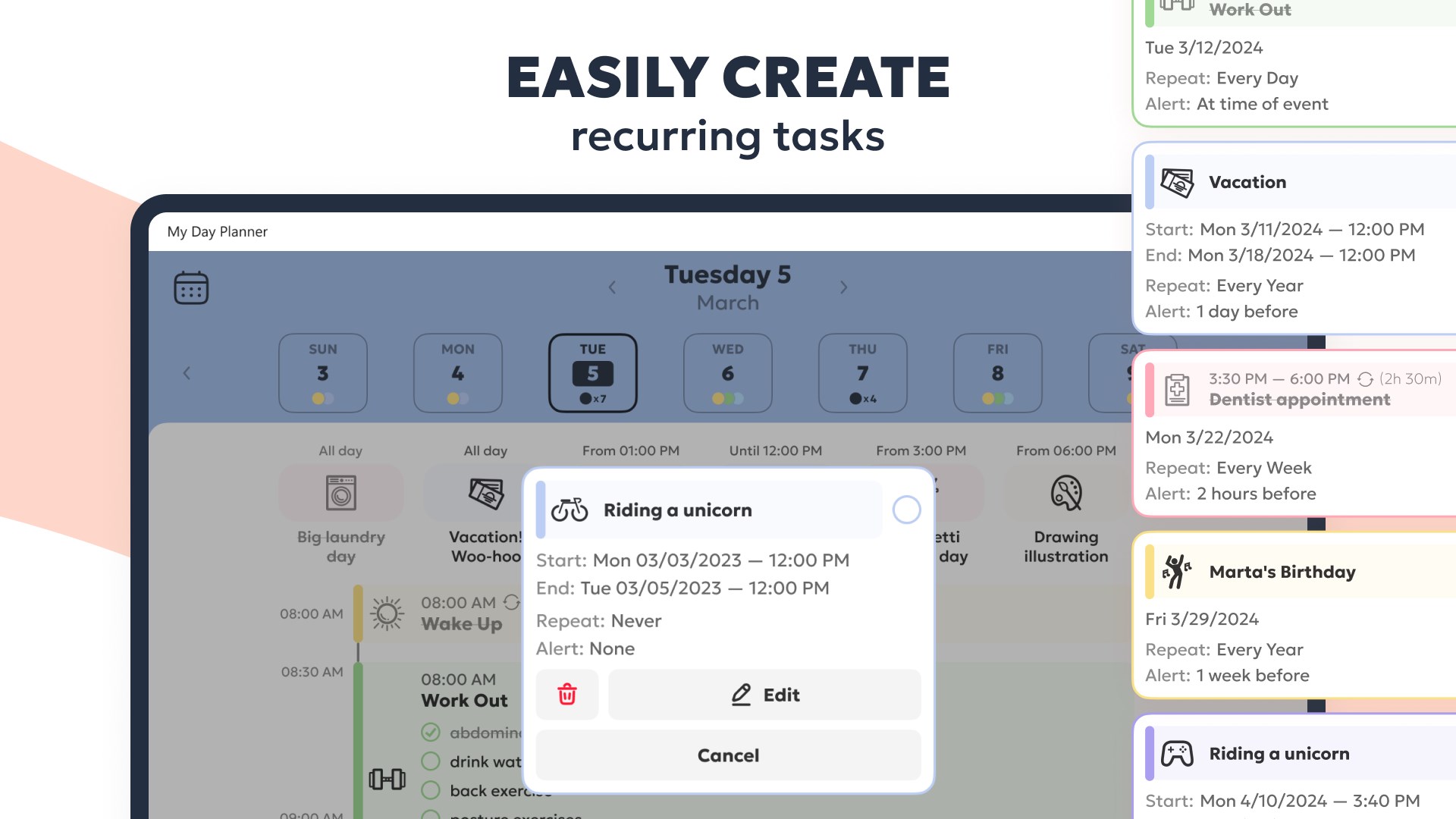 - Choose icons and colors for your tasks and make them recognizable at a glance.