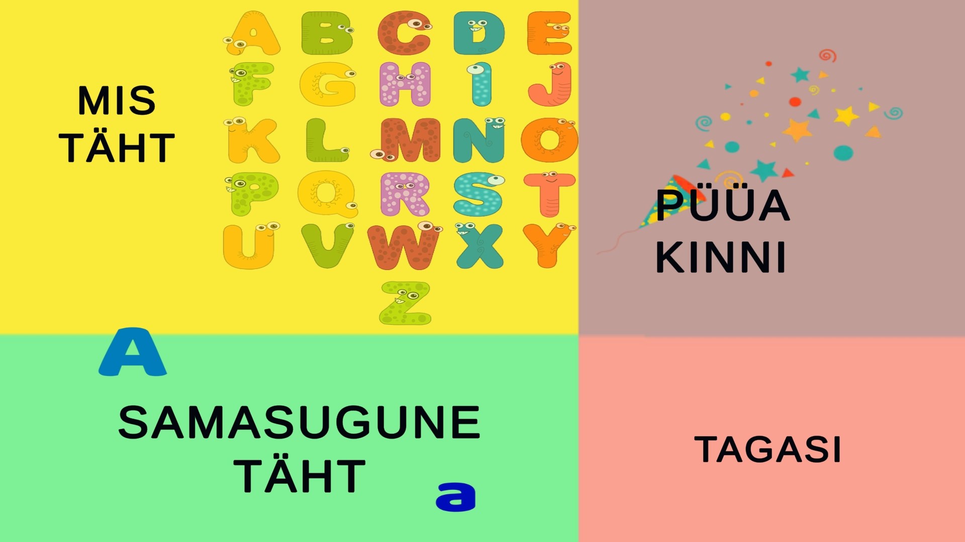 The games in the ToddlerGames app are divided into four themes: vowels, pronunciation, reading and writing. By playing different games, the child can learn vowels, practice pronunciation, reading and writing in Estonian.