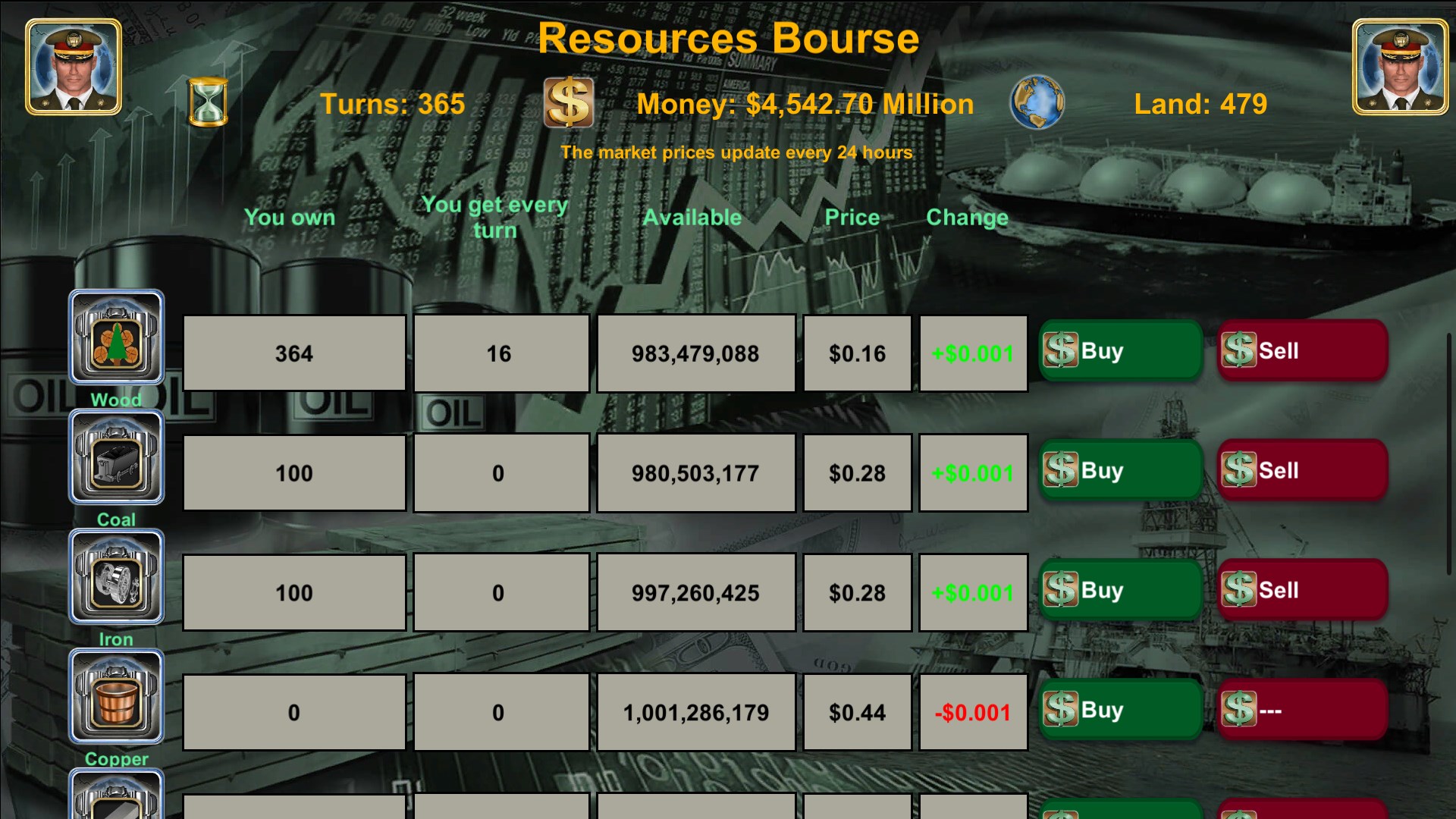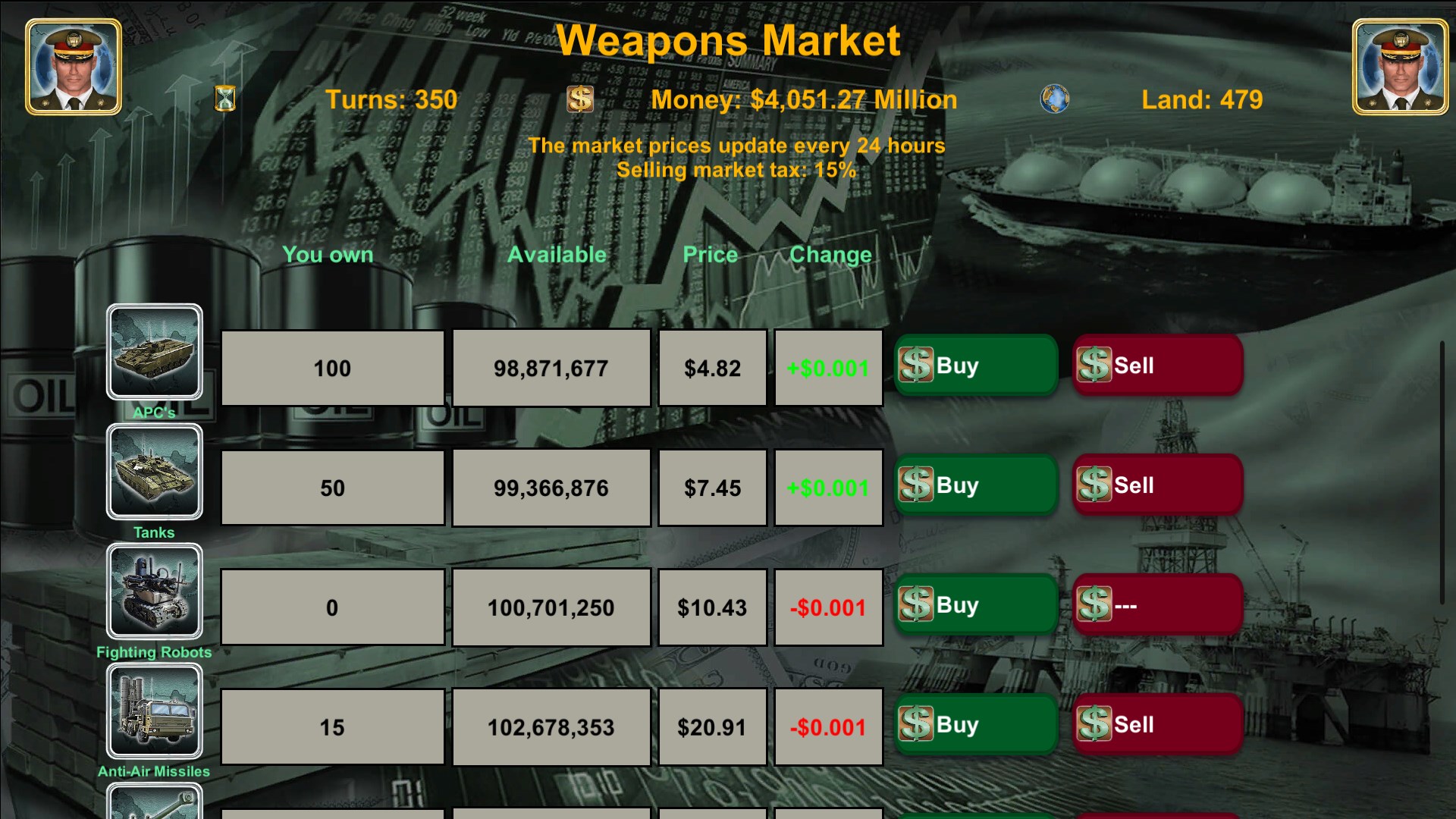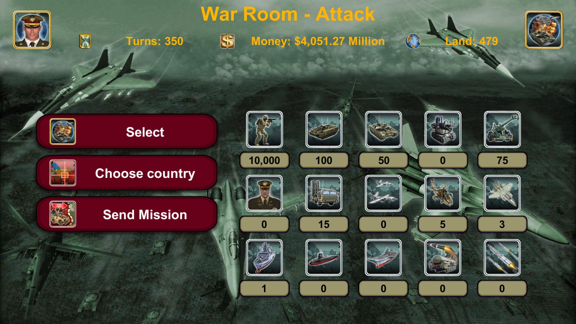 Countless spy, war, diplomacy, technologies, United Nations actions and optionsMassive online multiplayer - Play against thousands of players worldwide Resources, Factories, Stock Exchange, Weapons Markets, Diplomats, Alliances, United Nations, a Spy Center, a War Room, an Economic System, Technology, World Events, World News, and advanced Artificial