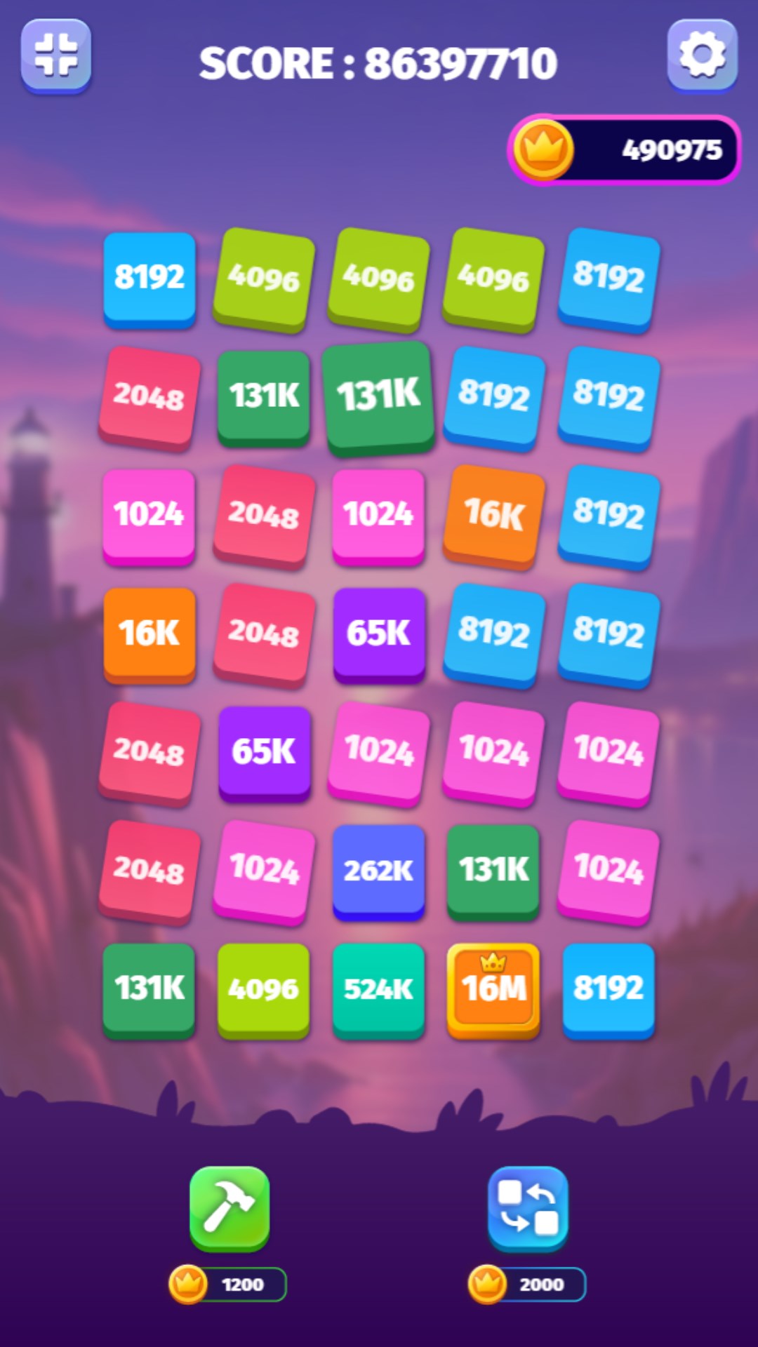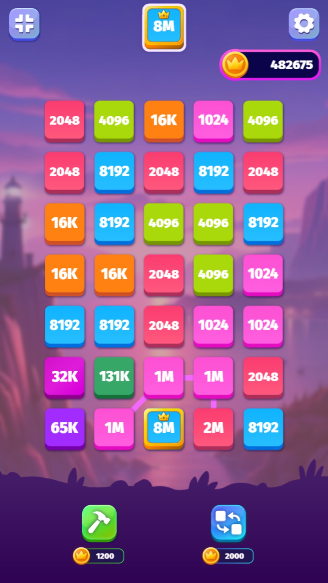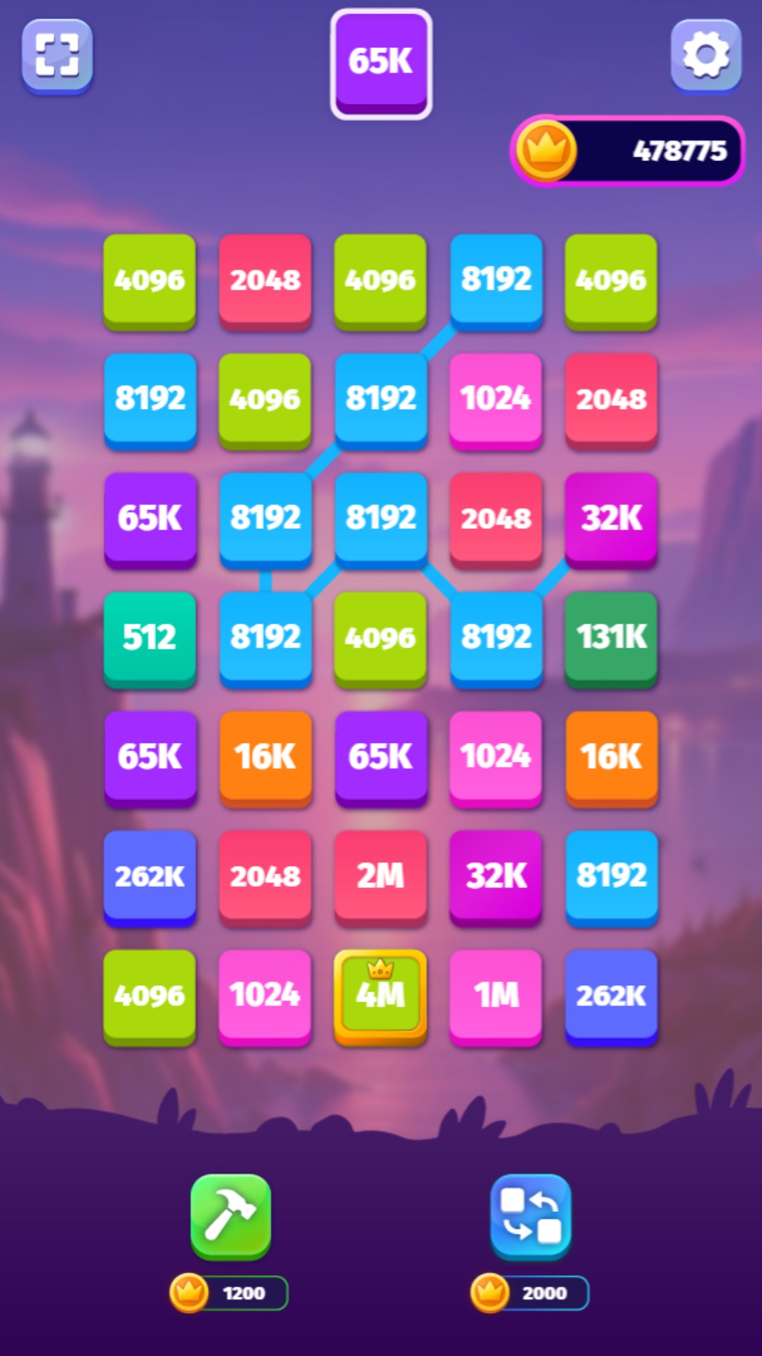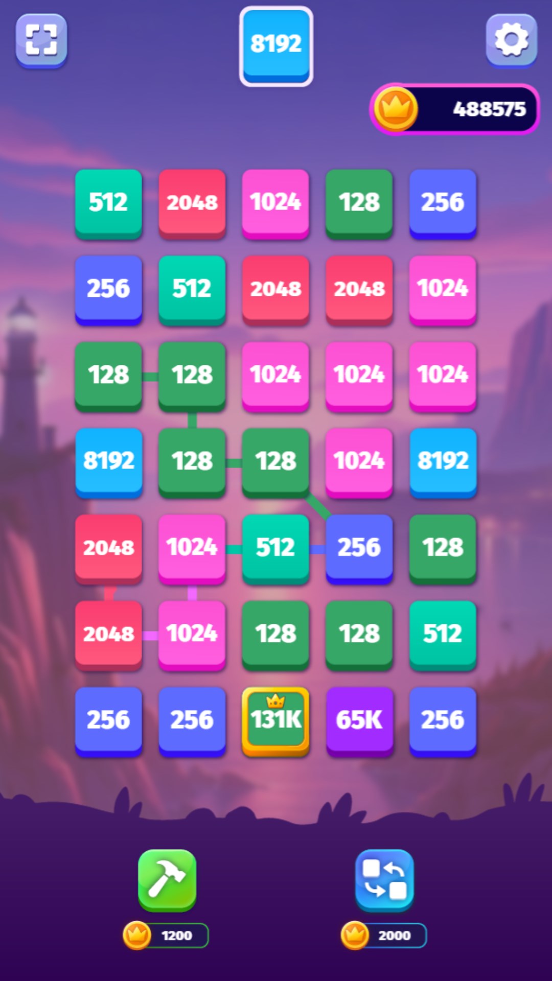 Connect matching or the next multiplied numbers to raise the value of the tiles even more. Use power-ups to achieve the highest number you can.