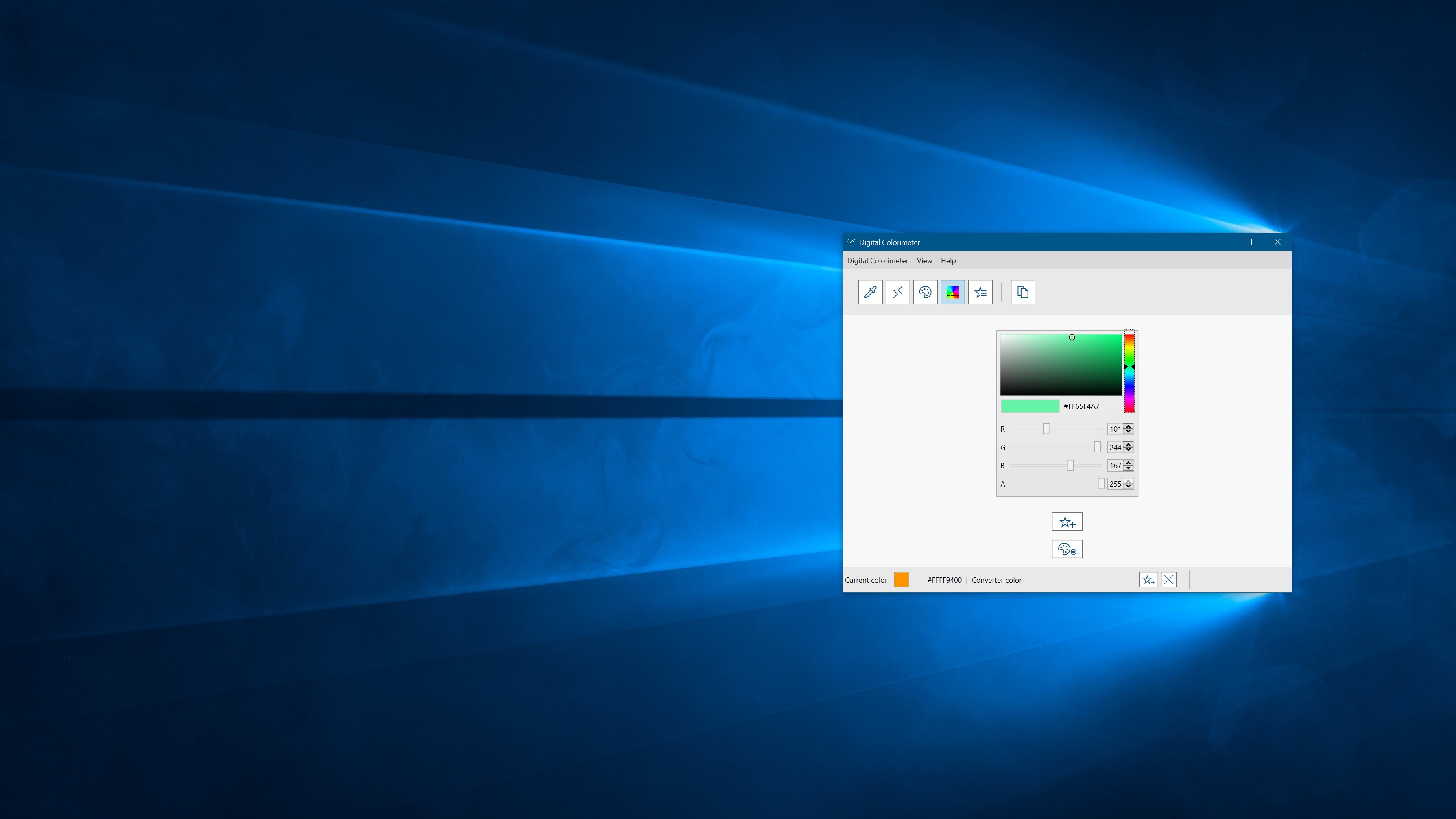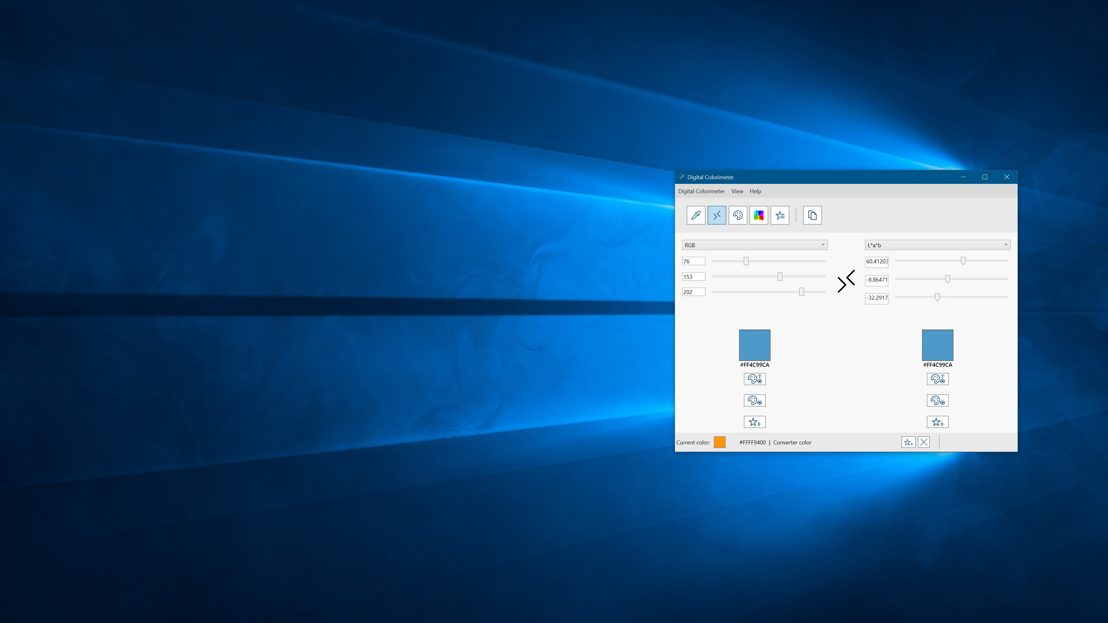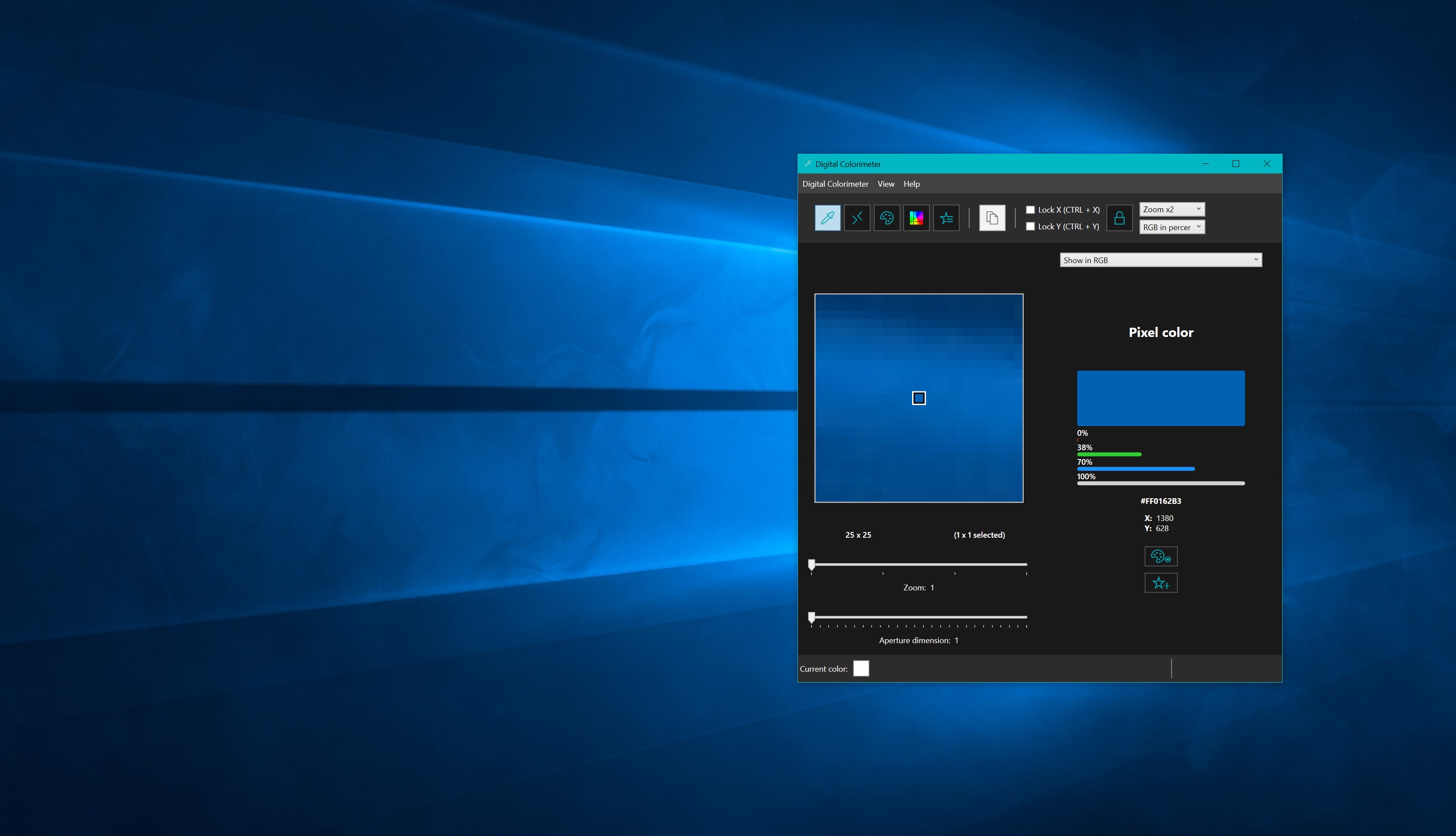Digital Colorimeter is a desktop application specifically designed for Windows 10 that let you pick a desktop color, whatever it is a single pixel or an area, convert it between many space colors, save it and use it for any purpose.