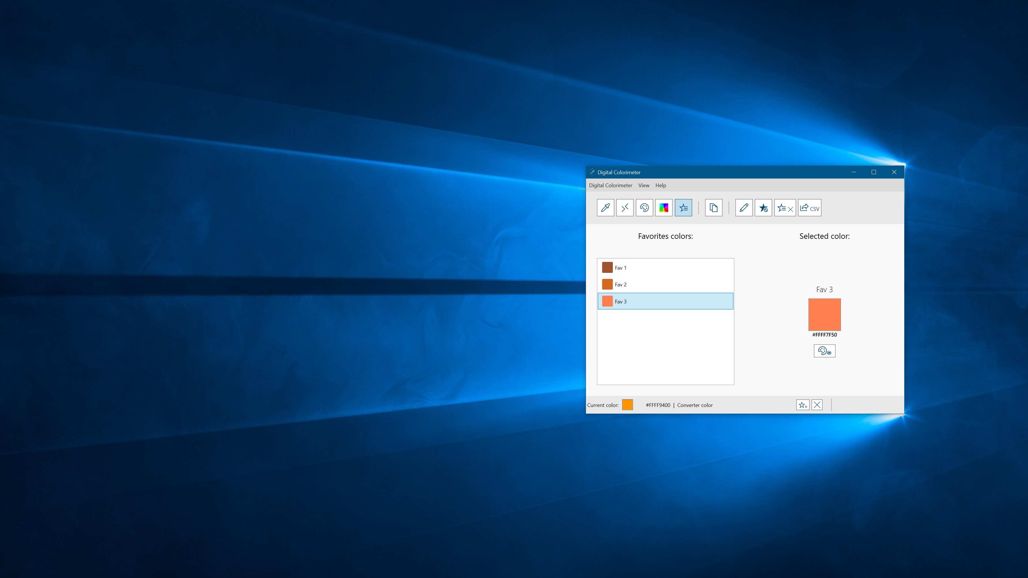 Pick a desktop color (PRO version: Precise single pixel picker)Convert a color between different space colors (PRO version: unlock all the space colors)Pick a custom color from the Windows 10 default palettePRO version: Mark colors as favoritesPRO version: Export favorites as CSV filePRO version: Dark mode