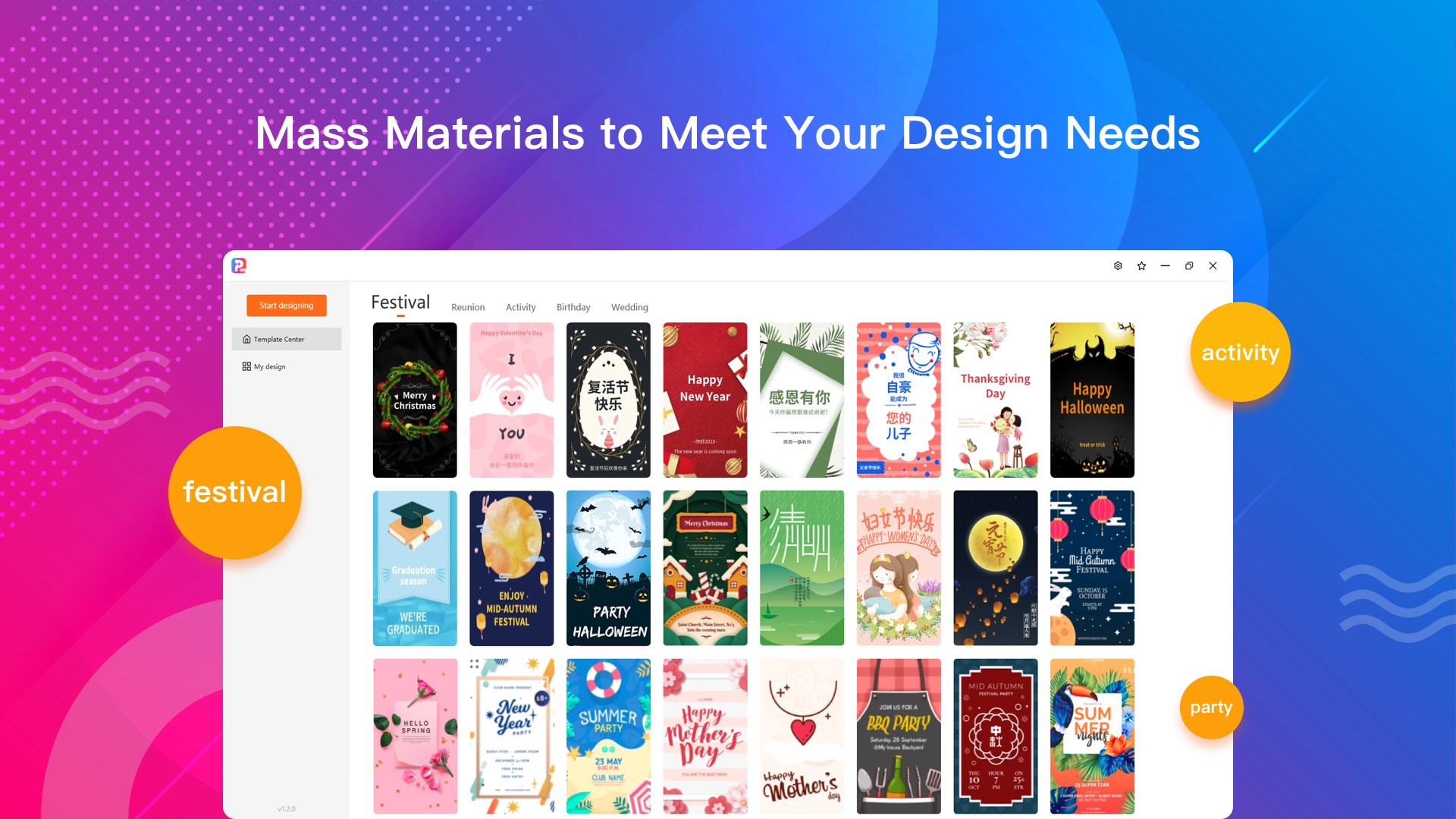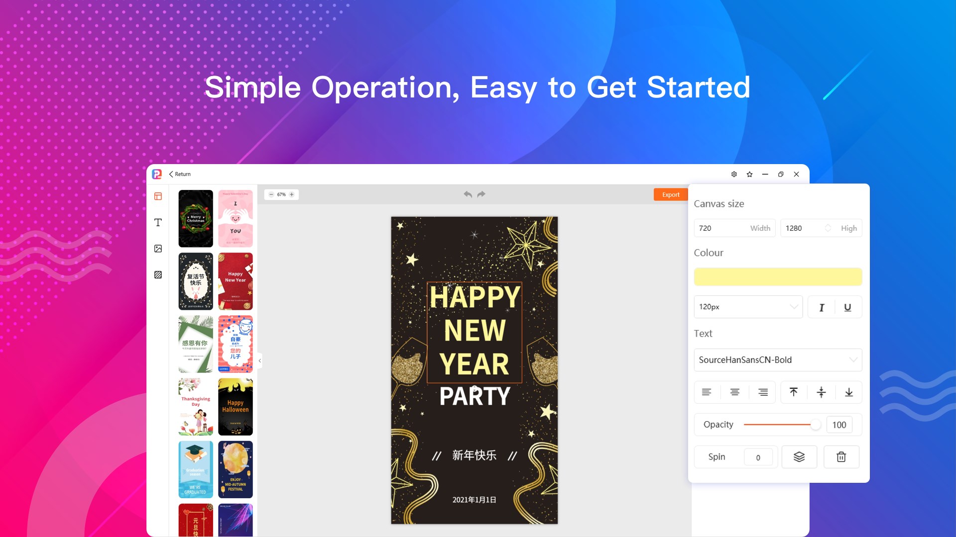 You can use a large number of design elements such as pictures, fonts, templates, etc. provided by the poster designer, and you can create the pictures or designs you need by simply dragging, dragging, and dragging. The software template covers a variety of scenarios to meet your different customization needs.