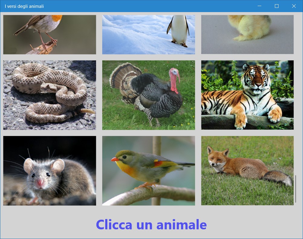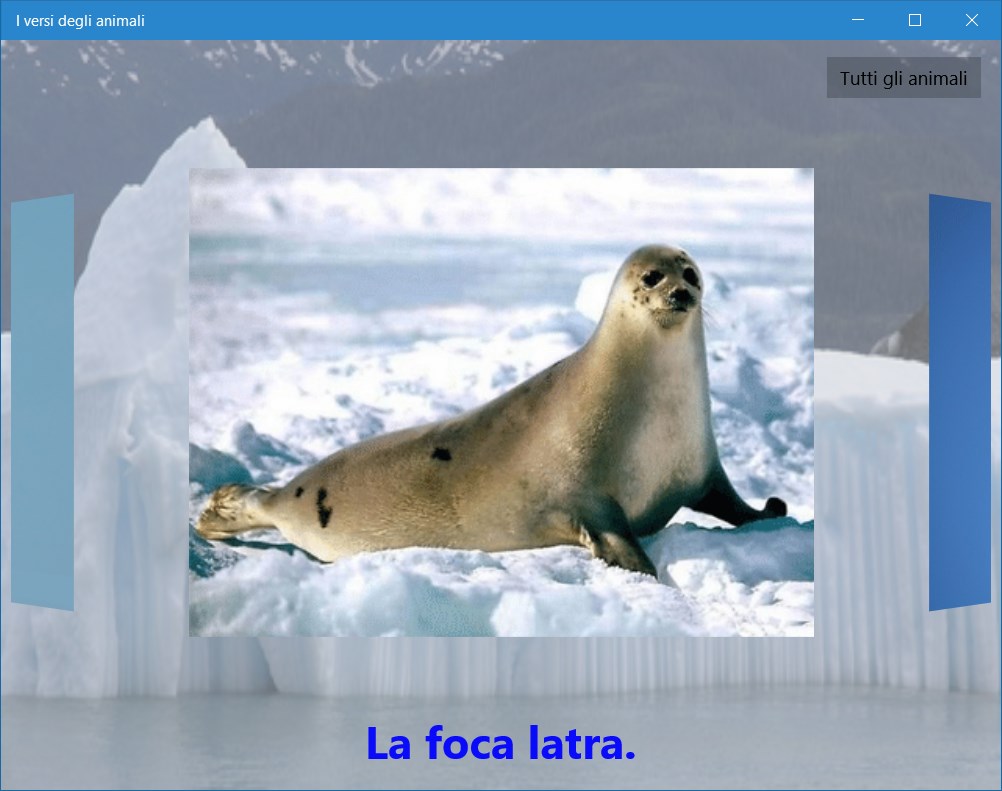 Scorri le immagini di 93 animali. Vedi nello sfondo i loro habitat naturali. Ascolta i loro versi e i loro suoni. Leggi come noi chiamiamo il loro modo di "parlare".