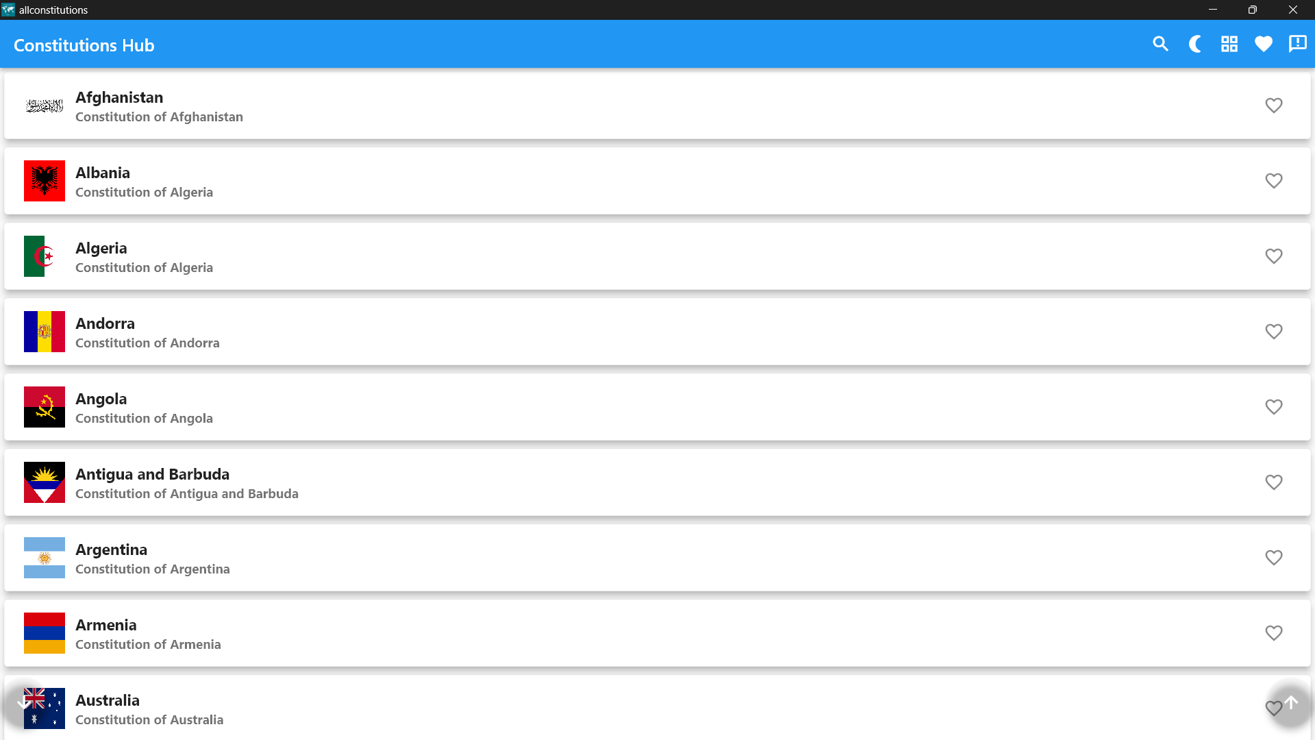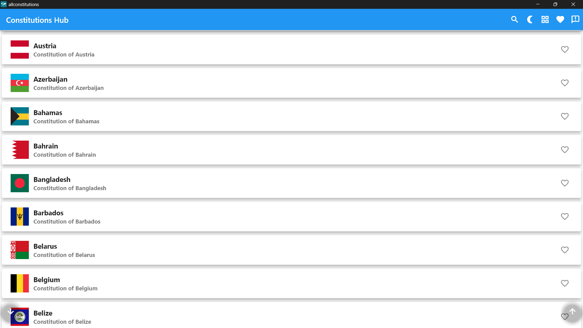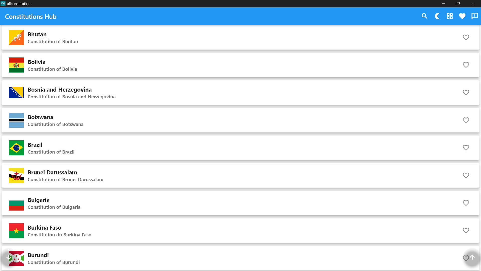 This version contains the constitutions of over 160 countries with all the available translations. This version contains the constitution of Afghanistan, Albania, Algeria, Andorra, Angola, Antigua and Barbuda, Argentina, Armenia, Australia, Austria, Azerbaijan, Bahamas (The), Bahrain, Bangladesh, Barbados, Belarus, Belgium, Belize, Benin, Bhutan, Bolivia (Plurinational State of), Bosnia and Herzegovina, Botswana, Brazil, Brunei Darussalam, Bulgaria, Burkina Faso, Burundi, Cambodia, Cameroon, Canada, Cape Verde, Central African Republic, Chad, Chile, China (People’s Republic of), Colombia, Comoros, Congo (Democratic Republic of the), Congo (Republic of the), Costa Rica, Côte d'Ivoire, Croatia, Cuba, Cyprus, Czech Republic, Denmark 1953, Djibouti, Dominica, Dominican Republic, Ecuador, Egypt, El Salvador, Equatorial Guinea, Eritrea, Estonia, Eswatini, Ethiopia, Fiji, Finland, France, Gabon, Gambia (The), Georgia, Germany, Ghana, Greece, Grenada, Guatemala, Guinea-Bissau, Guyana, Haiti, Honduras, Hungary, Iceland, India, Indonesia, Iran (Islamic Republic of),Iraq, Ireland, Israel, Italy, Jamaica, Japan, Jordan, Kazakhstan, Kenya, Kiribati, Korea (Democratic People's Republic of), Korea (Republic of), Kosovo, Kuwait, Kyrgyzstan, Lao People's Democratic Republic, Latvia, Lebanon, Lesotho, Liberia, Libya, Liechtenstein, Lithuania, Luxembourg, Madagascar, Malawi, Malaysia, Maldives, Malta, Marshall Islands, Mauritania, Mauritius, Mexico, Micronesia (Federated States of), Moldova (Republic of), Monaco, Mongolia, Montenegro, Morocco, Mozambique, Myanmar, Namibia, Nauru, Nepal, Netherlands, New Zealand, Nicaragua, Niger, Nigeria, North Macedonia (Republic of), Norway, Oman, Pakistan, Palau, Palestine, Panama, Papua New Guinea, Paraguay, Peru, Philippines, Poland, Portugal, Qatar, Romania, Russian Federation, Rwanda, Saint Kitts and Nevis, Saint Lucia, Saint Vincent and the Grenadines, Samoa, Sao Tome and Principe, Saudi Arabia, Senegal, Serbia, Seychelles, Sierra Leone, Singapore, Slovakia, Slovenia, Solomon Islands, Somalia, South Africa, South Sudan, Spain ,Zambia, Zimbabwe. What is so unique is that this application also contains various translations of the constitutions of over 83 countries with more to come. Future updates will include all the countries of the world constitution.