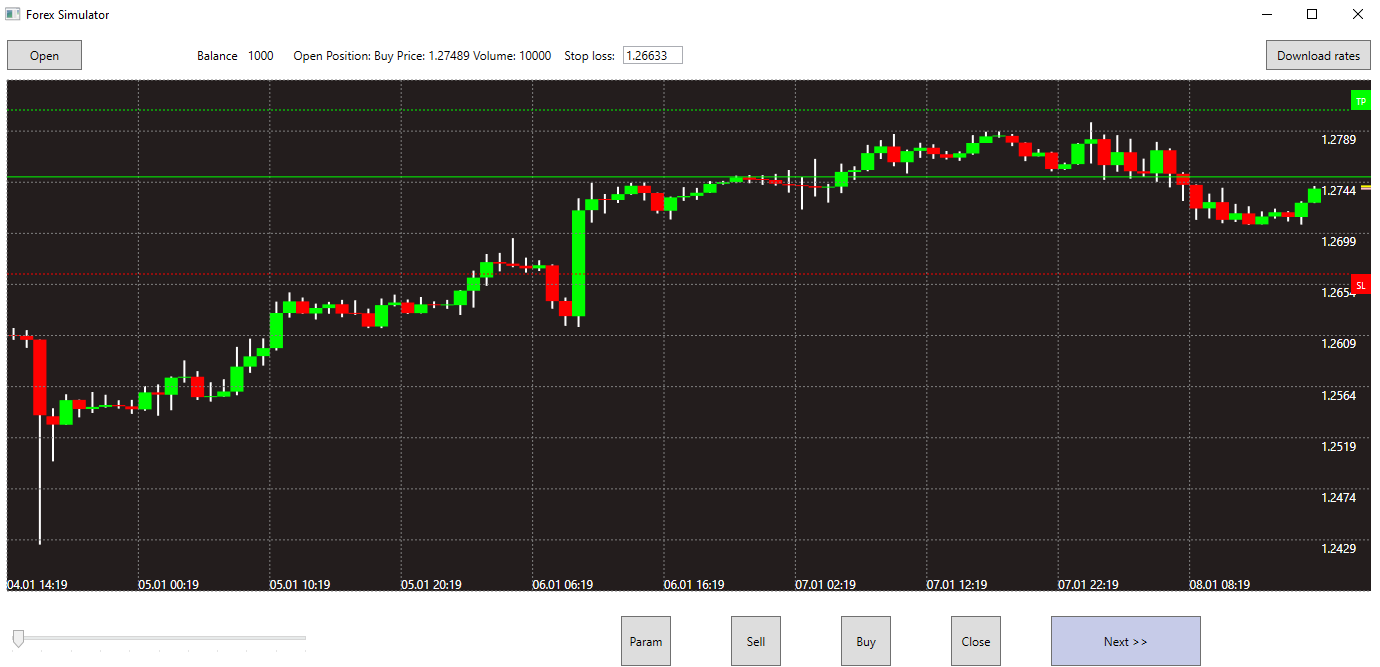 Train your Forex trading skills by virtual manual trading with real historical exchange rates. The application contains embeded exchange rate data of main currency pairs. You can select Time frame from 1 min to 1 day. It is also possible to use your own text files with exchange rates downloaded from 3rd party services.