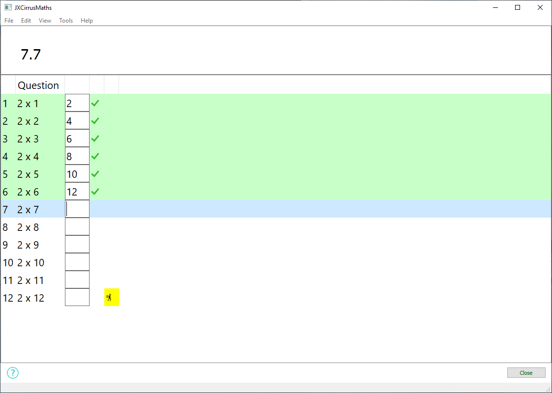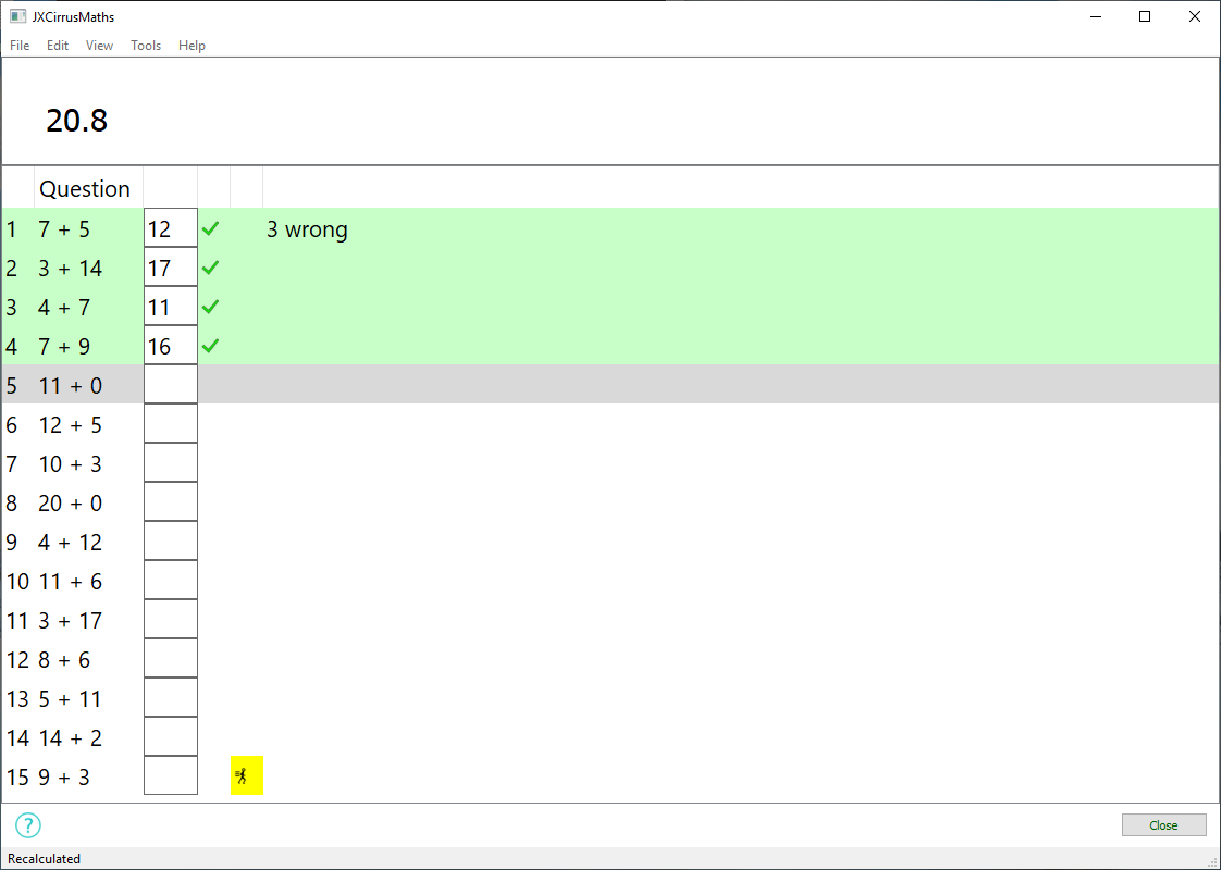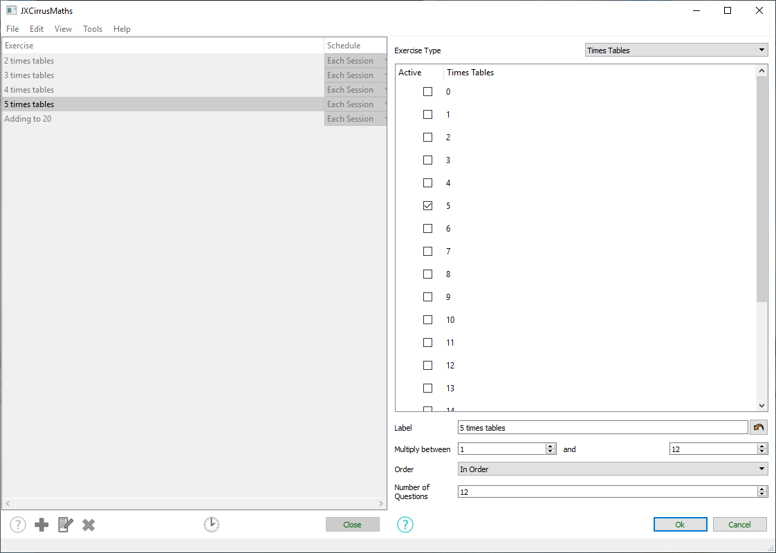 JXCirrus Maths is a maths training application aimed at primary school children. It focuses on basic arithmetic: Times tables, addition, subtraction and division. It will let you set up exercises that are run each day, and then records the best time and lets you race against that.