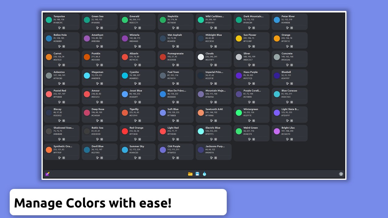 Design, organize, export and share your personalized color palettes with ease. This comprehensive tool allows you to create and save custom color combinations while providing a detailed overview of each color's HEX, RGB, and HSL codes. Additionally, you can extract colors directly from your screen and display them in the tool’s intuitive interface. For enhanced clarity and organization, each color can be assigned a unique name of your choosing, simplifying your workflow and improving your palette management. Effortlessly copy the HEX or RGB code for seamless integration into your design projects, ensuring precise color accuracy across all mediums.