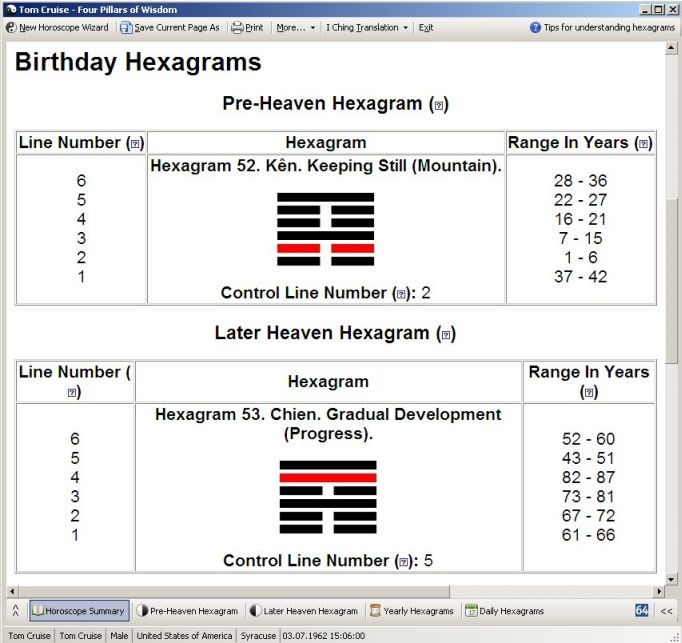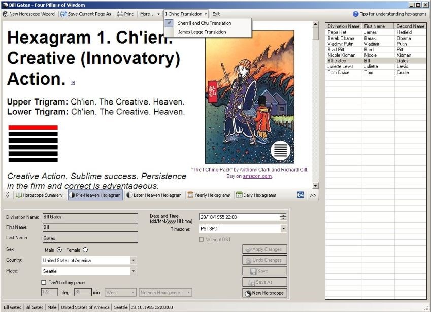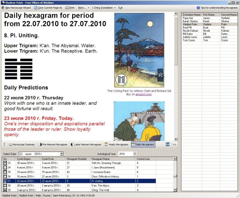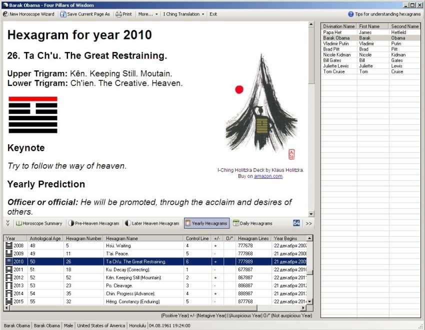 Working with the program, you get personal birth chart based on I Ching (Chinese Book of Changes) which represents a figured description of forces and influences following you during your lifetime.