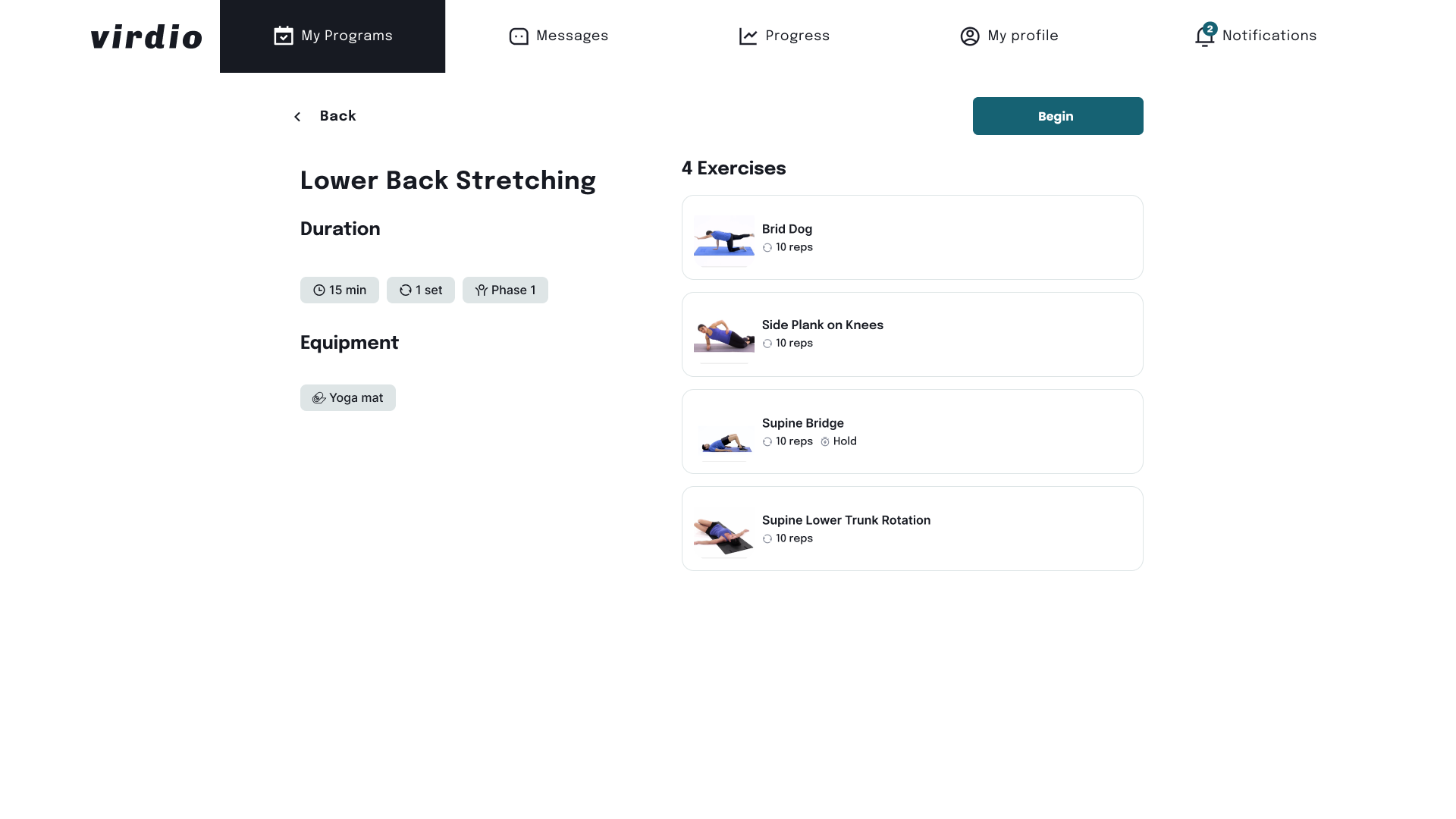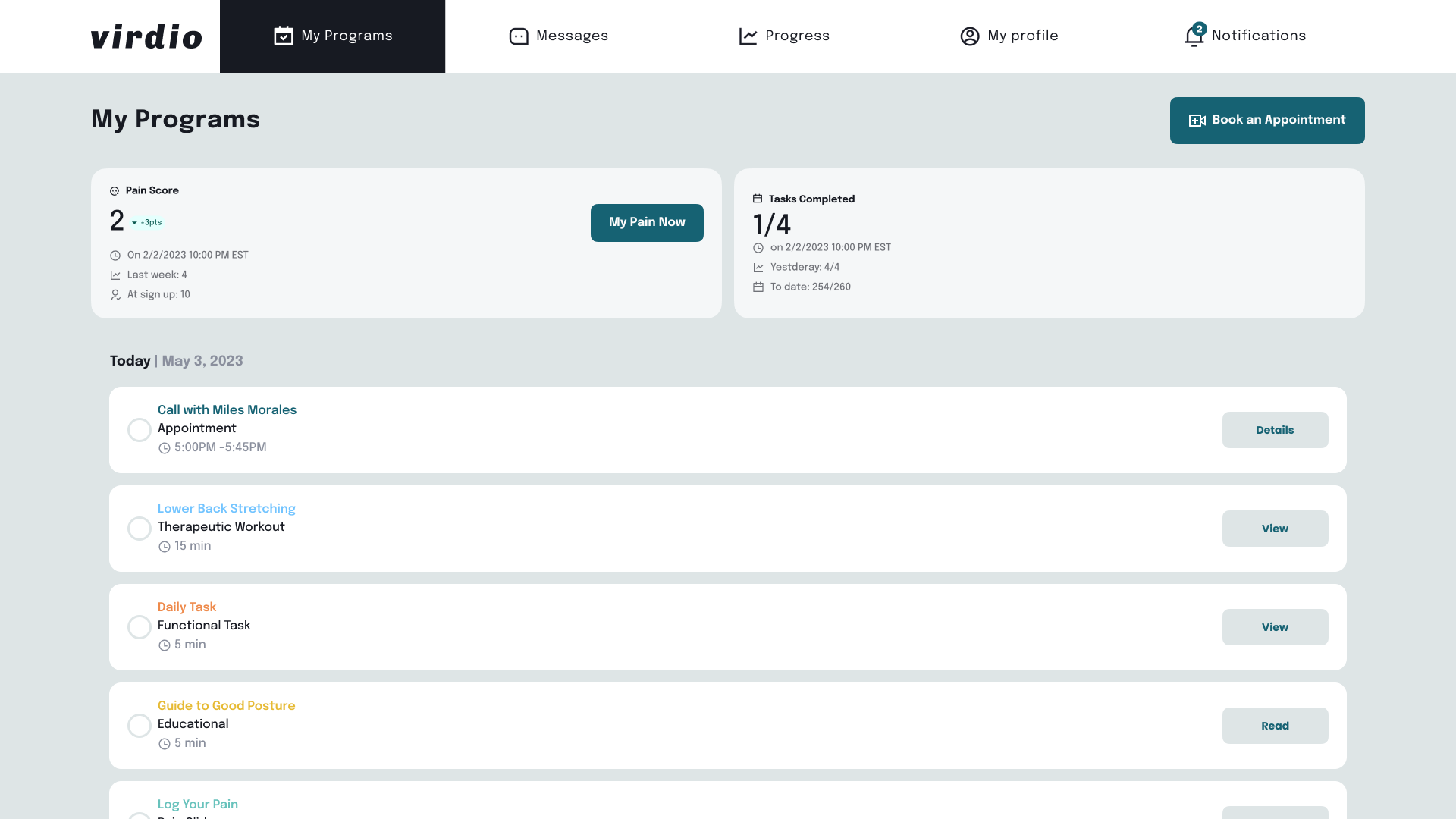 The Virdio Health App provides home physical therapy programs for MSK care featuring: