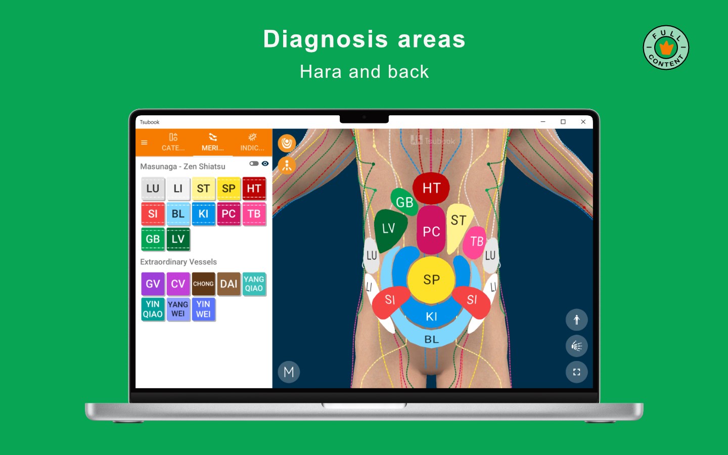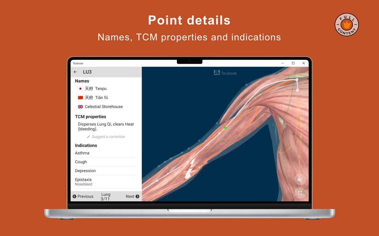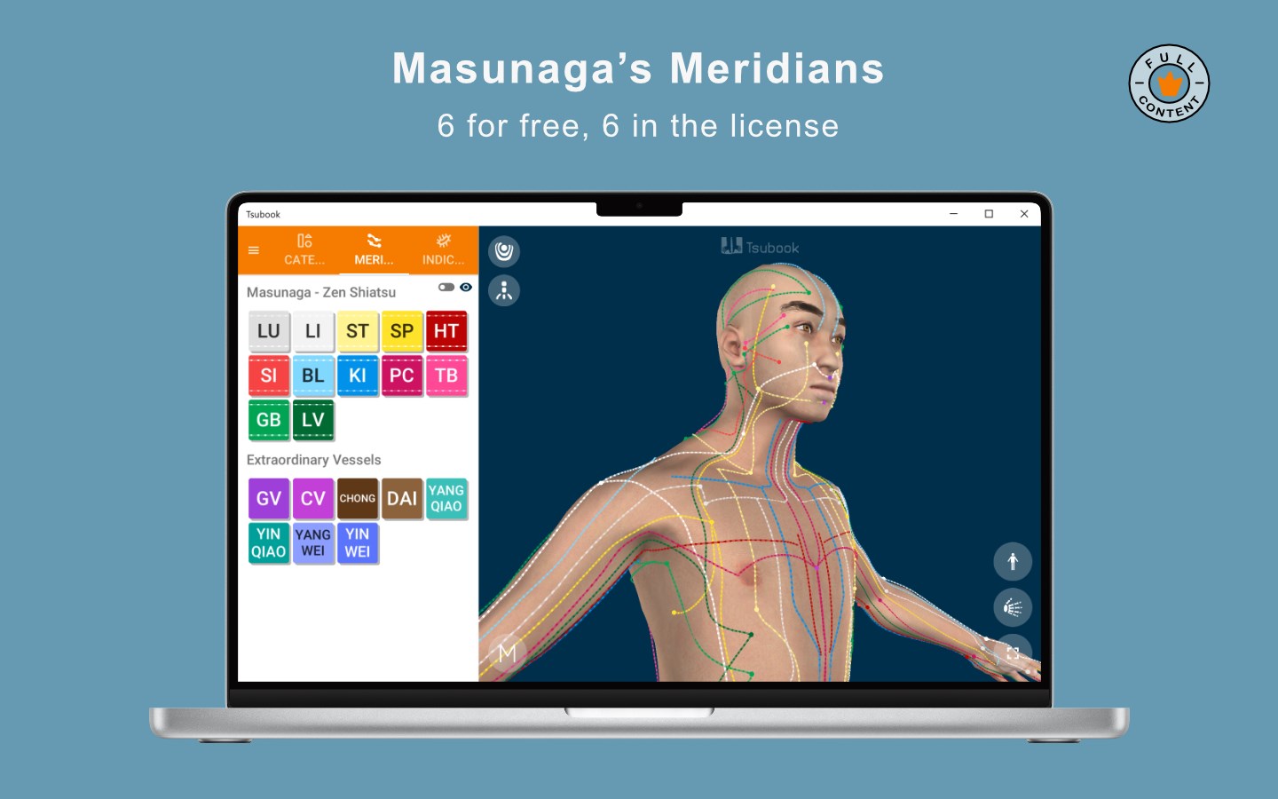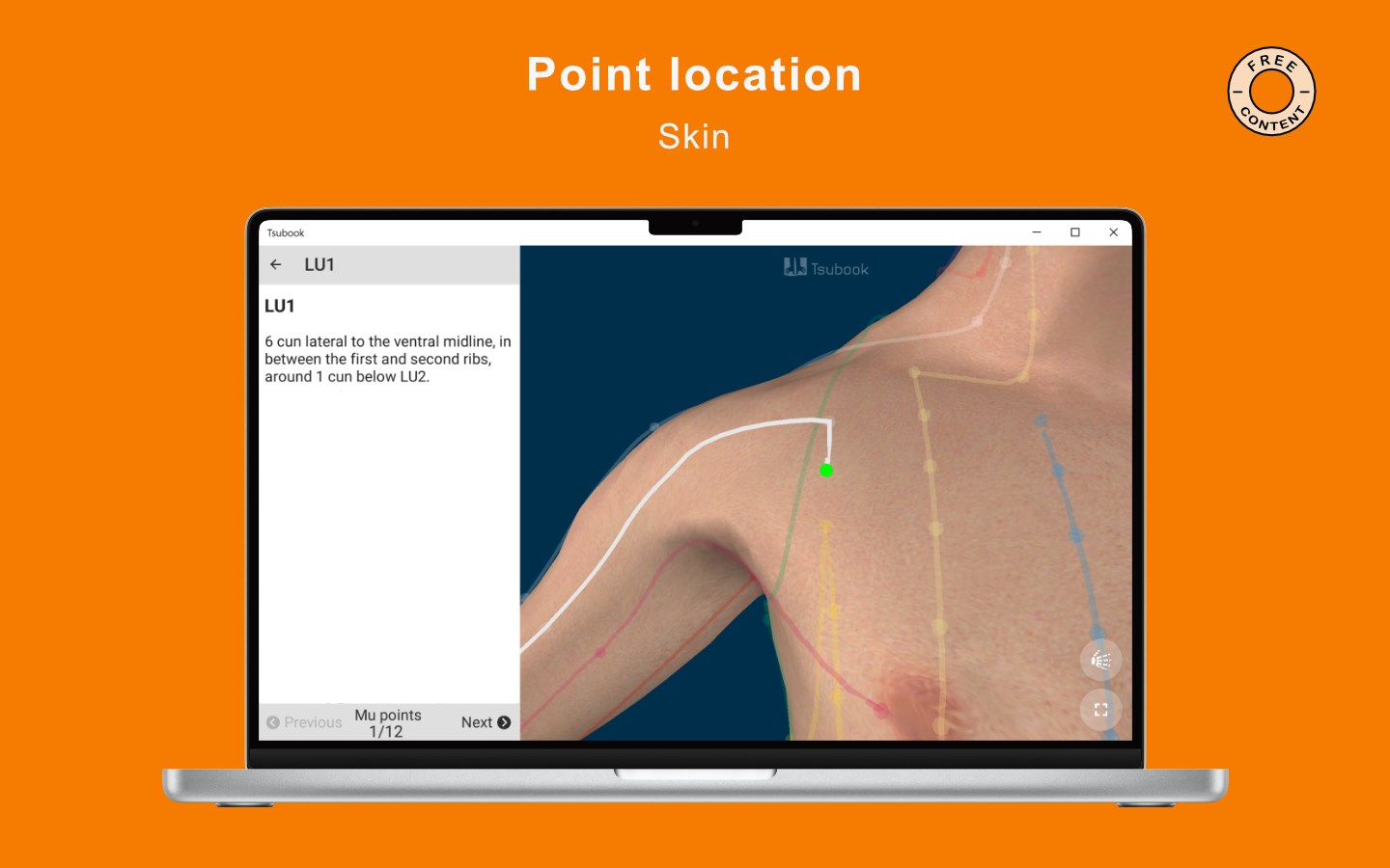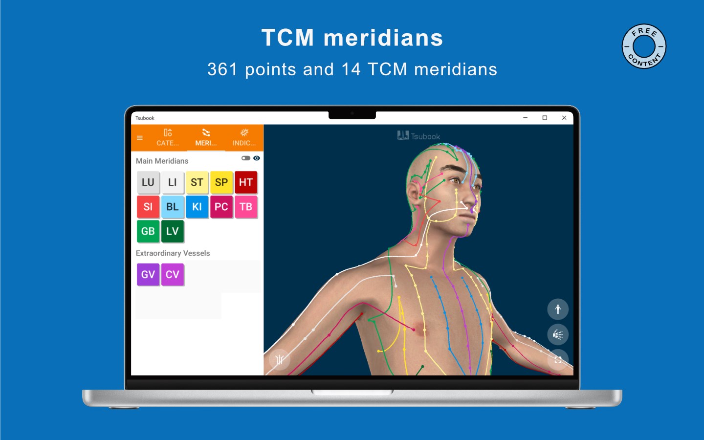 3D human body (for free)20 TCM meridians (14 for free)361 locations of points (for free)12 Masunaga\'s meridians (6 for free)12 diagnosis areas (6 for free)Bones, muscles and organs (paid)600+ indications (paid)11 point categories (paid)TCM properties for all the points (paid)Names in Chinese, Japanese and English for all the points (paid)