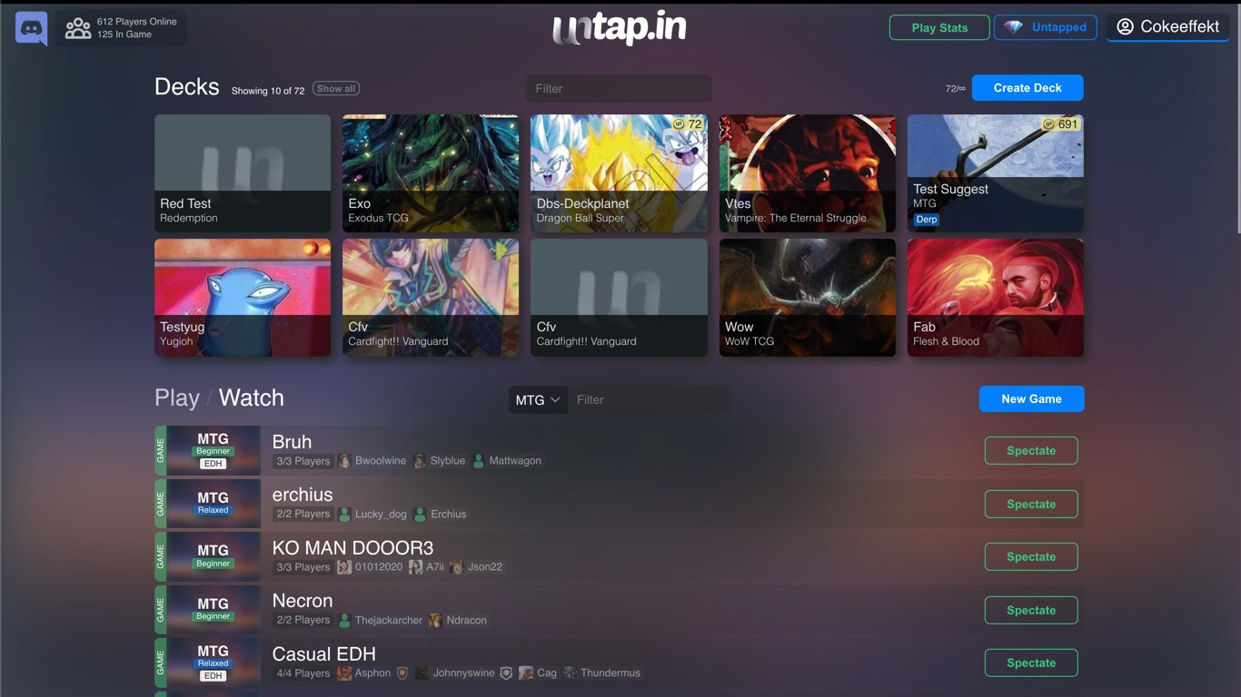 Untap is the ultimate online CCG and TCG play tester and deck builder with over 20 popular card games available. The intuitive UI allows you to build your decks and play-test them against thousands of real live opponents.