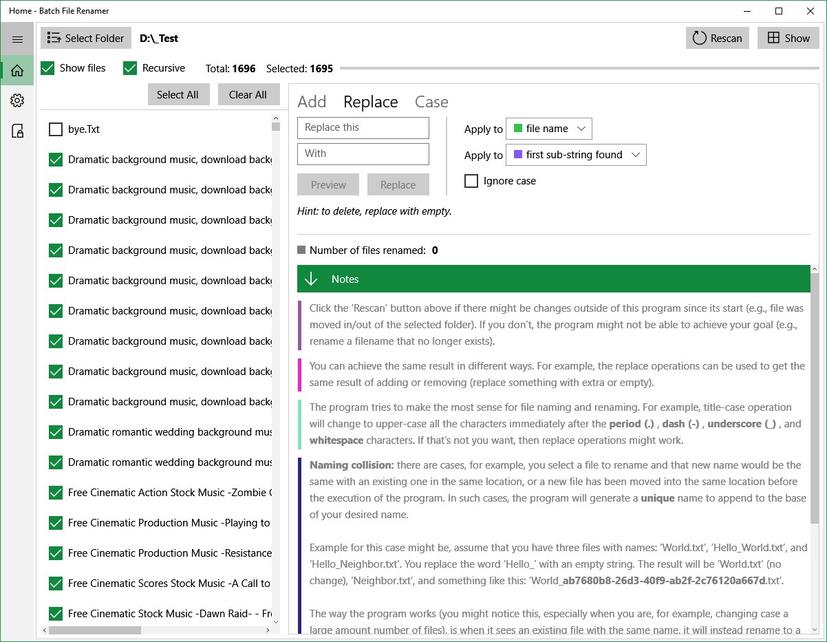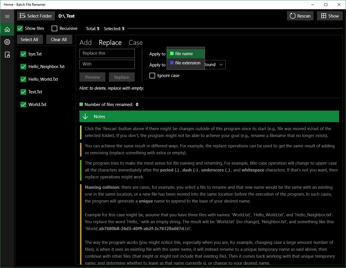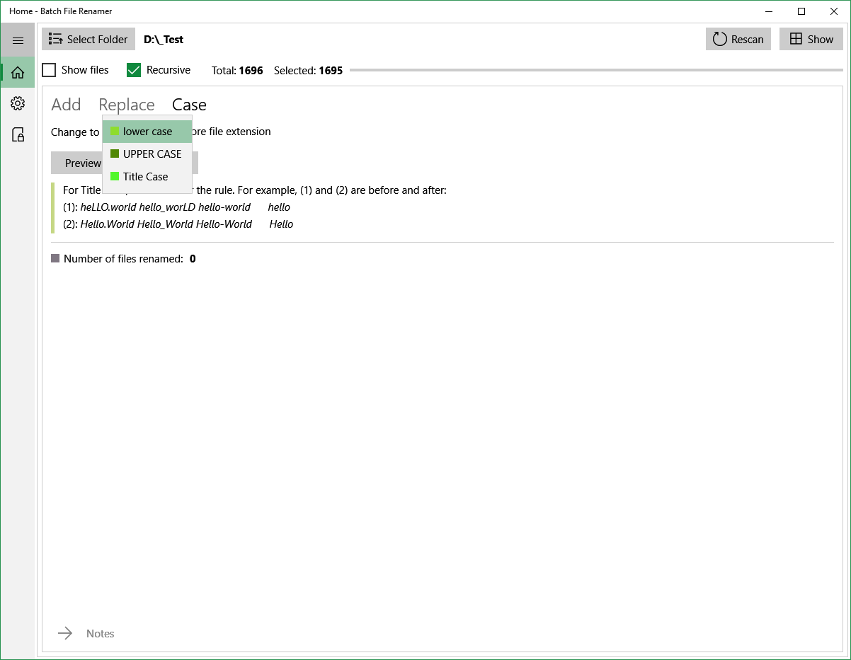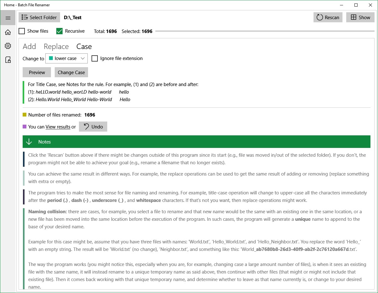 - The program tries to make the most sense for file naming and renaming. For example, title-case operation will change to upper-case all the characters immediately after the period (.), dash (-), underscore (_), and whitespace characters. If that’s not you want, then replace operations can get what you want.