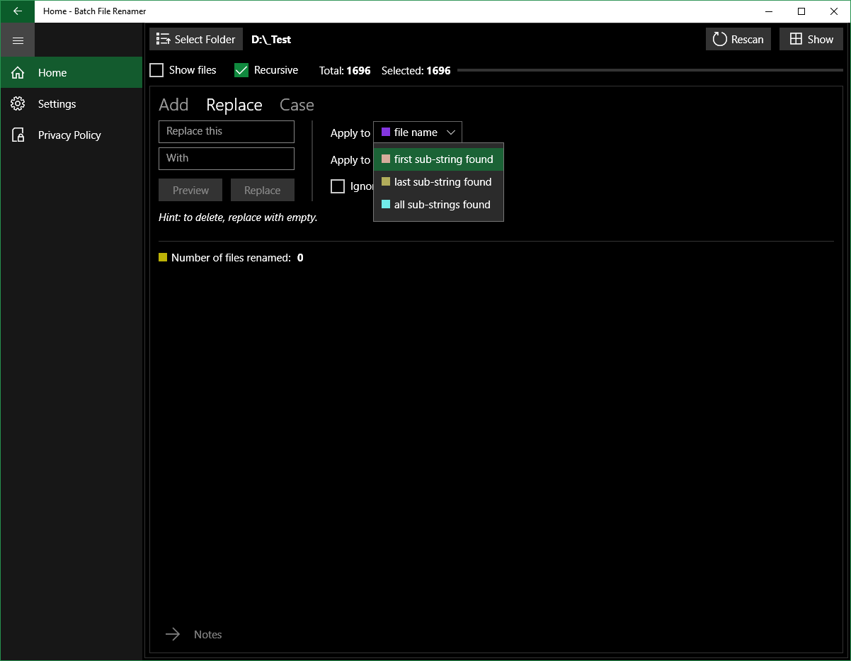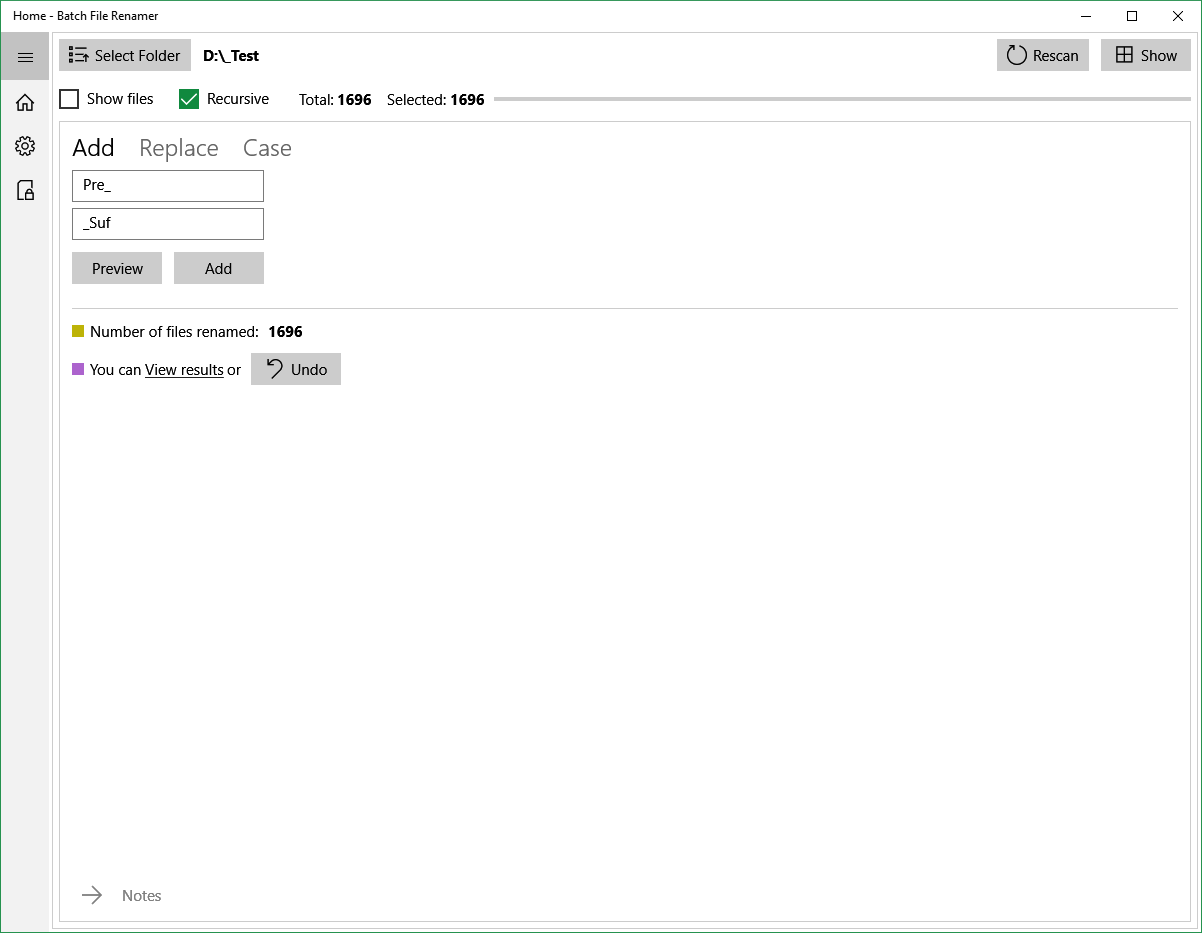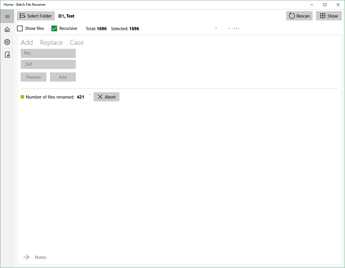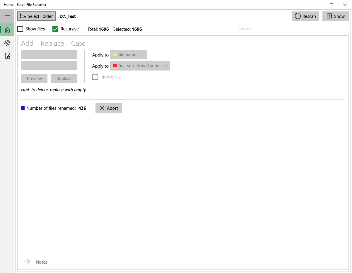 Recursive renaming files in sub-foldersPreview before changesUndo after the changesAbort a running renaming operation