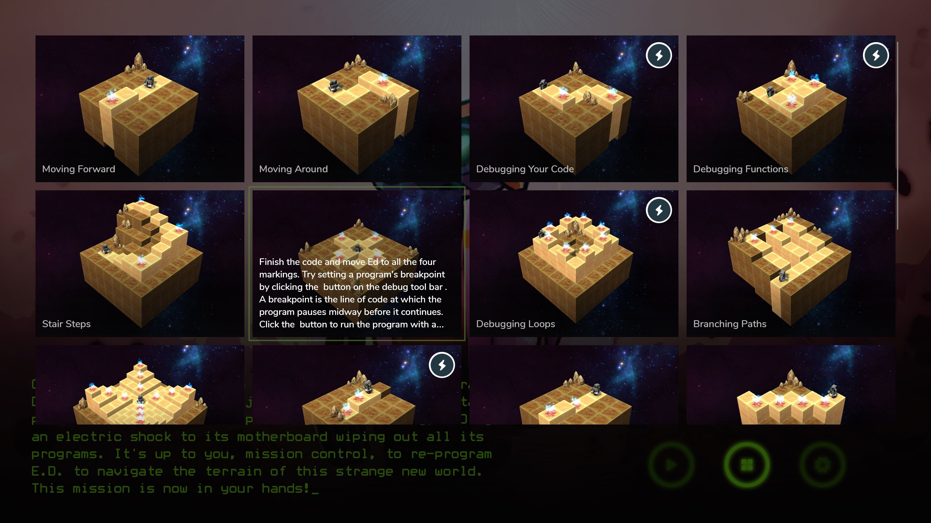 Out in the deep space of a faraway galaxy, the Exploratory Databot known as E.D. has just discovered a new habitable planet for humankind. Unexpectedly while landing, E.D. got an electric shock to its motherboard wiping out all its programs. It's up to you, mission control, to re-program E.D. to navigate the terrain of this strange new world. This mission is now in your hands!