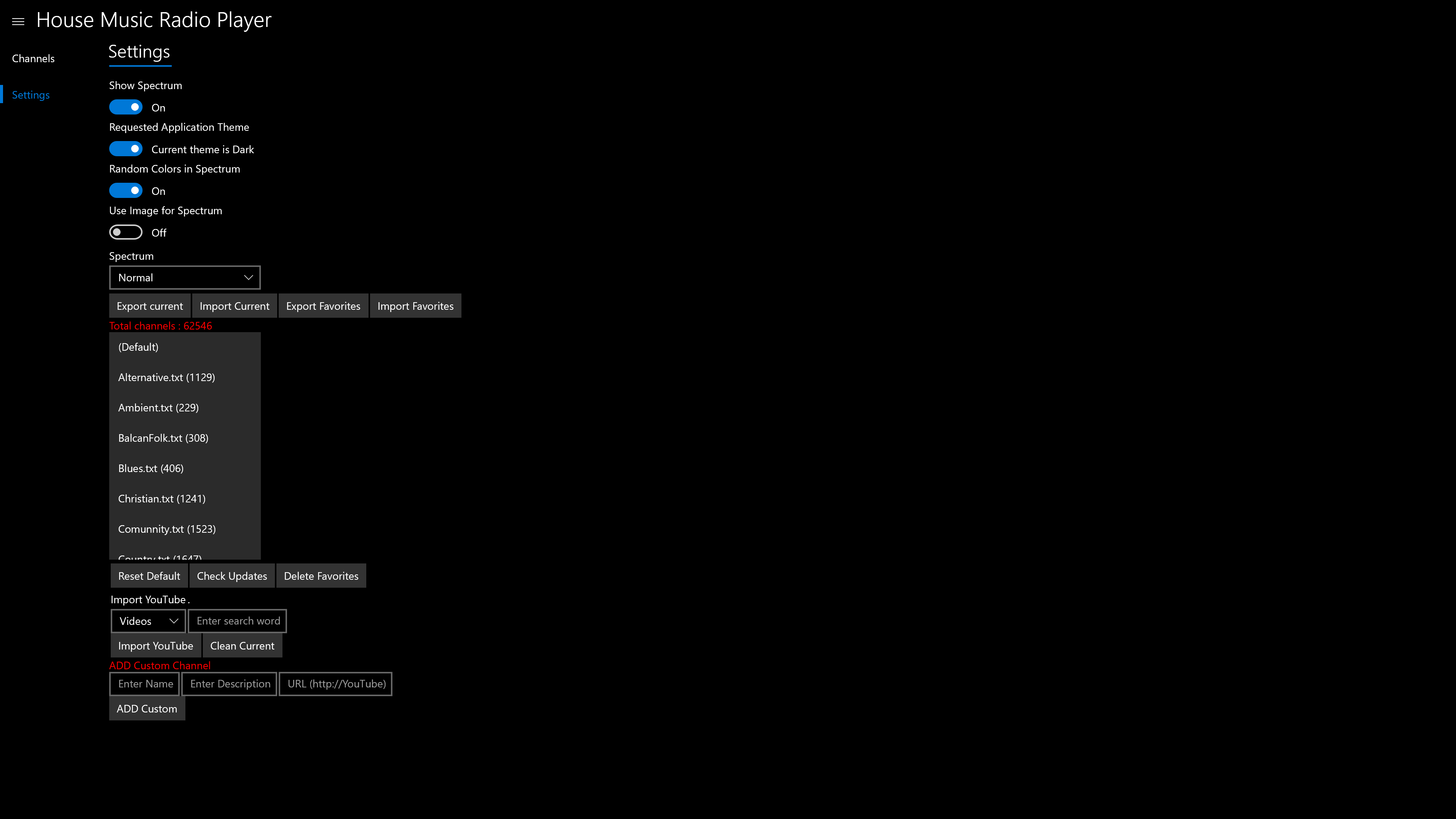 Added Custom channel under settings to merge with current station list. (Supports also YouTube).