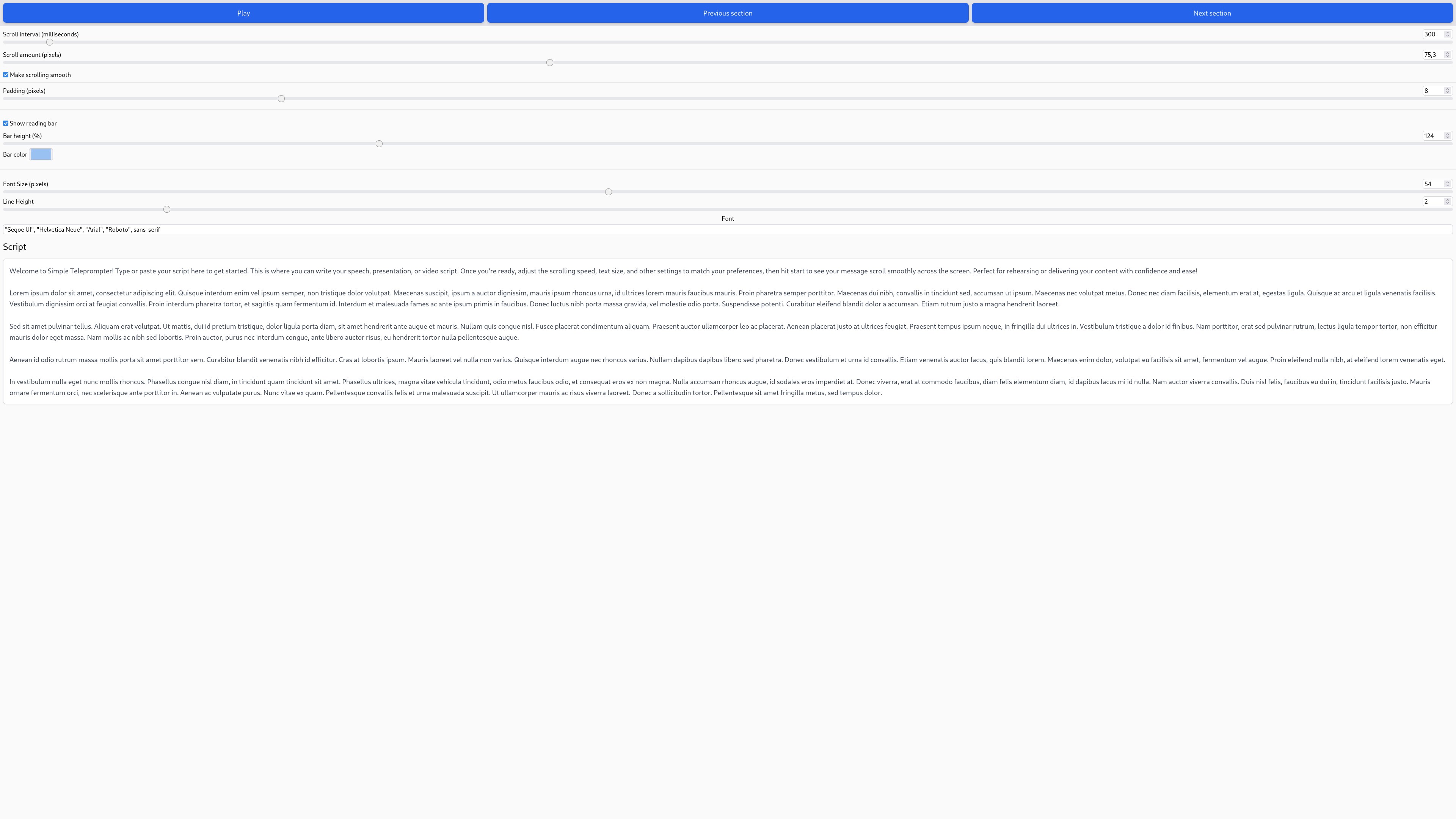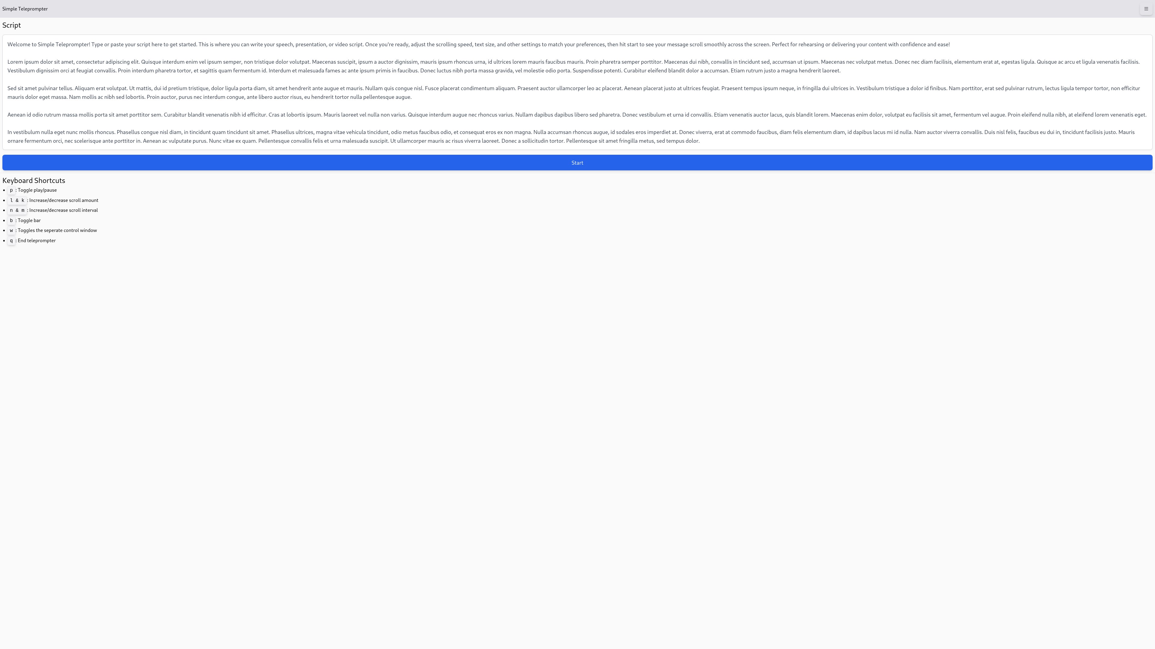 Simple Teleprompter is a lightweight, easy-to-use Progressive Web App designed to help speakers, content creators, and presenters deliver speeches or record videos effortlessly. It features a customizable scrolling text display with adjustable speed, font size, and color, ensuring a smooth and professional experience. Accessible from any device, it works offline and integrates seamlessly with modern browsers for ultimate convenience. Perfect for on-the-go rehearsals or polished presentations.