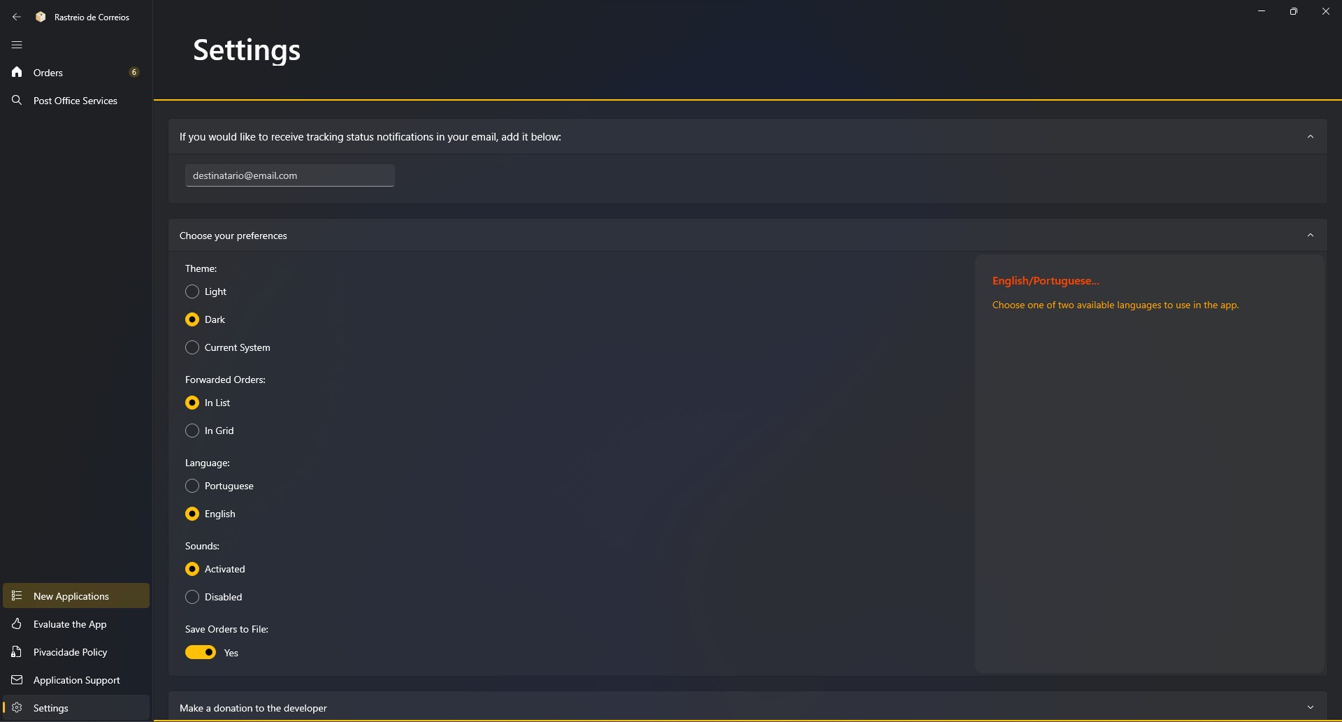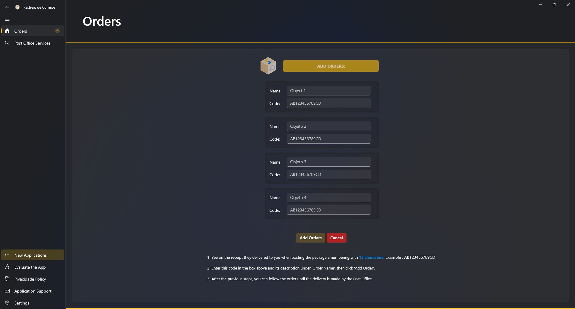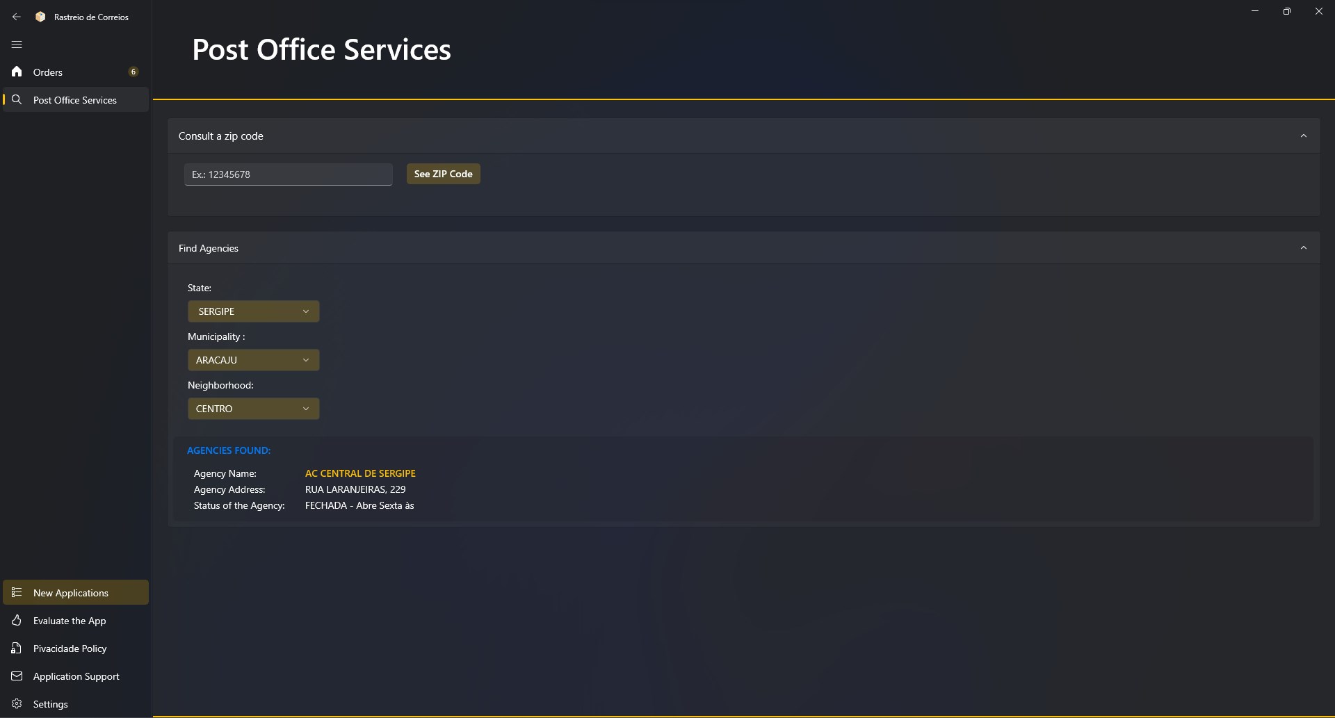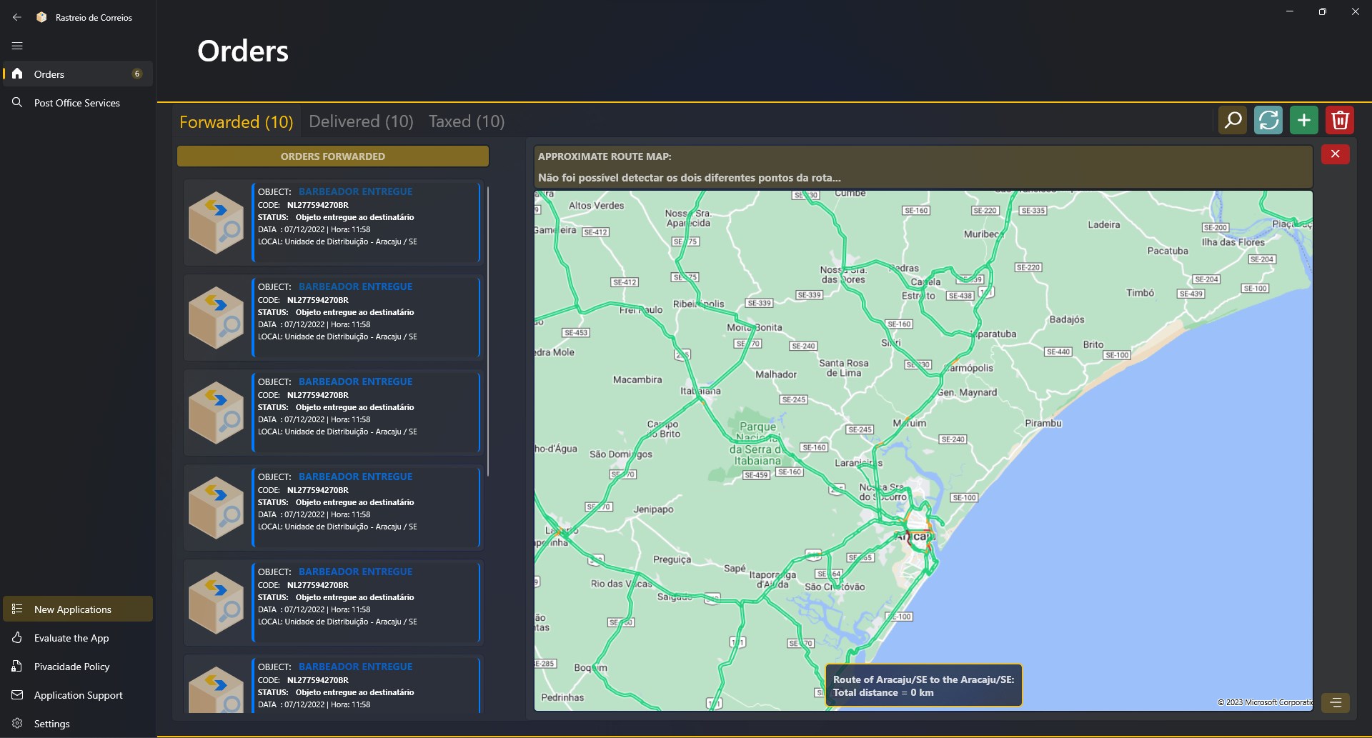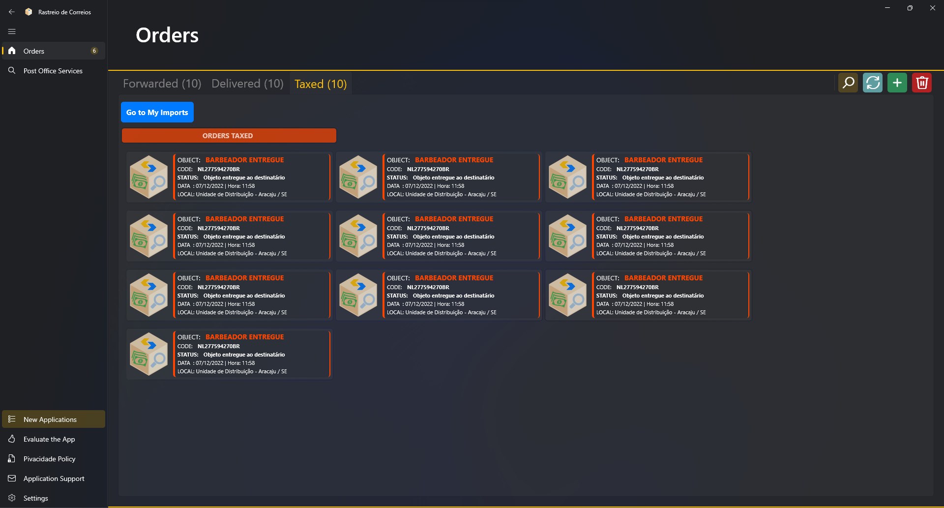 NotificationsOrder Tracking (exclusive to orders from The Post Office of Brazil)Light/Dark Themes.Map with approximate parcel routeShortcut to My Imports environment, post office, when needed.Add up to 5 Items at a time.Post search services. And much more...