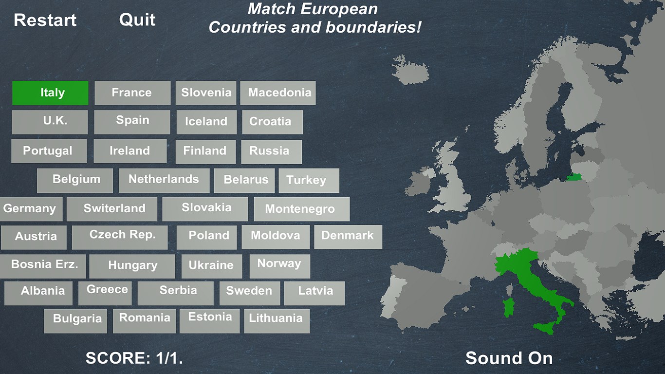 CountryMatchEu is an educational game that will test your geography skills. You will have to associate each country with its position in the map of each continent. First you have to click on the name of the country and then on the position on the map. If the match is right you gain a point. If it is wrong you gain an error. When you have clear the stage, you can see your score and the teacher comment. Try to guess the position of all the nations of Europe and check out your knowledge of political geography.