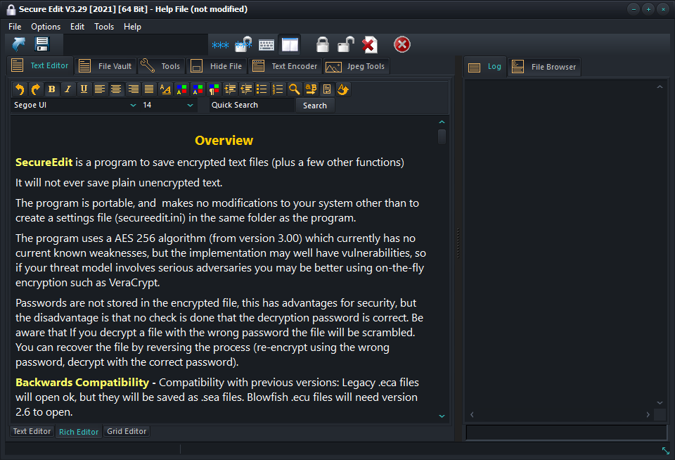 Save encrypted textSave encrypted rich text (bold, colors, fonts etc)Encrypt filesSave encrypted files in several different formats, including some steganographically hiddenCreate encrypted storage (file vault)Copy and encryptMonitor folder and encrypt incoming filesHide files in other filesEdit hidden filesClean Jpeg images of meta data, and other identifying markersCreate encrypted text that can be copy and pasted into messages and emailsMany other small utilities such as secure delete temp folder and recycle bin, randomize file dates