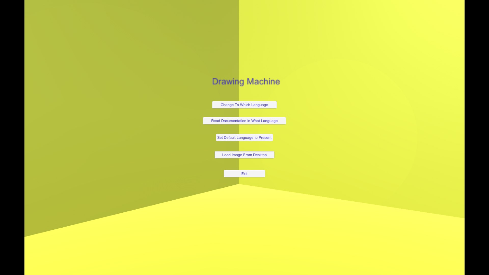 To change the display language (the language in which the commands are printed and which you read while using Durer Drawing Machine) to English, click Change To Which Language. Then select English. Then click Set Default Language to Present. This will now cause the game to boot (whenever you DO boot) in English. You follow the same process to set the display language to something other than English. Durer Drawing Machine does not use, rely, depend on, or care about your present locale. You do not need your locale already set to your preferred language.
