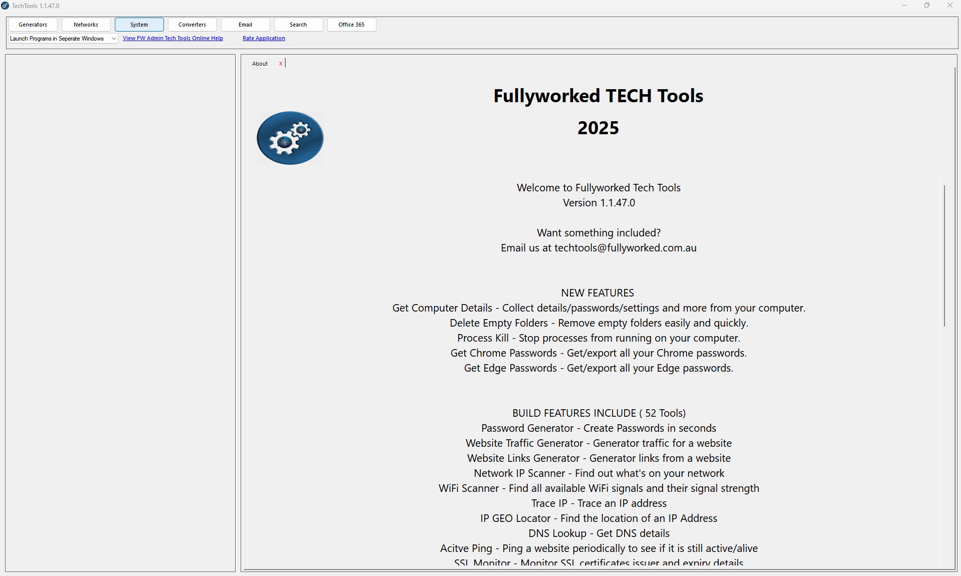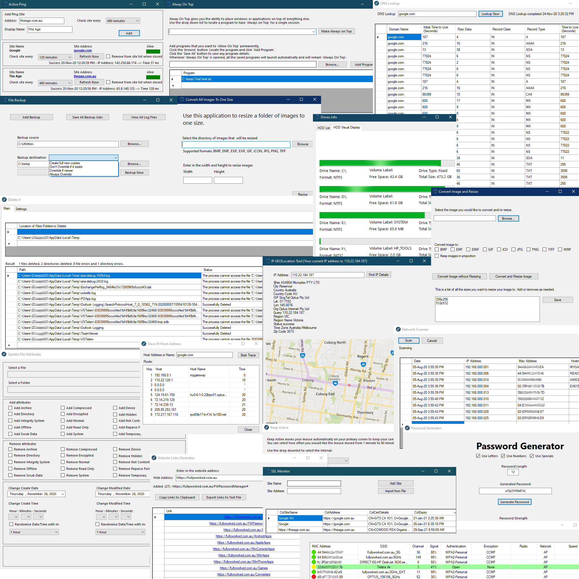 ConvertersBackup UtilitiesGeneratorsPassword ToolsScannersMonitorsDeletion ToolsSystem InfoTracersSSL / DNS ToolsNetwork ToolsSystem ToolsFile UtilitiesWeb ToolsKeep ActiveAlway On TopBatch ToolsIP GEOLocation ToolSystem InfoMicrosoft Office Tools