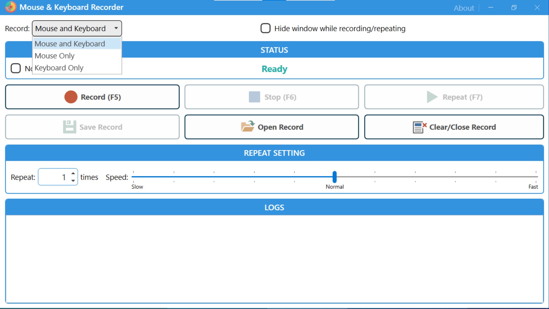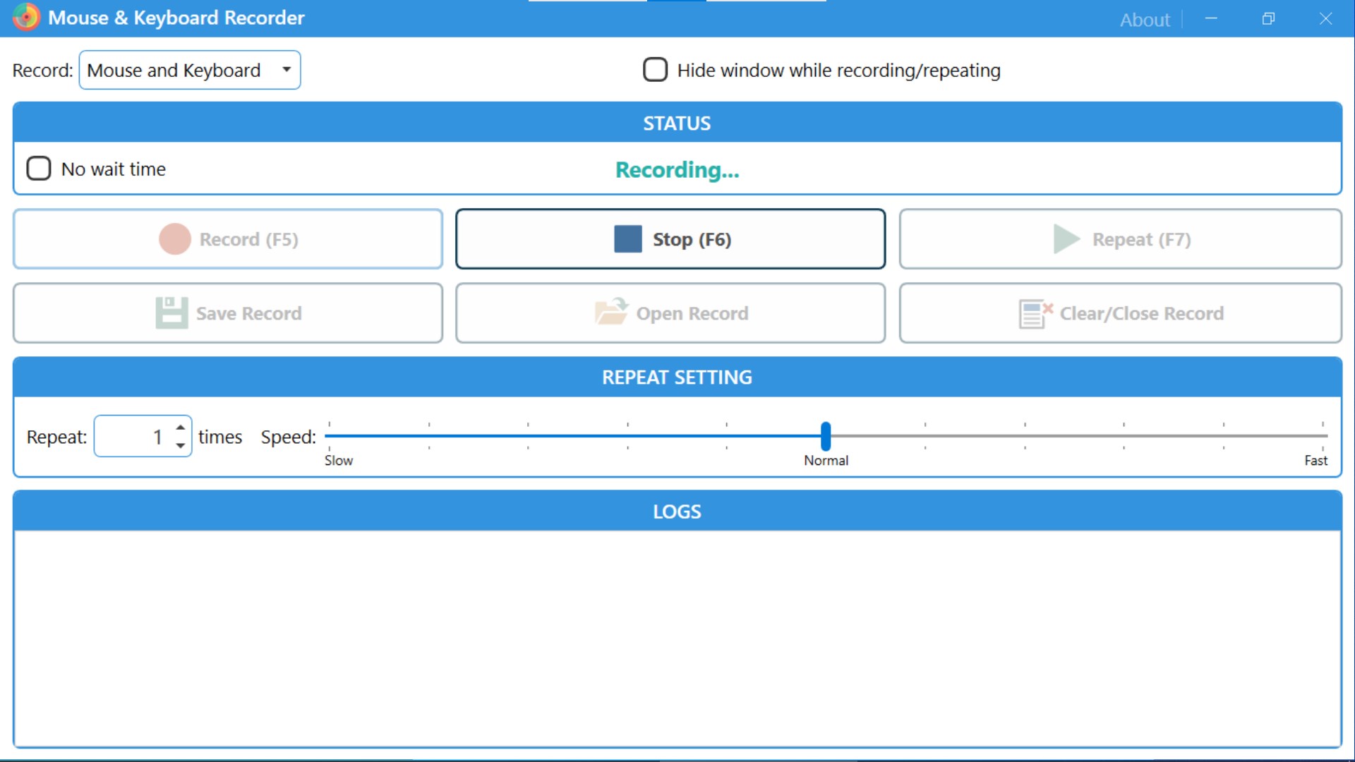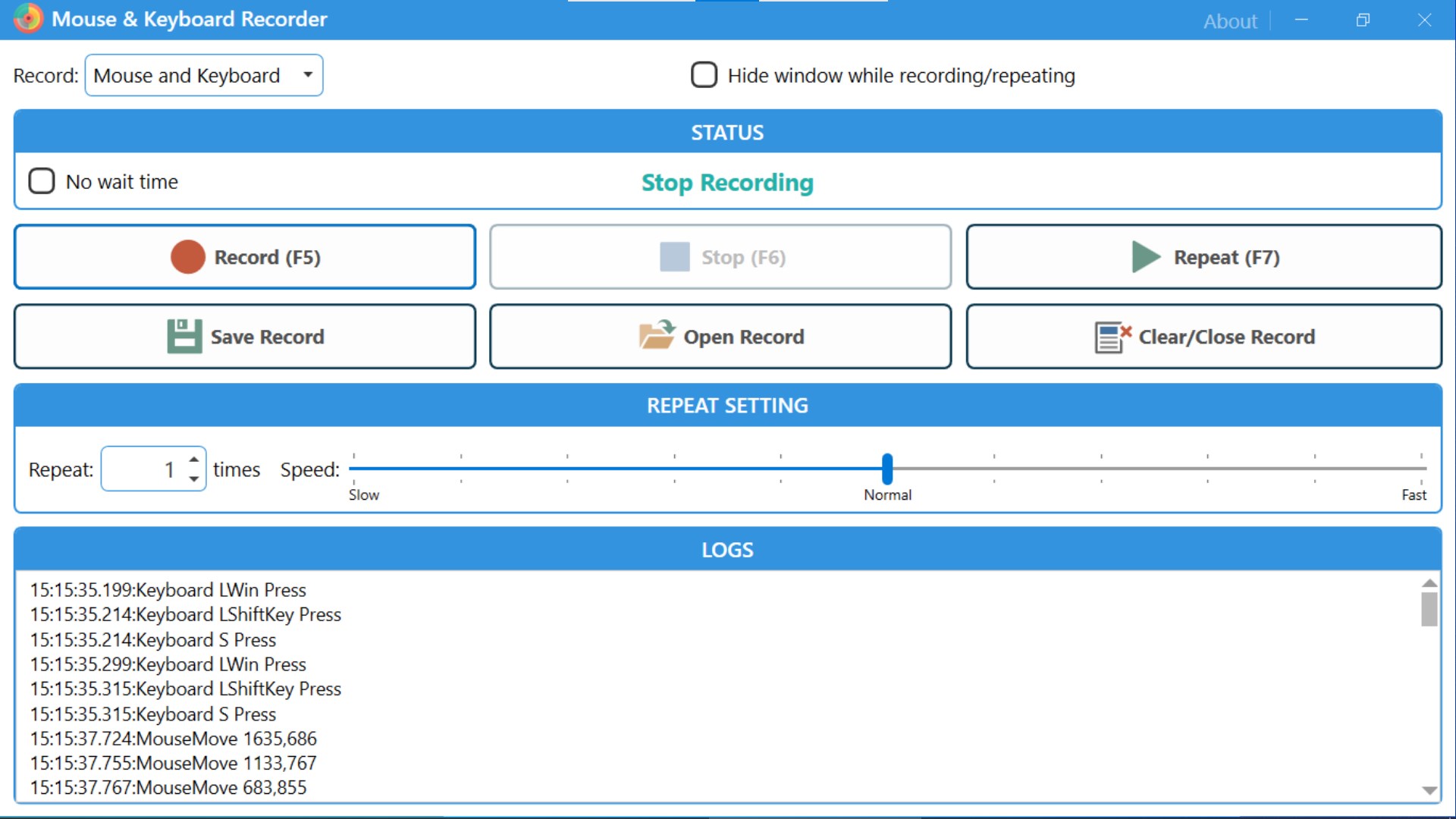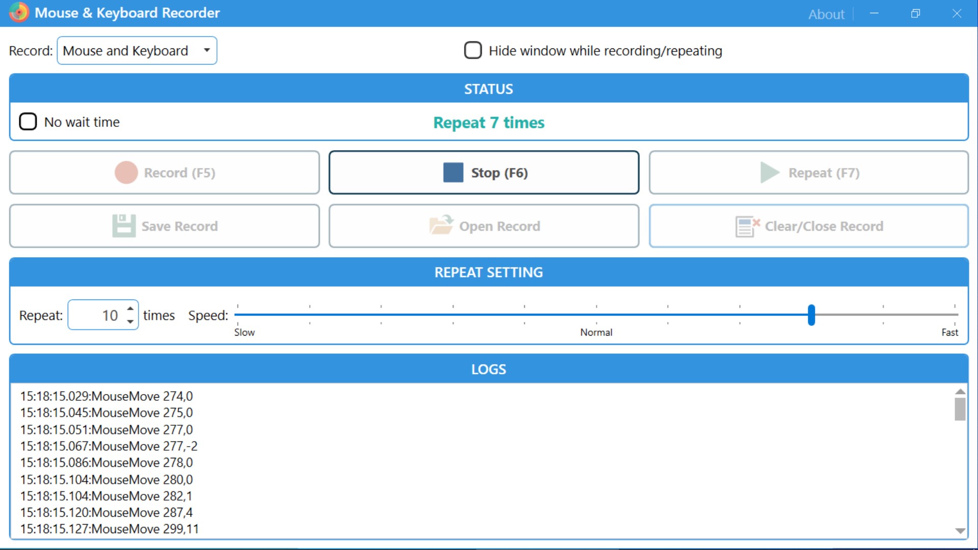 Record all mouse and keyboard activities and repeat accurately.Hotkey support: F5 (record), F6 (stop recording/repeating), F7 (repeat).Support setting repeat times.Support setting repeat speed.Can stop recording/repeating any time.Can hide window while recording/repeating (optional).