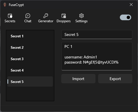5. Data Backup and Confidentiality: Allows for exporting encrypted data as a backup precaution and importing it into any FuseCrypt application.