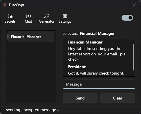 FuseCrypt combines industry-standard cryptographic algorithms to encrypt sensitive data. It also offers end-to-end encrypted communication, allowing users to securely communicate on a local network.