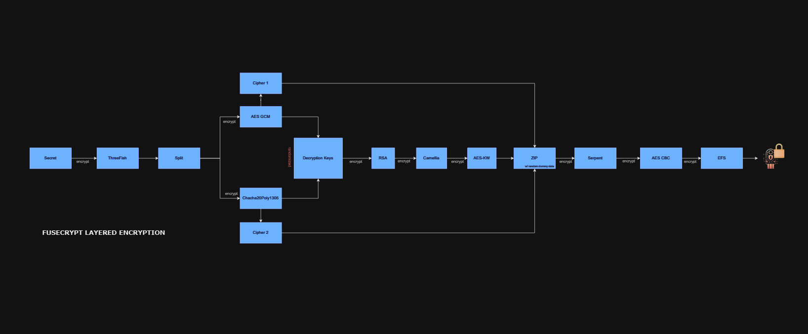 1. Advanced Cryptography: Utilizes ThreeFish, RSA 2048-4096, AES 256 GCM,/CBC, Serpent, Camellia, Chacha20poly1305, PBKDF2, ECDH P-521 and ECDSA 521.