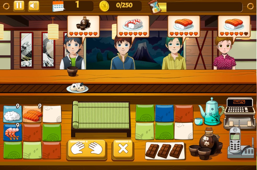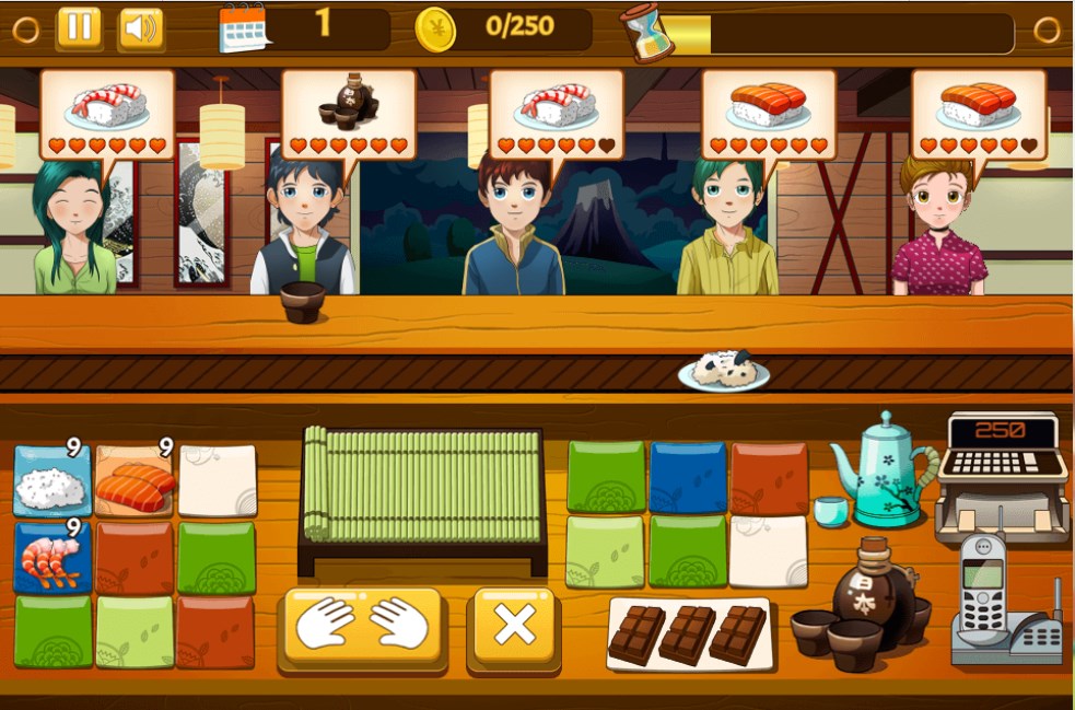 Speed up! Run the best Sushi Shop and prepare delicious meals for every Japanese food lover! Check the recipe and serve the customers their favorite sushi.