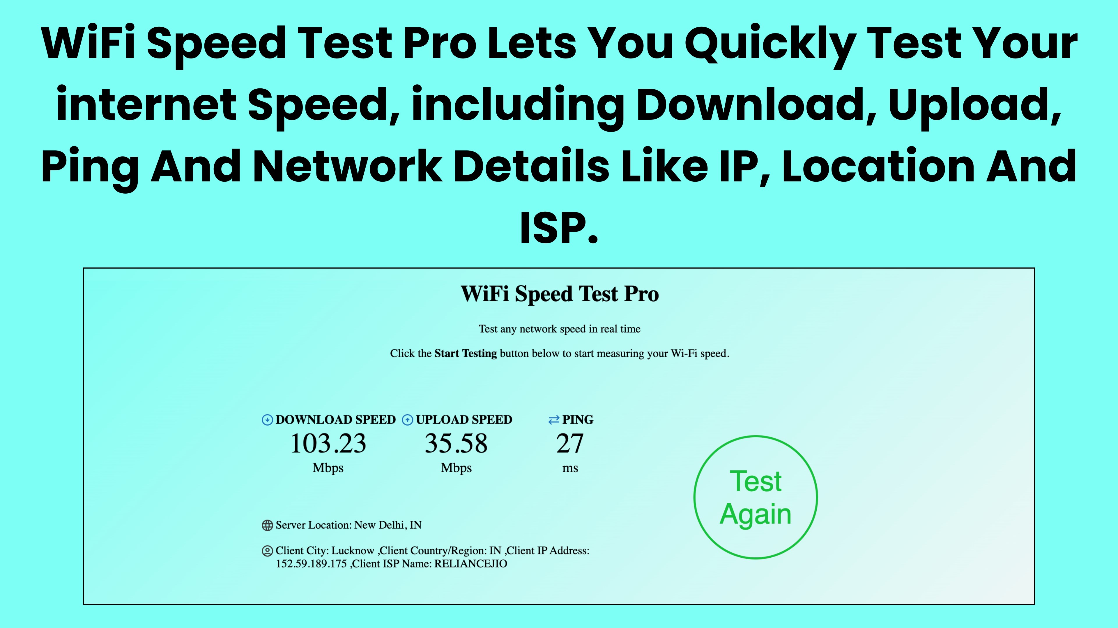WiFi Speed Test Pro is the ultimate tool to test your internet speed with accuracy and ease. Run a WiFi Speed Test to check your download speed, upload speed, ping, and network performance in real-time. This Network Speed Test also displays your IP address, city, country/region, and ISP name, giving you complete insights into your connection.