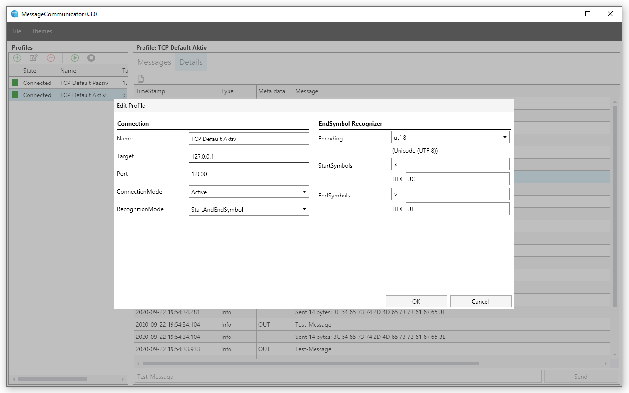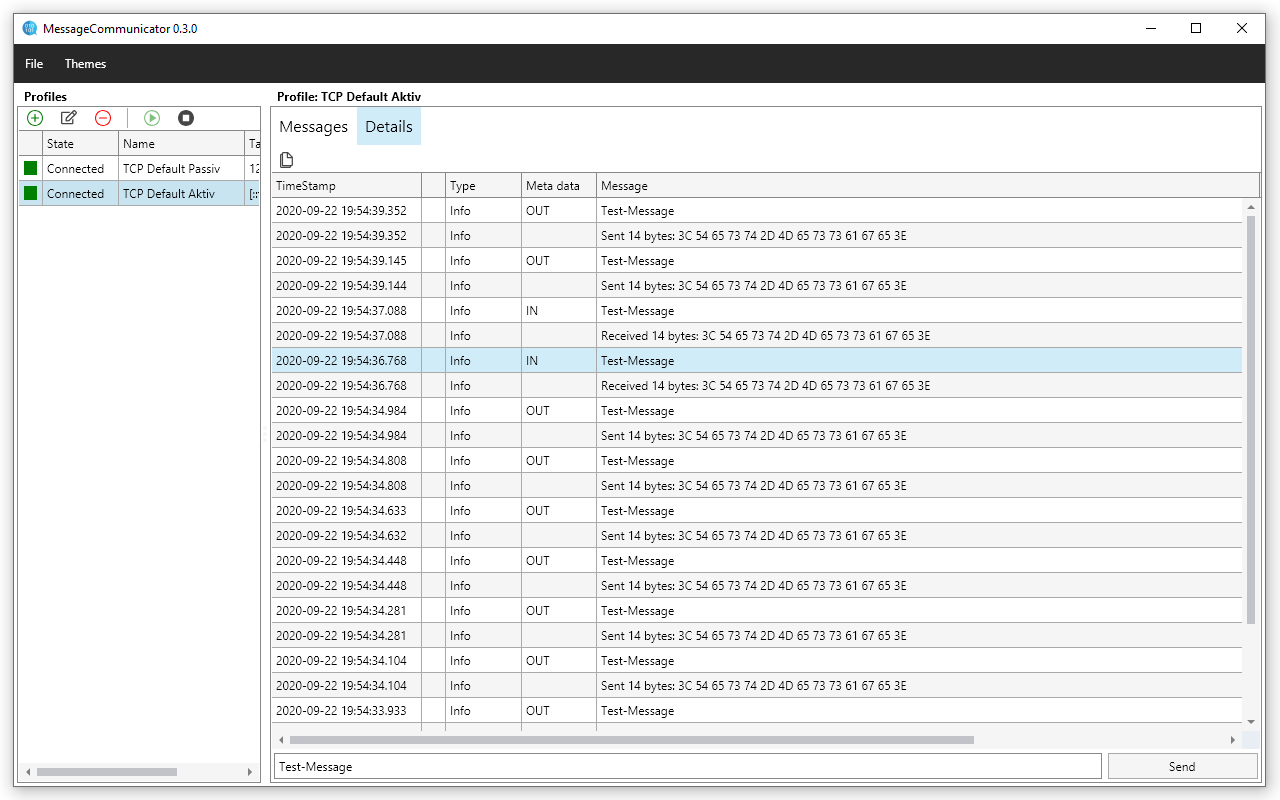 Message Communicator is a testing Gui for message-based communication. It is meant for scenarios when you want to test communication with other devices or software when communication is based on simple readably messages. Message recognition is configurable and supports modes like 'Fixes Length' or 'End Symbols'. Currently only TCP is supported but may be expanded in the future by UDP or by Serial Port.