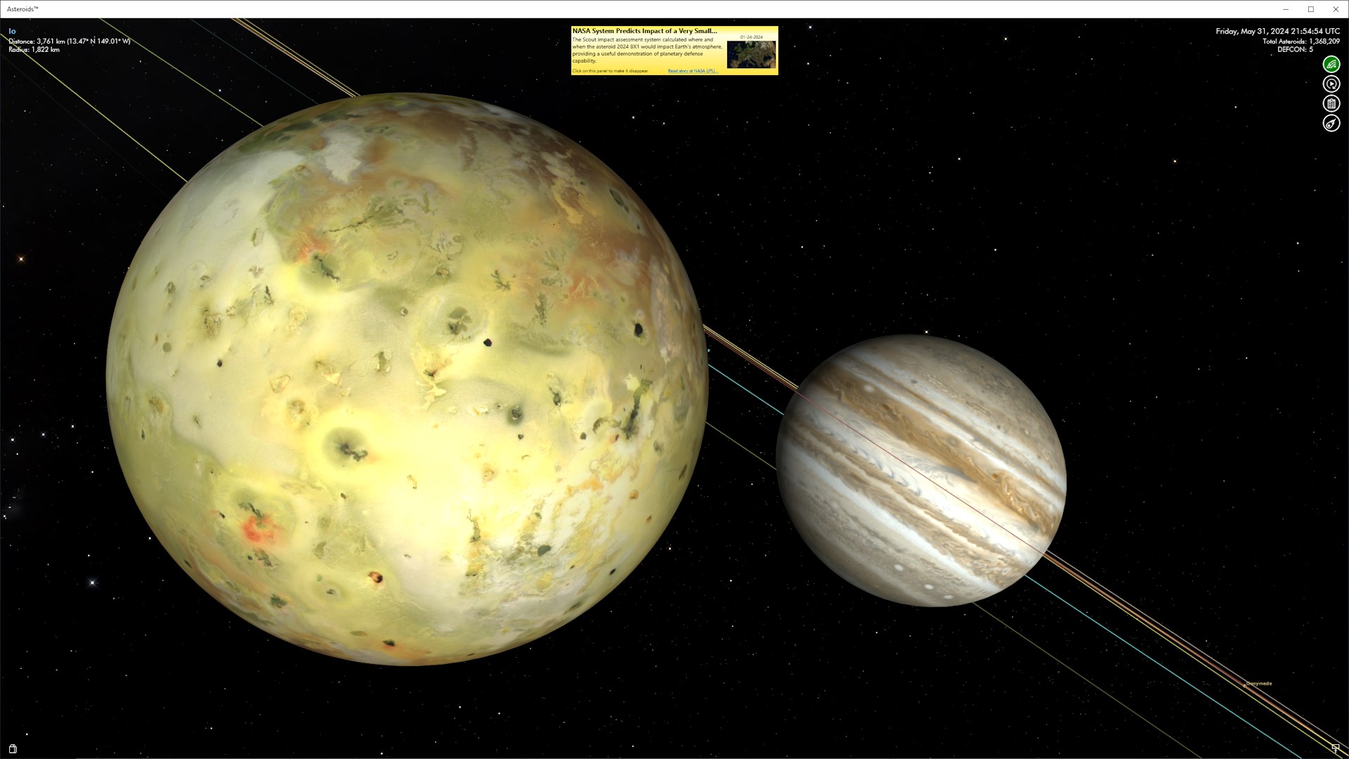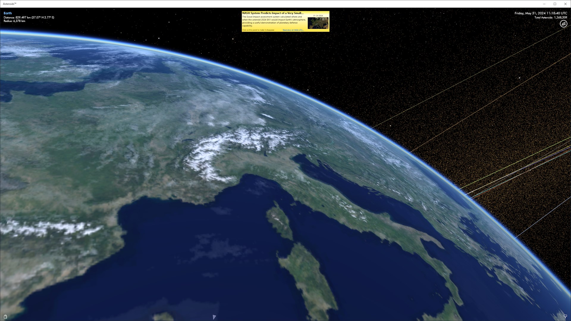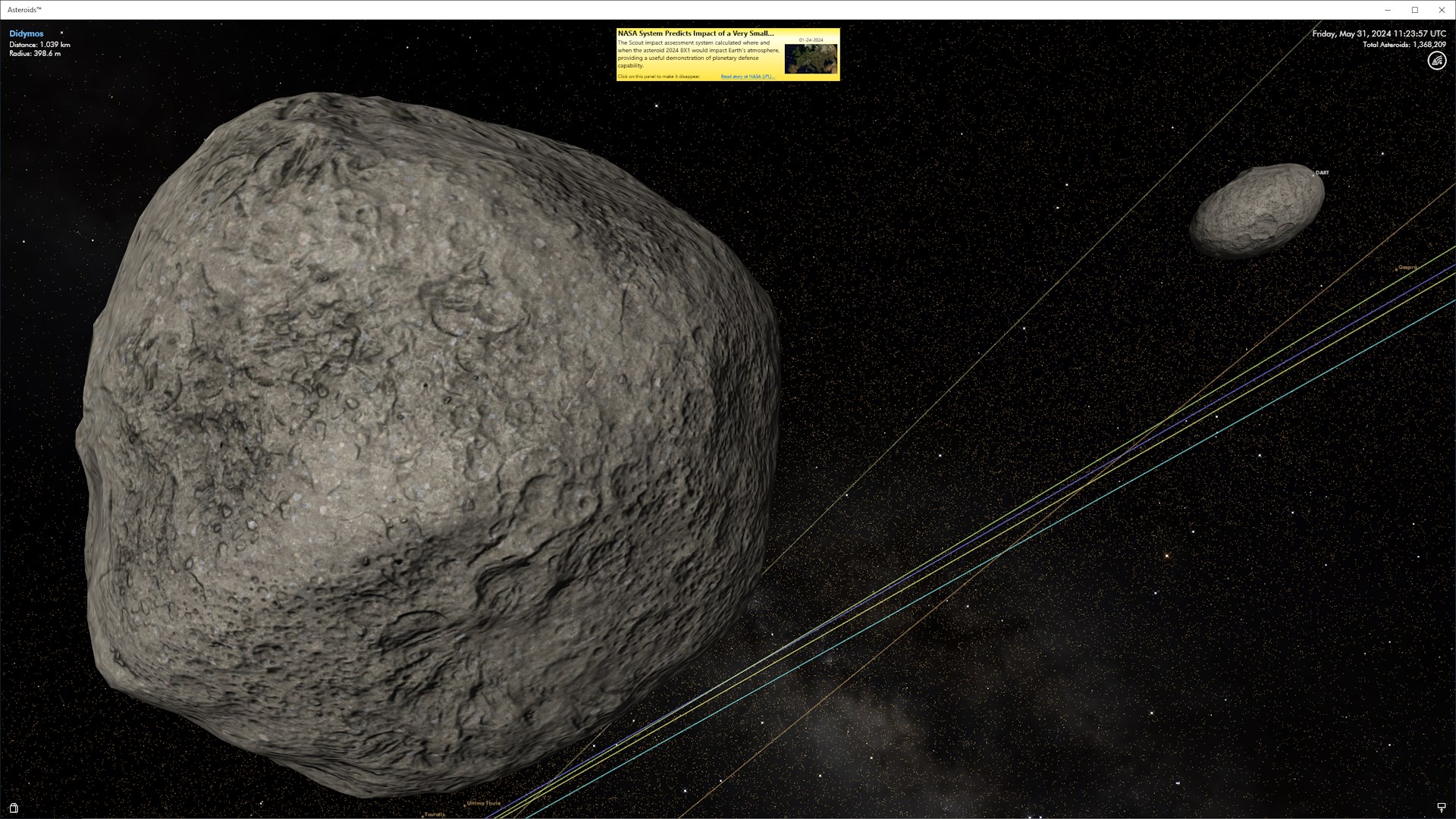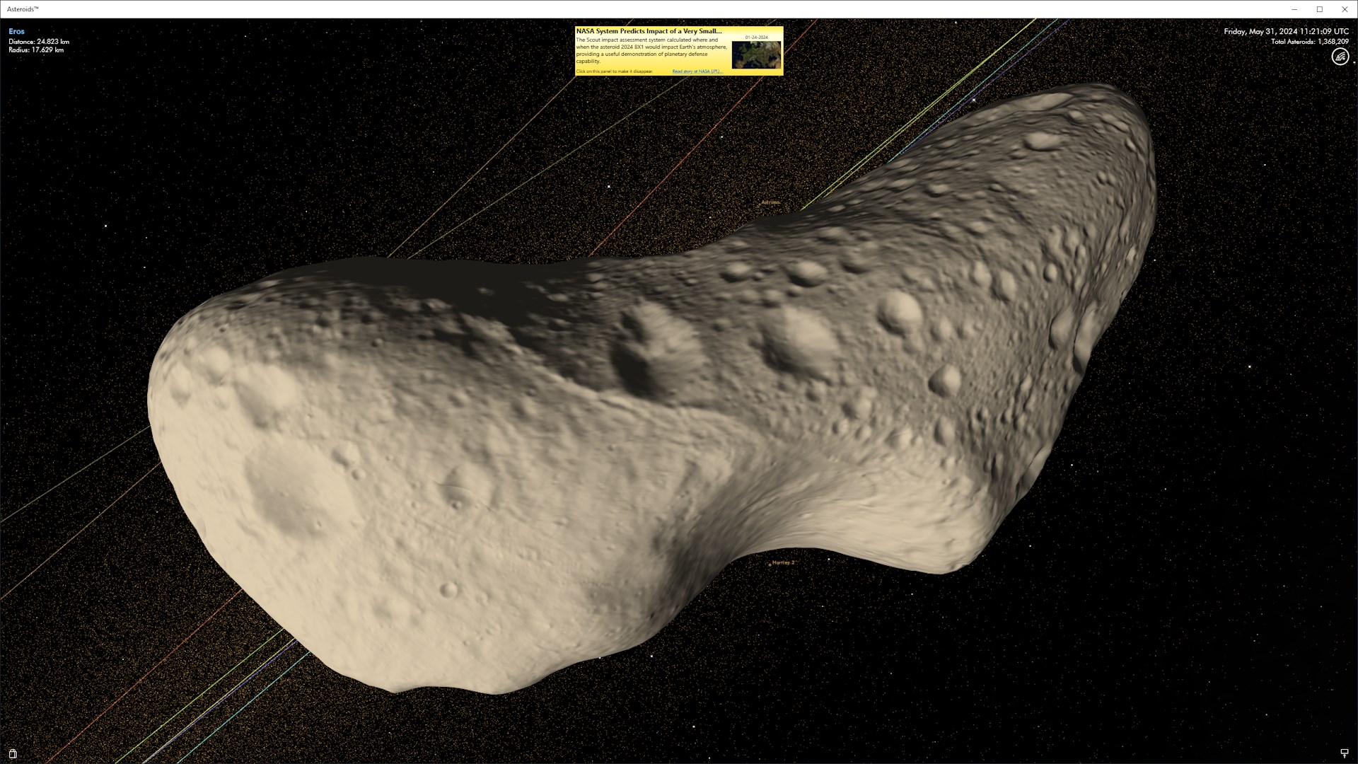The Asteroids™ application gives you the means to monitor the position and trajectory of all known asteroids in our Solar System. To achieve that, it constantly calculates and updates the orbits of more than 1,400,000 asteroids (data obtained from NASA's Jet Propulsion Laboratory). For NEOs, the data is aligned with the 'Center of Near Earth Objects Studies' (CNEOS).