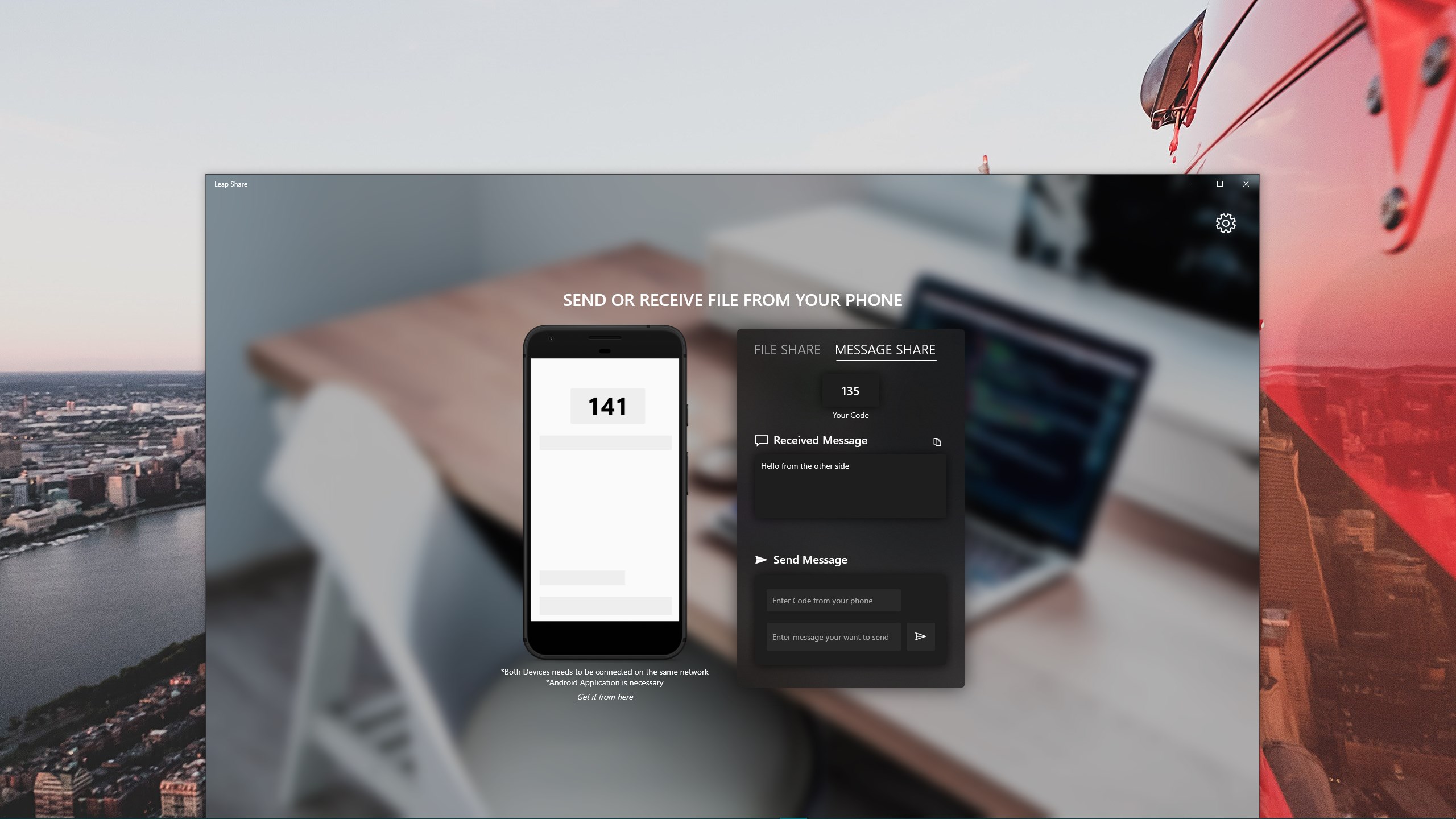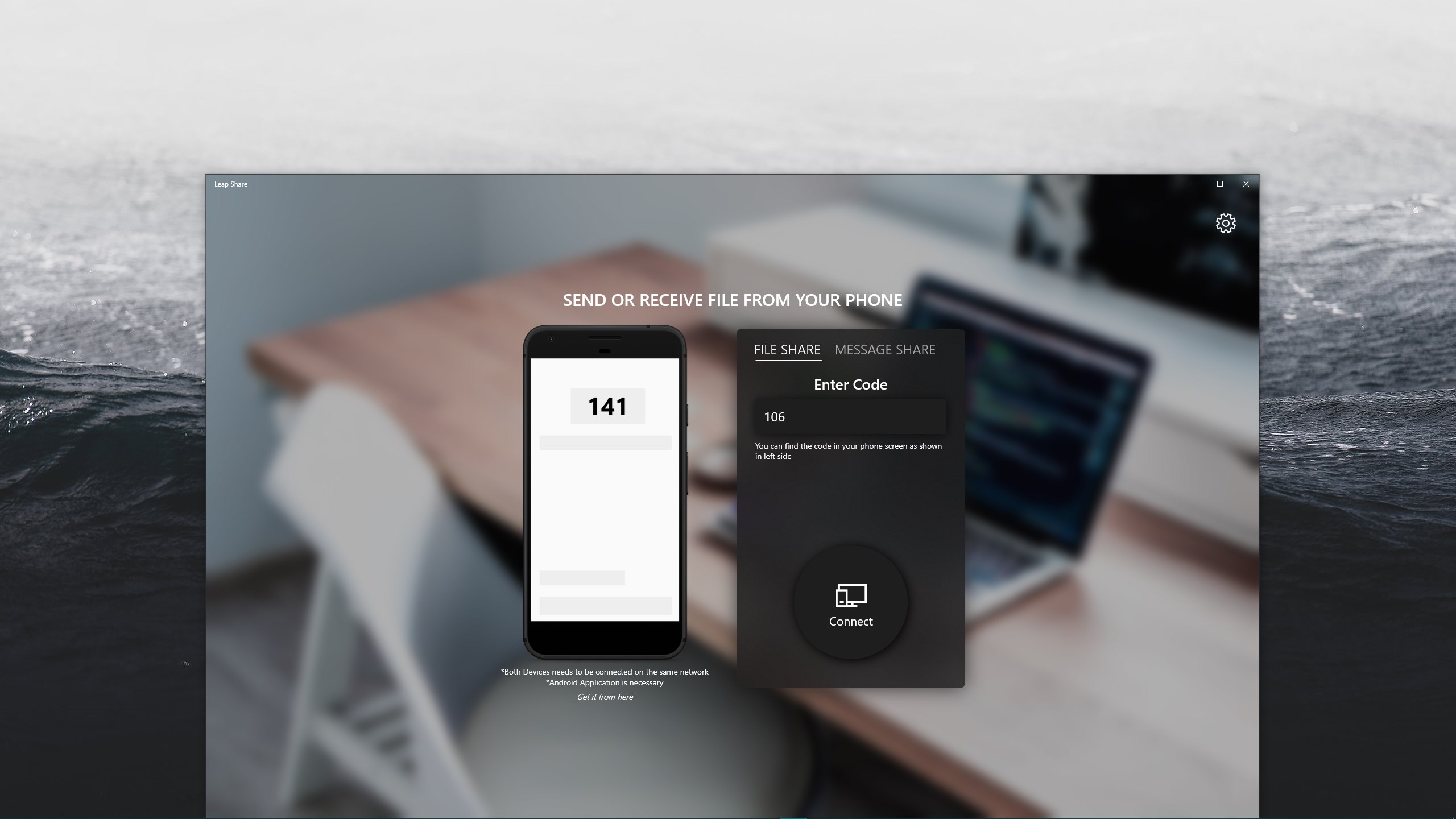 Leap Share lets you share Photos, Videos, Documents, Files etc and even text messages with blazing fast speed between your Android phone and PC over Wi-Fi. If your PC does not have Wi-Fi but has an ethernet connection, don't worry. We've got you covered. Leap Share also works on Ethernet connection.