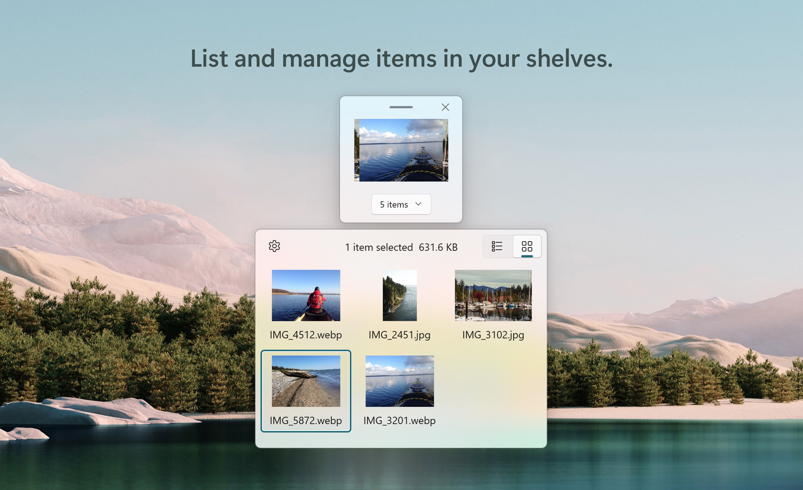 Shelves can hold files, folders, documents, images, videos, multimedia, URLs, web images, and even text snippets.
