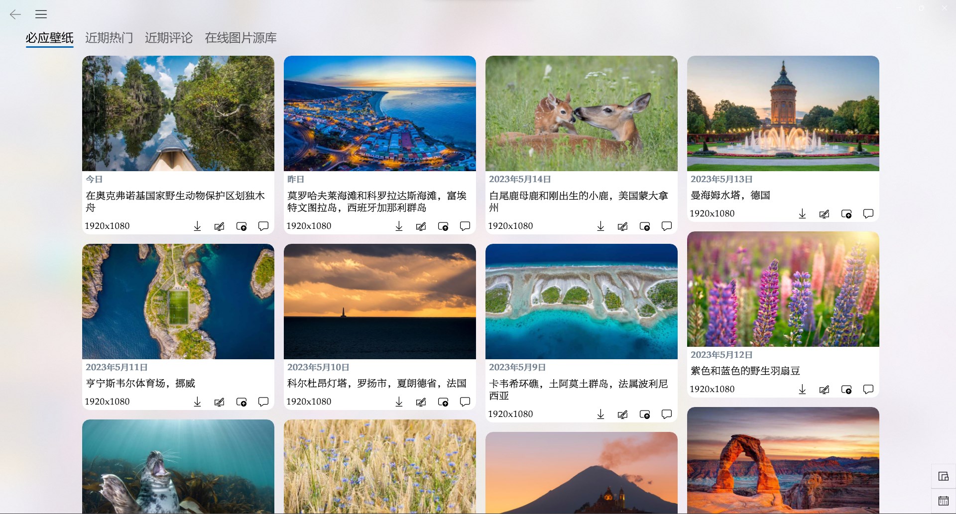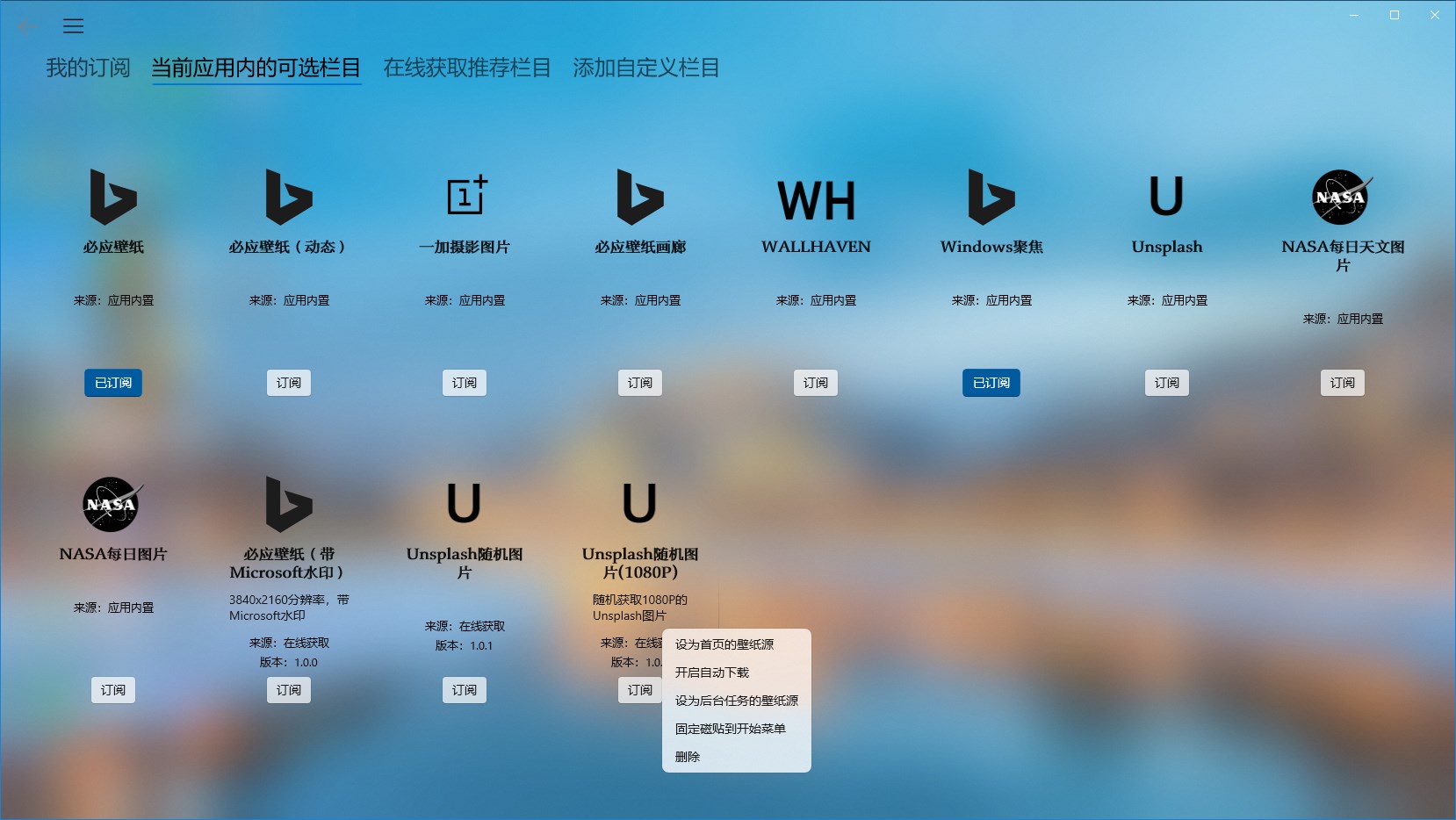 现已支持必应、一加、WallHaven、NASA等多个图片源。同时也支持导入并自由配置图片源。