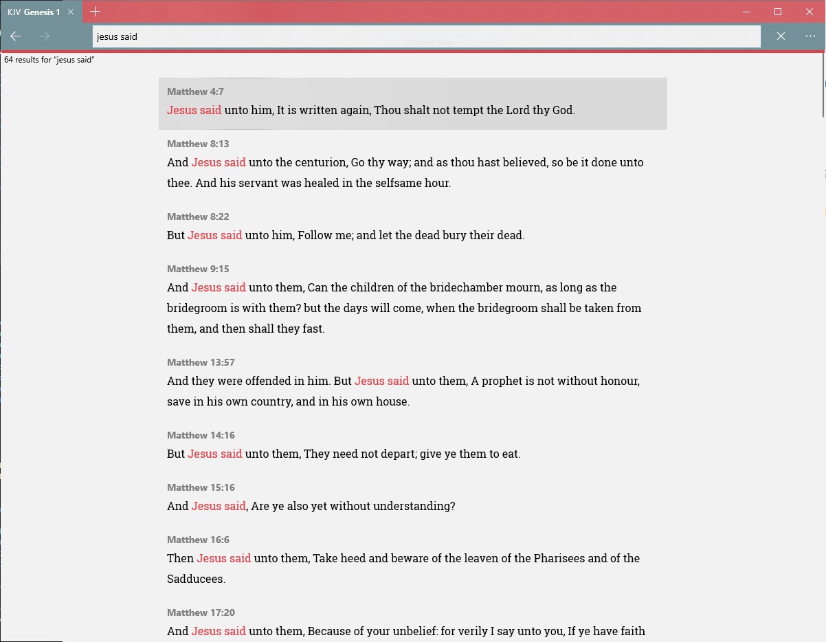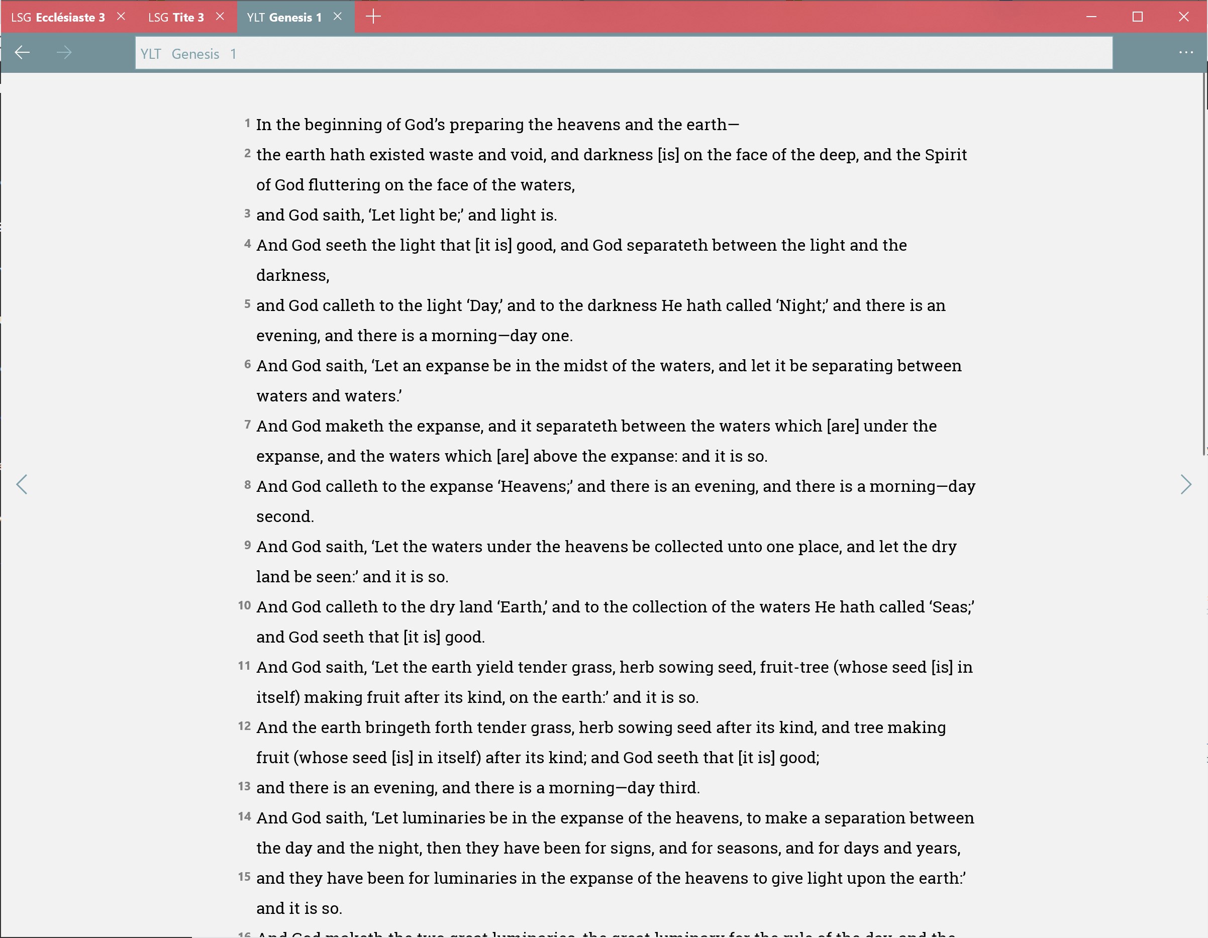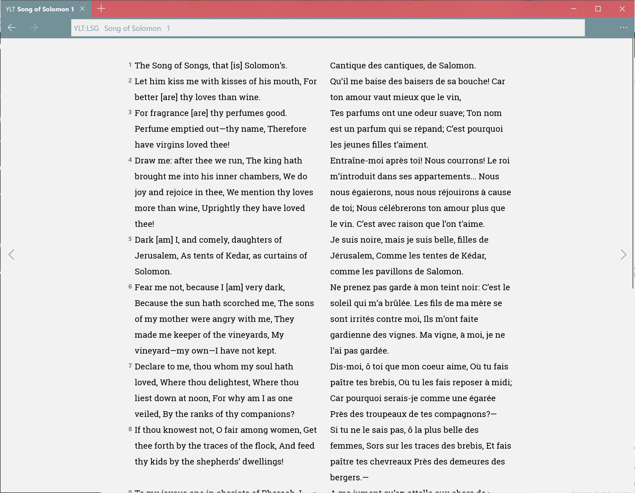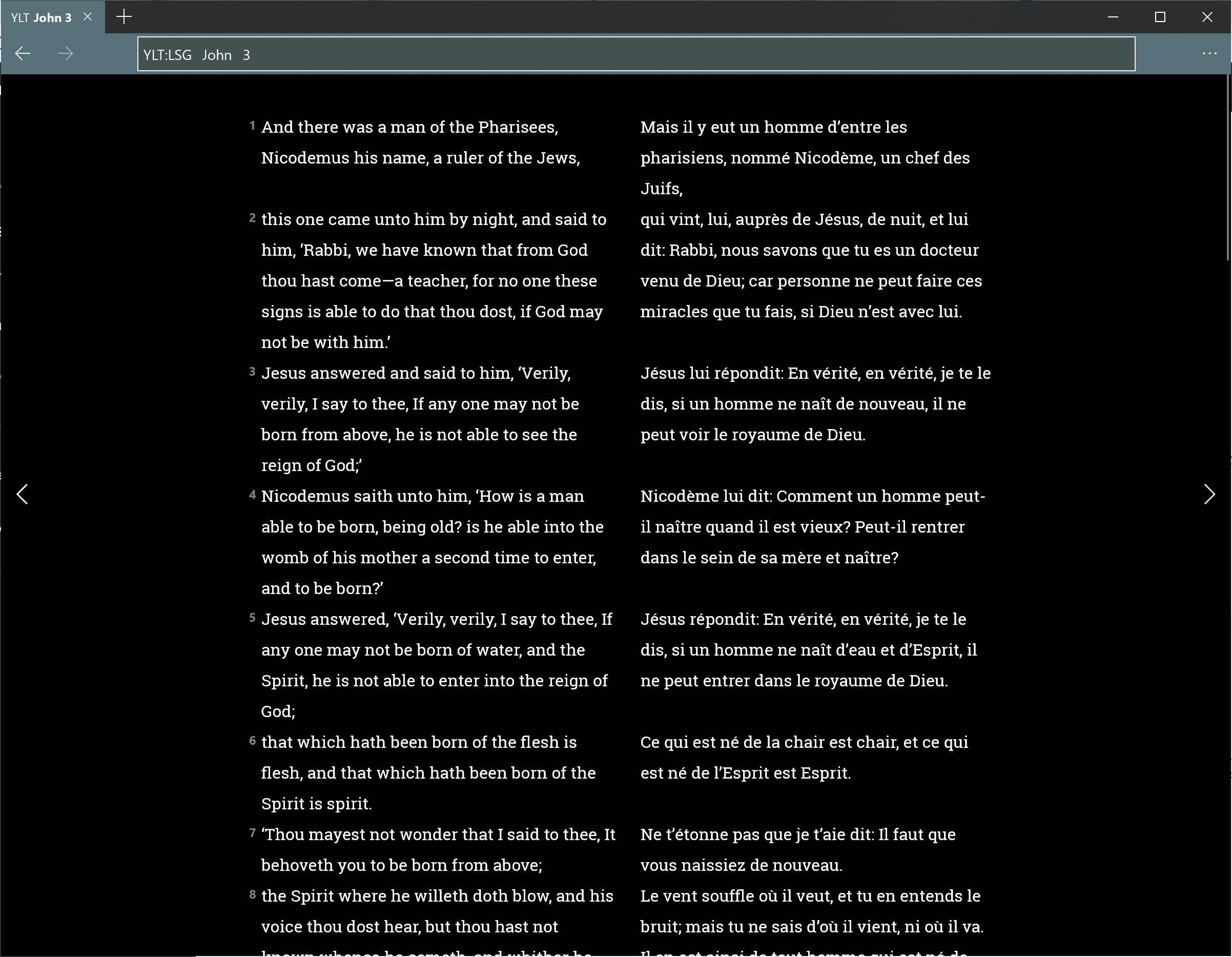 A fast, offline Bible browser that allows easy reading and search. Includes the King James Version, Young's Literal Translation, Louis Segond, and French Darby translations of the Bible.