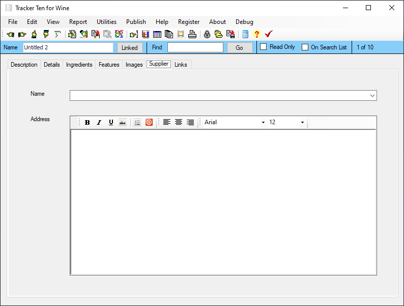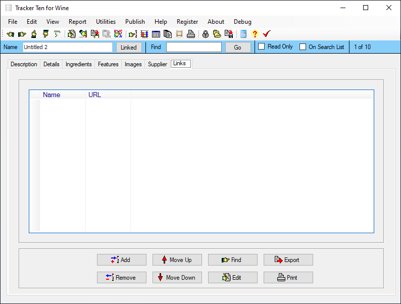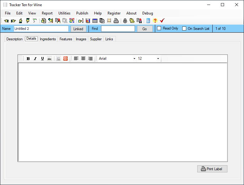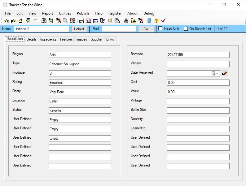 Tracker Ten for Wine is a full featured database system that keeps track of your wine collection. It features a powerful search engine, a versatile report writer, easy data entry, barcode generation and scanning, context sensitive help, full customization, data graphing, multiple image support and much more. The software is very easy to use.