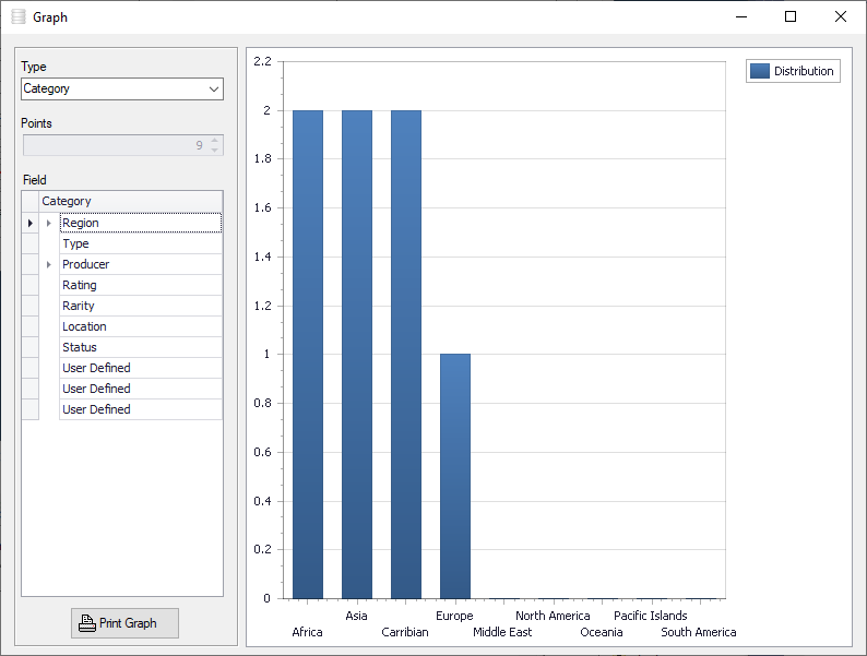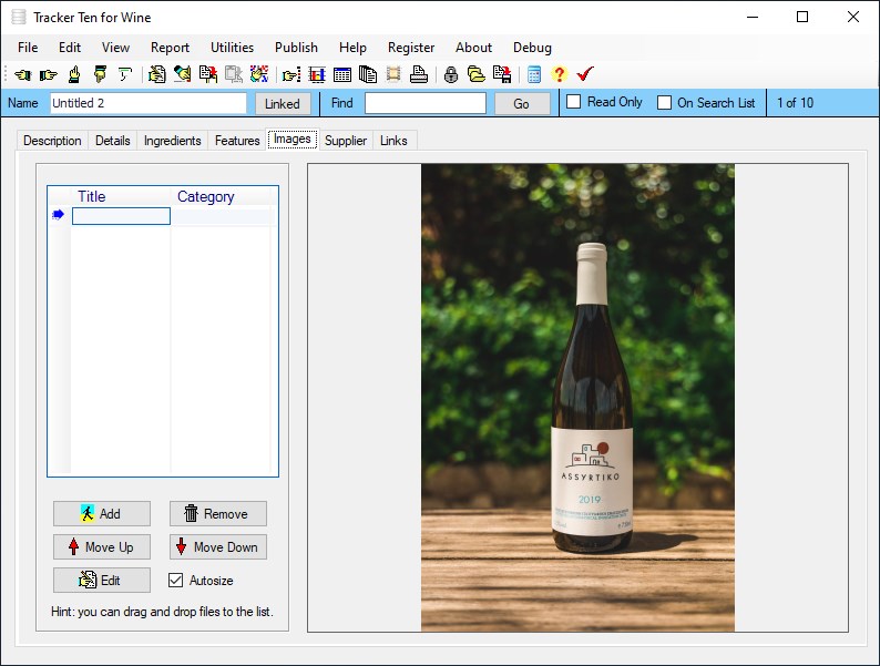 Sample fields include region, type, producer, rating, rarity, location, status, barcode, winery, date received, cost, value, vintage, bottle size and quantity.Very easy to learn and use.Online help file.Numerous user defined fields so you can setup the software to suit your exact needs.Number and Date reports showing upcoming reminders.Rich text format notes areas for customer details and notes.30 Customizable feature tracking check boxes.Supplier name and contact information tracking area.Advanced multi-level nested item categorization system.Rich text format notes areas for each record.Powerful Data Sorting and Filtering.Multiple Image Support (up to 100 pictures for each record !). All major image types are supported (i.e. bmp, jpg, gif, png etc.)Easily incorporate pictures from your Digital Camera or Scanner. Also attach and view PDF equipment manual files in Image area.Full color image reports.Powerful and Intuitive Search Functions that let you quickly and easily retrieve the data you need Comma delimited data import.Multiple Data Views Including Spreadsheet, Album View (allowing you to visually view different items in your inventory side by side) and 3-dimensional full color Graphs showing inventory breakdown.Data export features allowing you to transfer data to spreadsheets or other software programs.