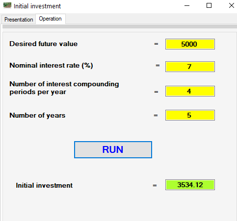 This program determines the initial investment required to obtain a given future value after a given period of time. We must indicate the desired future value, the annual number of compounding periods of the interest, the duration of the investment and the