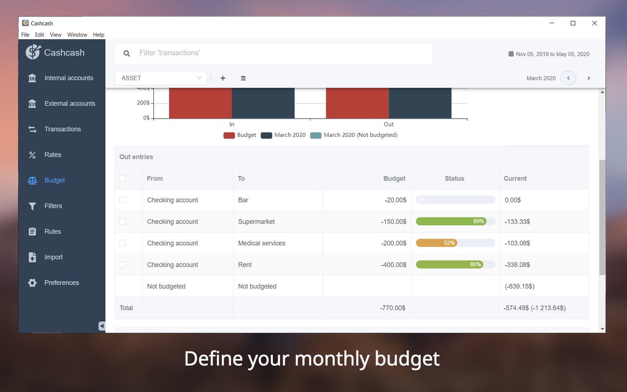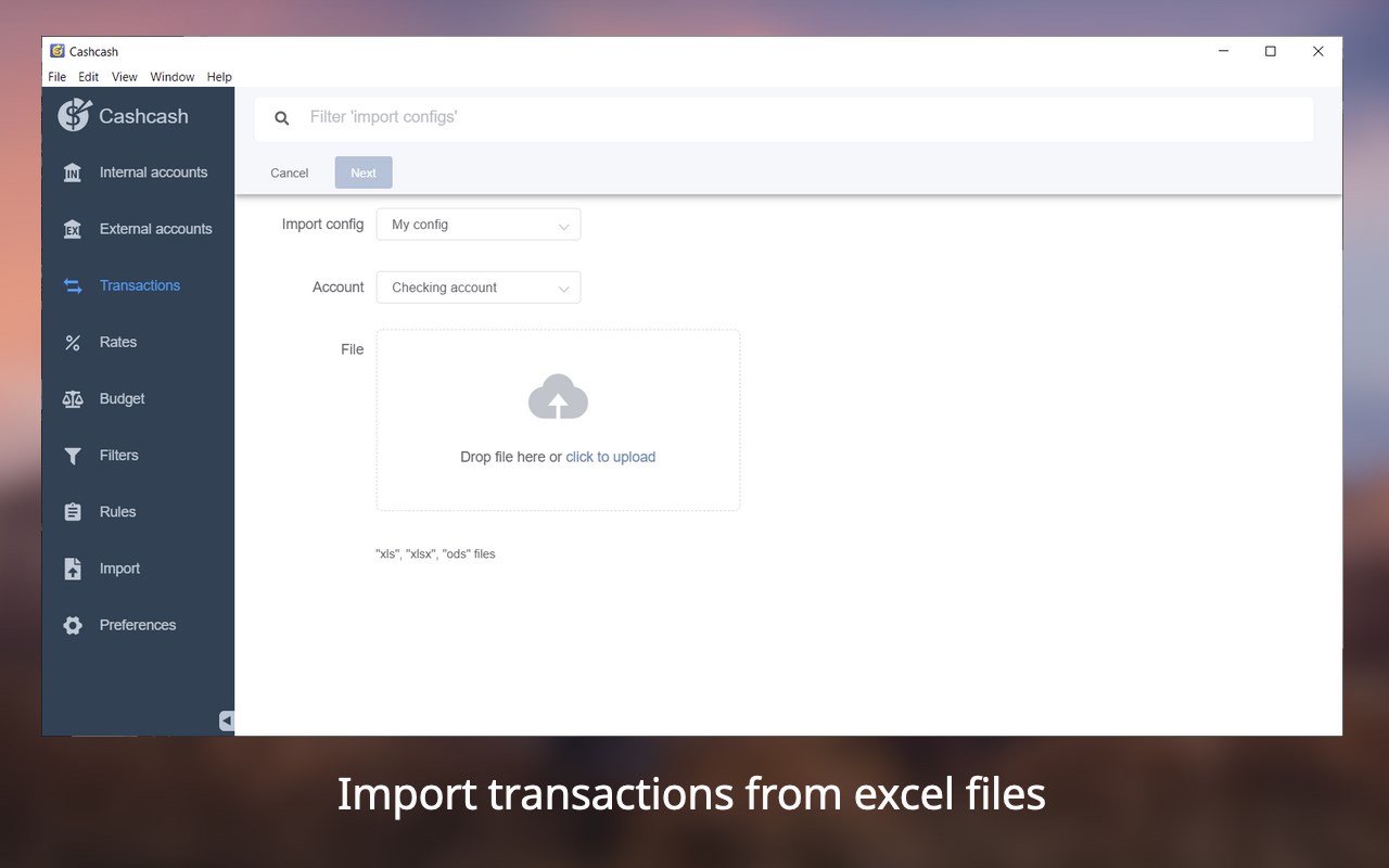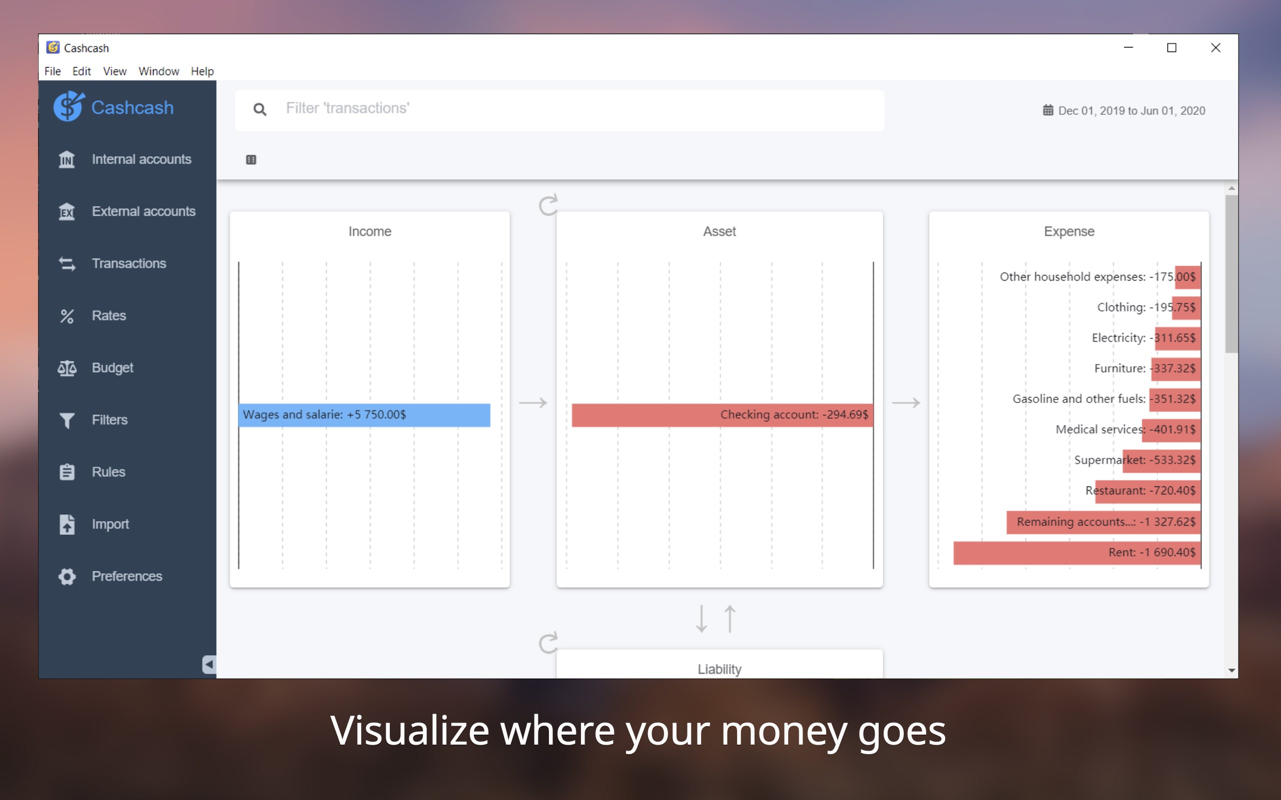 ChartsDouble-entry bookkeepingMulticurrency supportTree structure accountsUnlimited transactionsUnlimited accountsFiltersDatabase import/exportAutomation rulesBulk transactions updateBudgetXLS, XLSX, ODS and CSV import
