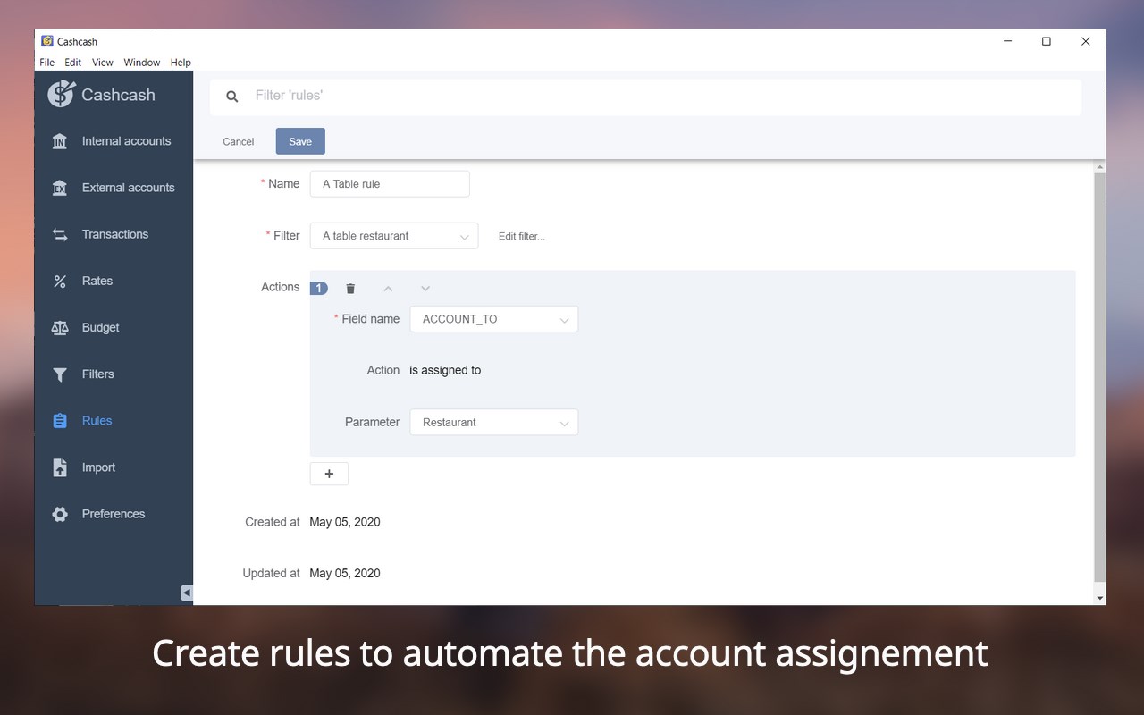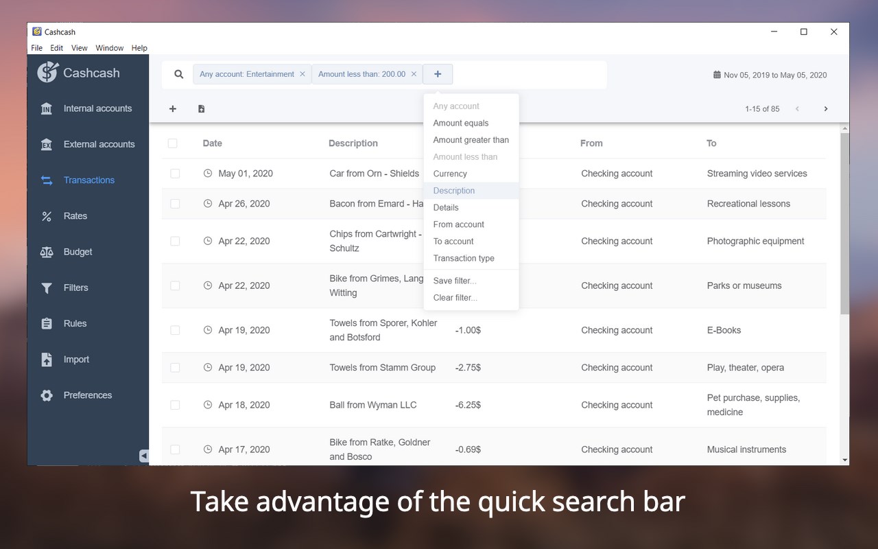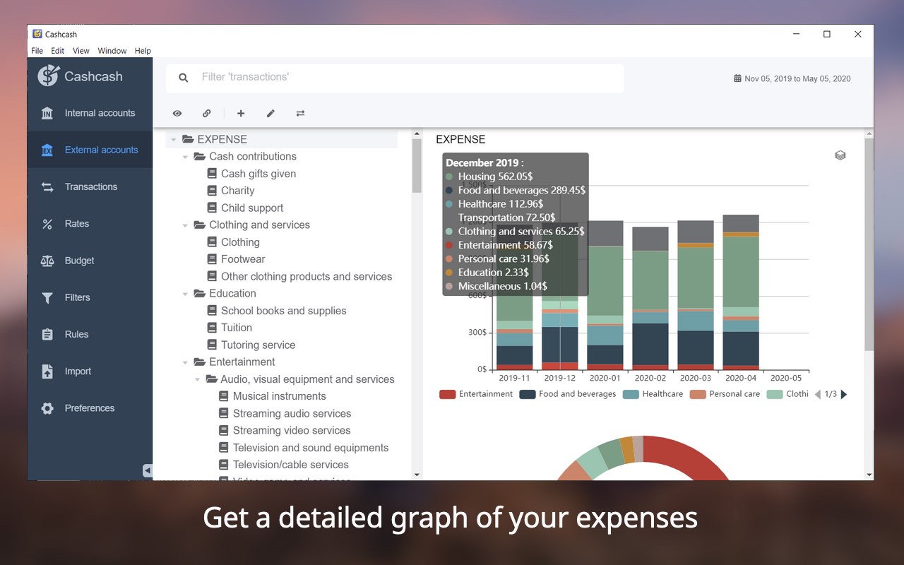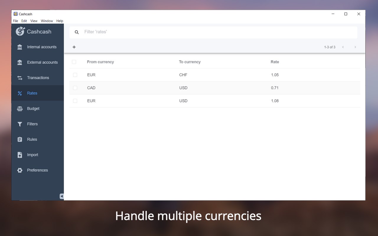 ChartsDouble-entry bookkeepingMulticurrency supportTree structure accountsUnlimited transactionsUnlimited accountsFiltersDatabase import/exportAutomation rulesBulk transactions updateBudgetXLS, XLSX, ODS and CSV import