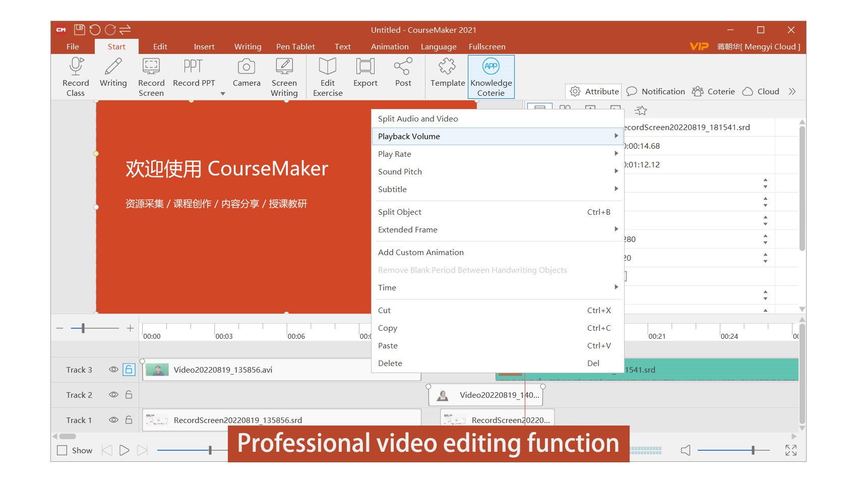 CourseMaker is a video course creation software that integrates recording and editing. Unlike other screen recording software, CourseMaker uses multi-channel recording technology. The recorded courseware, portraits, and voices are independent. Object, the software comes with a quasi-professional-level video editing function. There is no need to import the materials into other video editing software. You can edit them at will in the later stage in CourseMaker.