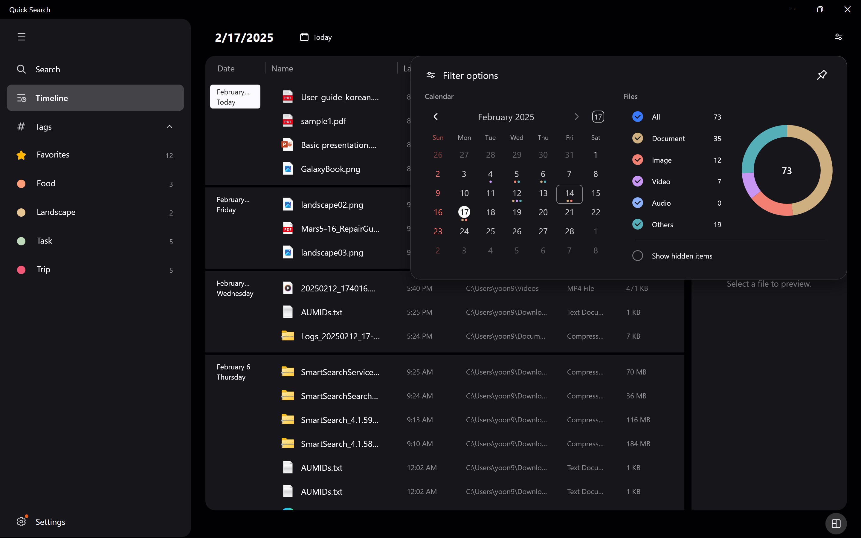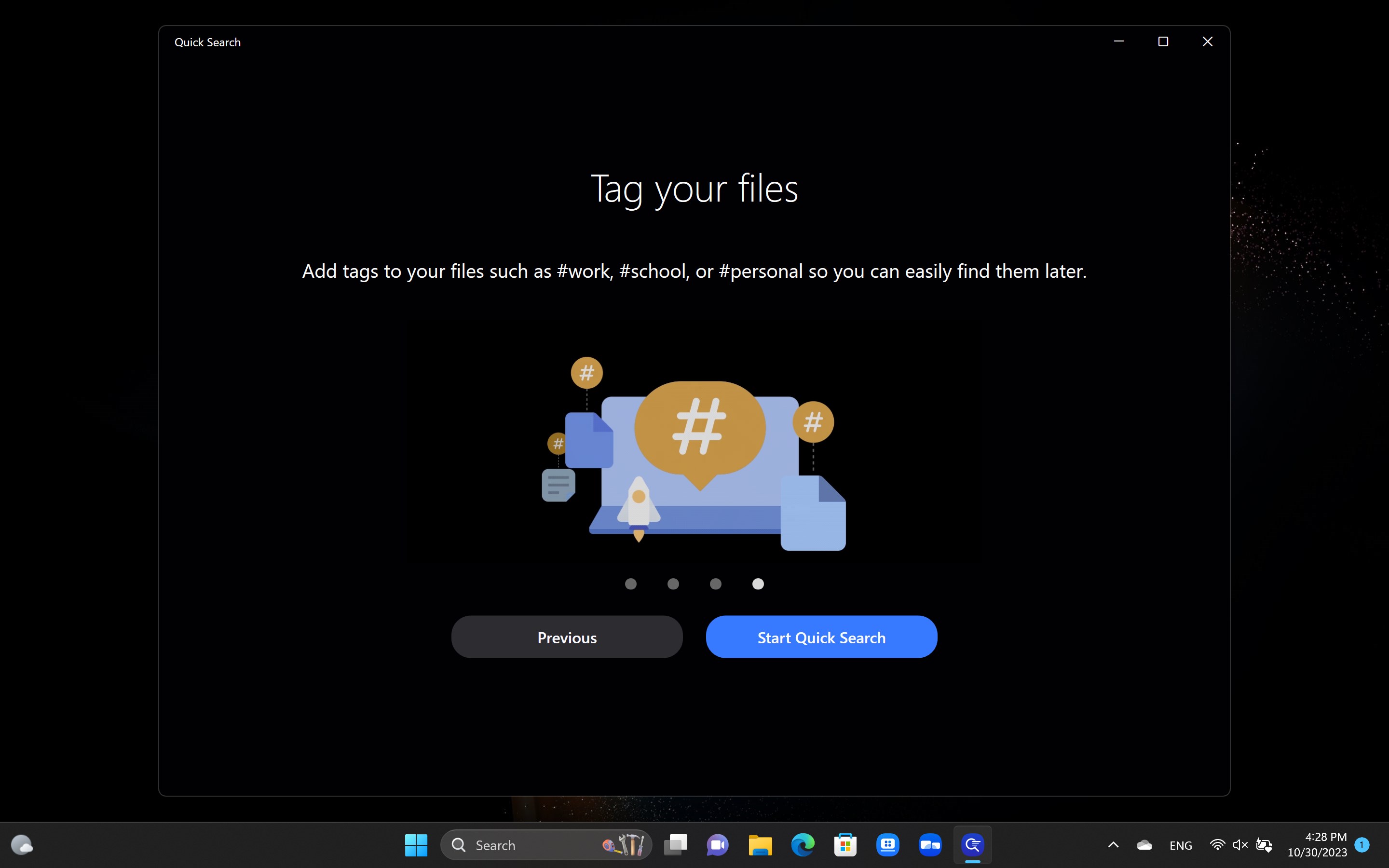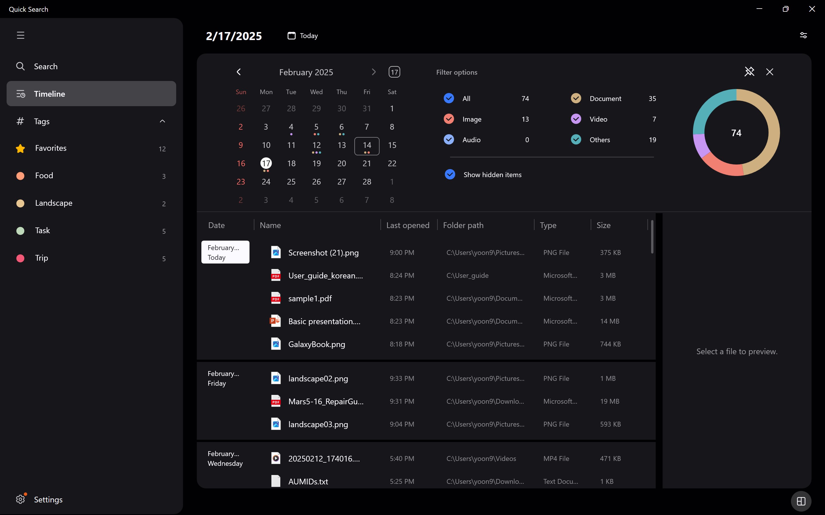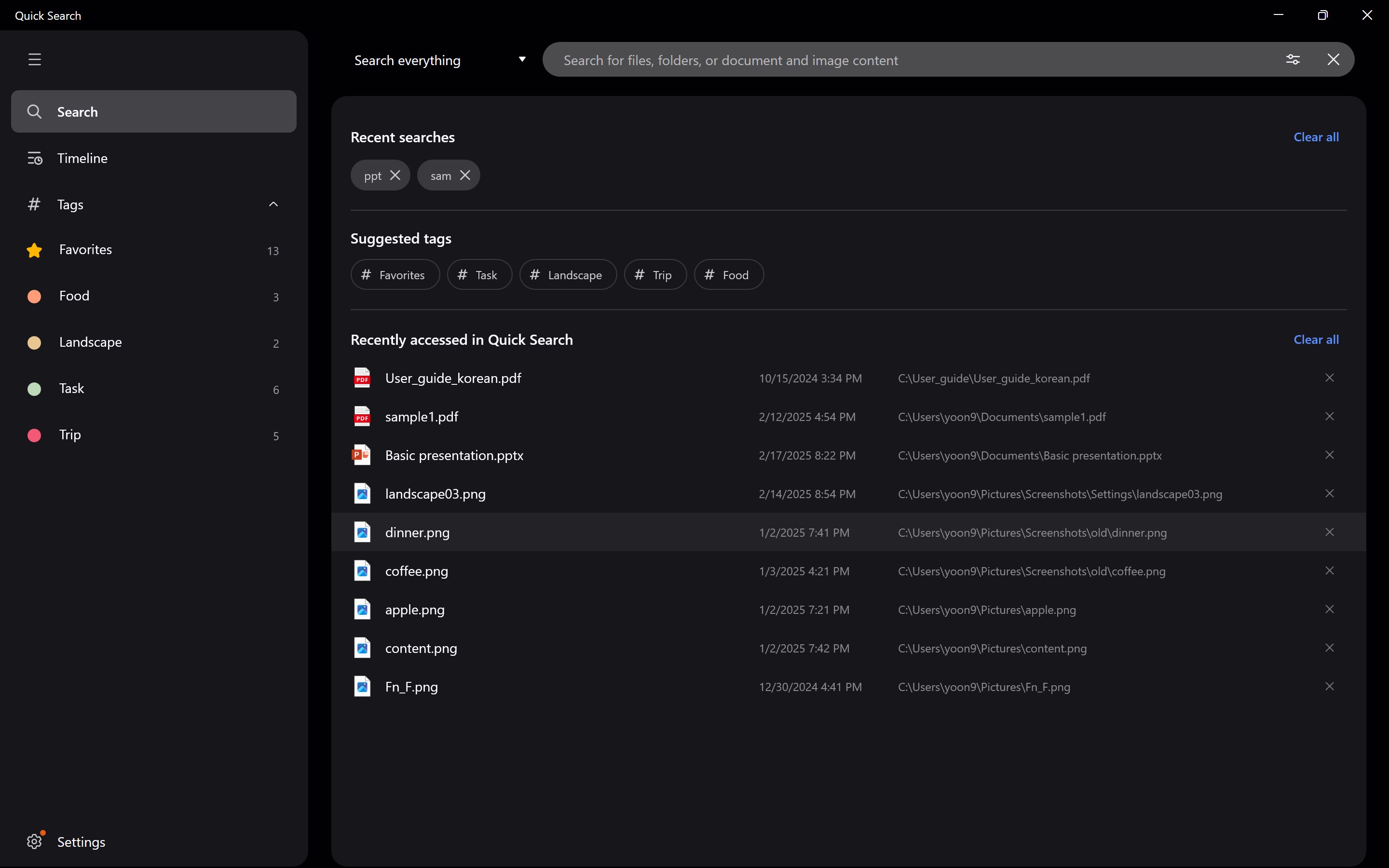 Quick search lets you search inside files, not just file names. Find text in documents, spreadsheets, and images, even if there's a typo. You can also search by the date a file was opened and add tags to your files to make them easier to find.